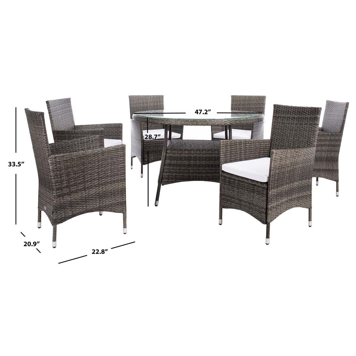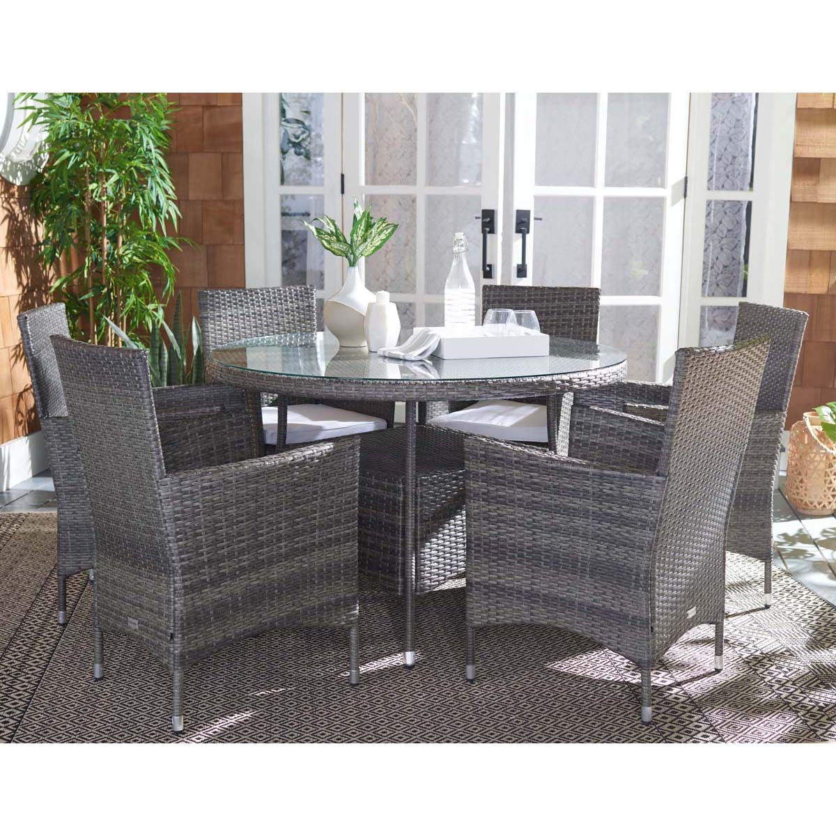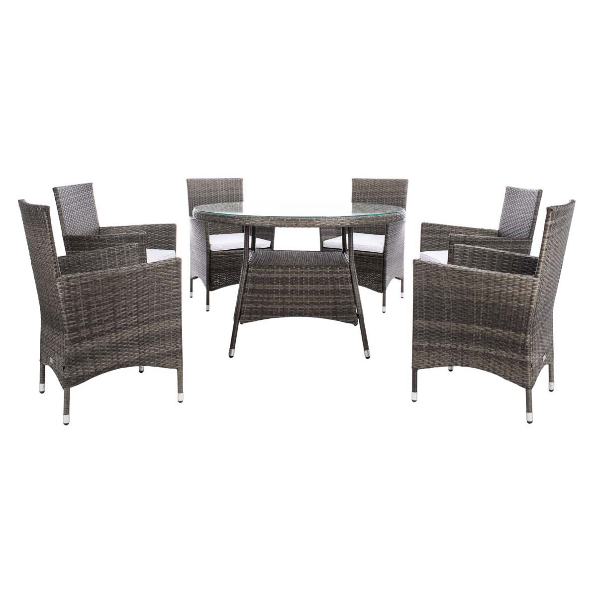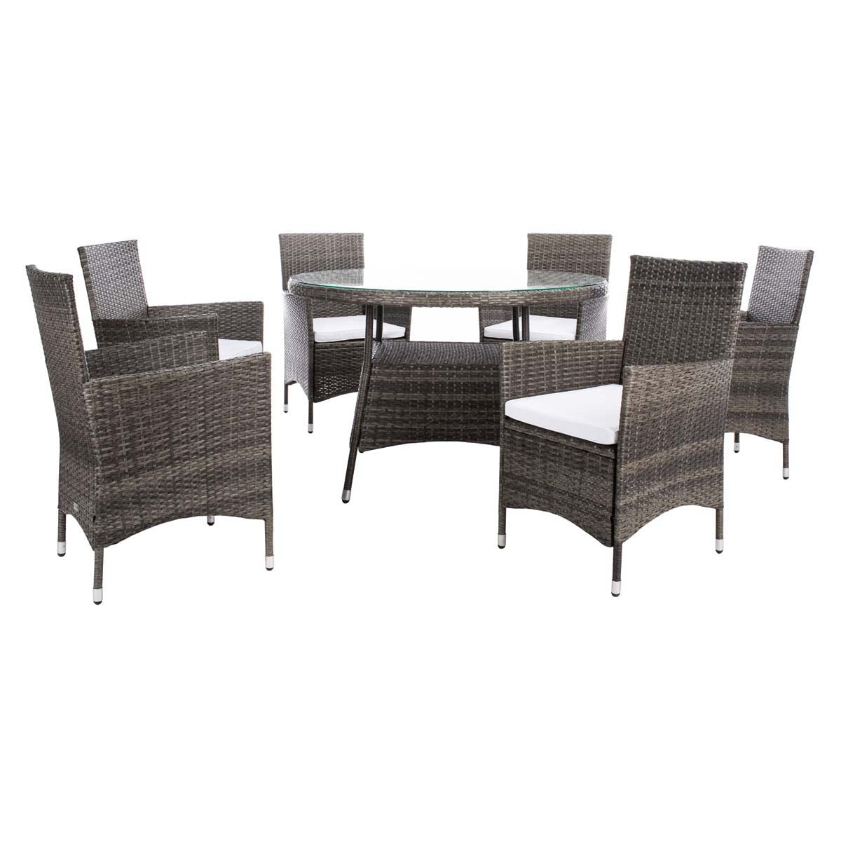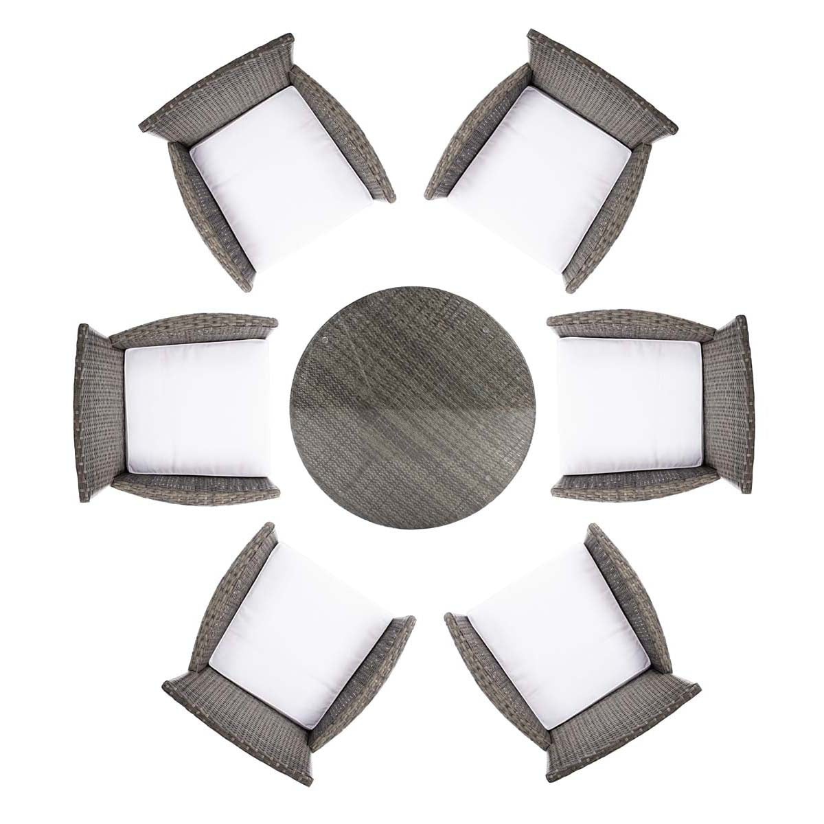 This Challe Dining Set elevates outdoor entertaining with substance and style. Challe?? six ultra modern chairs are given additional depth and intrigue with woven grey brown wicker, pairing perfectly with its round glass topped dining table. Soft white se