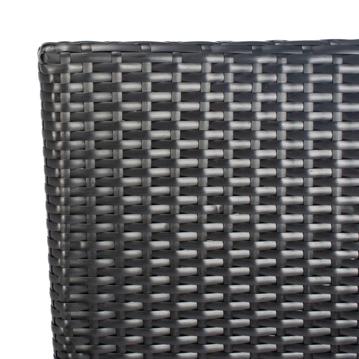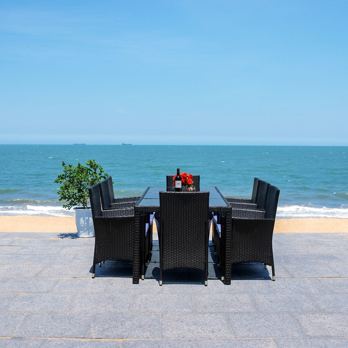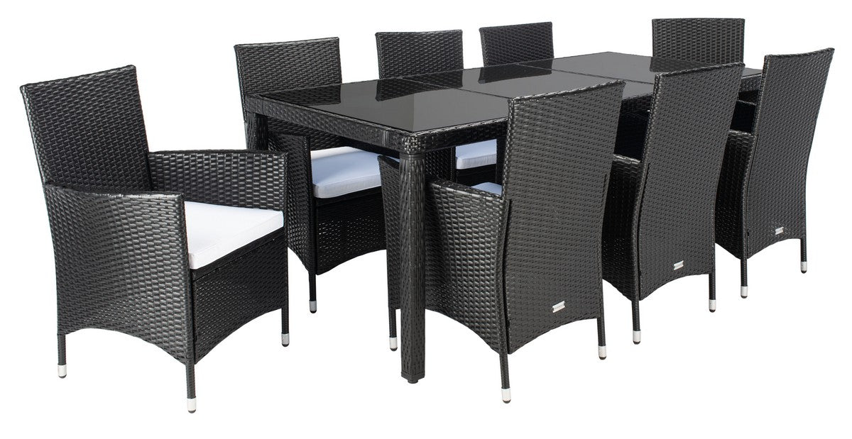 Give outdoor entertaining a contemporary chic upgrade with this Hailee Dining Set. Black wicker details highlight the eye catching silhouettes of Hailee?? eight dining chairs, and its glass topped dining table ensures hours of delightful conversation for