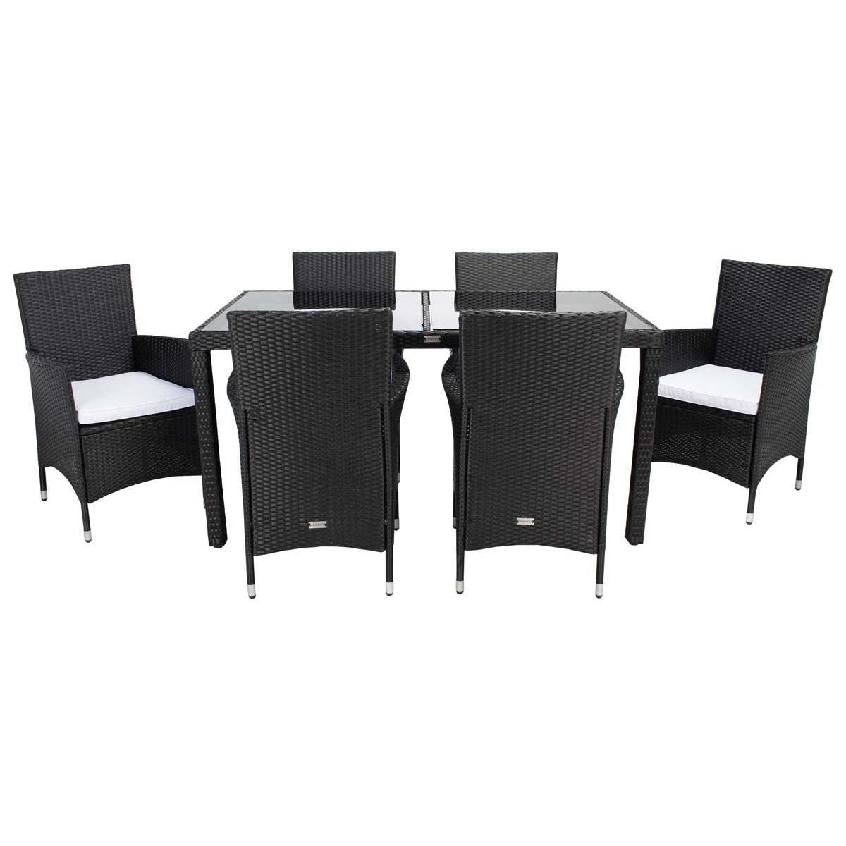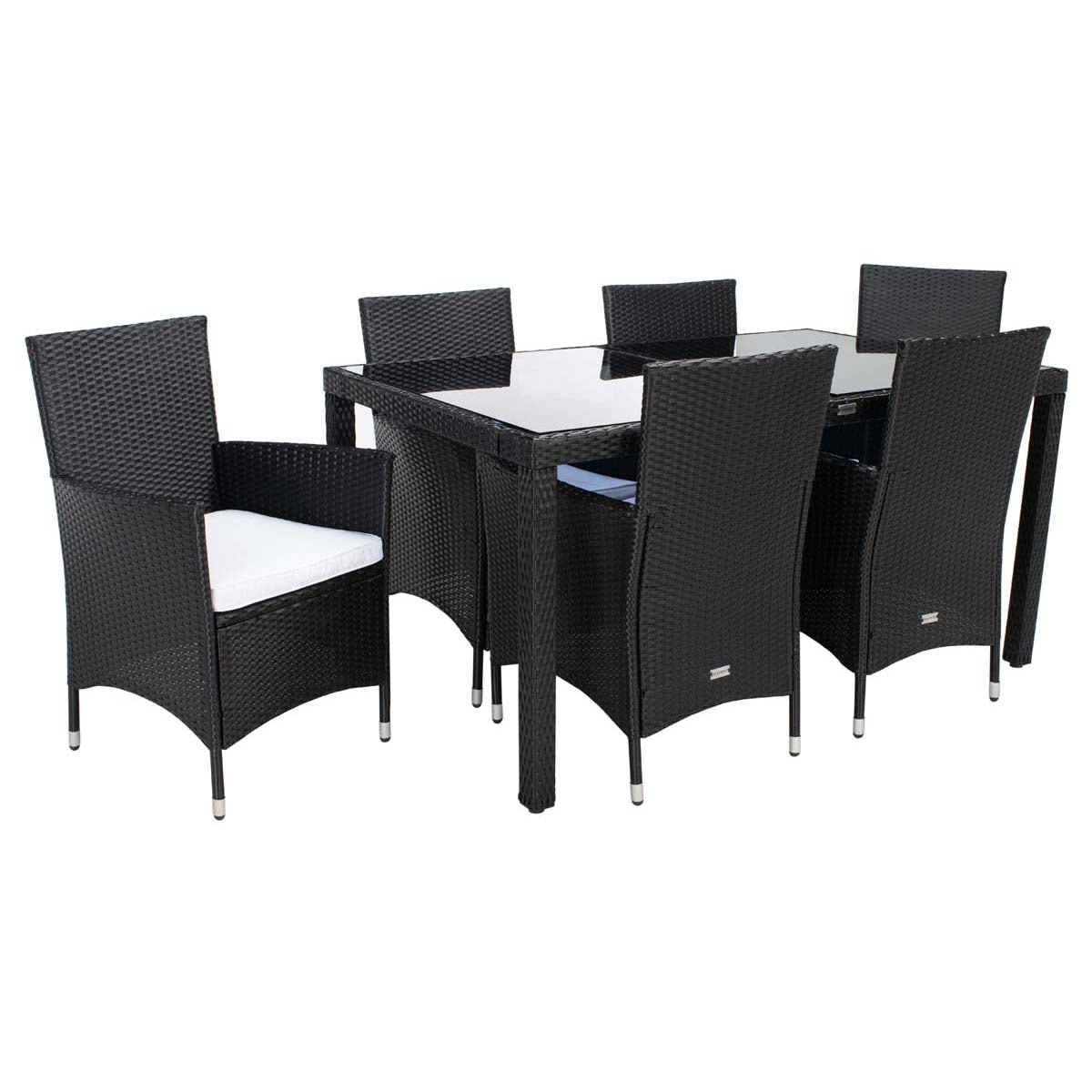 Outdoor entertaining gets a contemporary chic upgrade in this Jolin 7 Piece Dining Set. Black wicker details highlight the eye catching silhouettes of Jolin?? six dining chairs, and plush white cushions will keep you and your guests around the glass toppe
