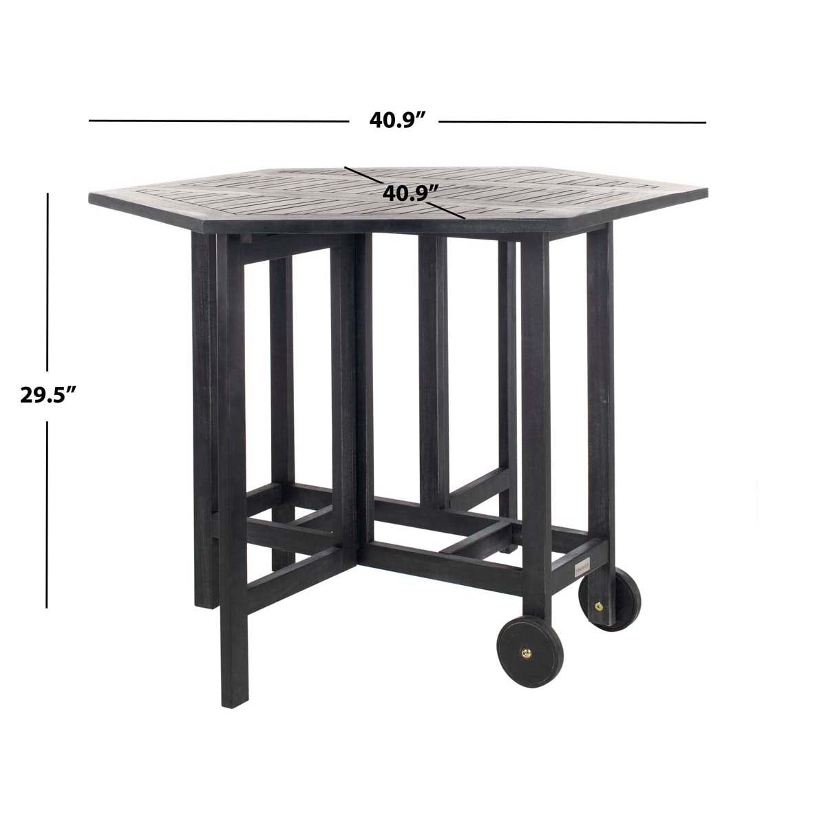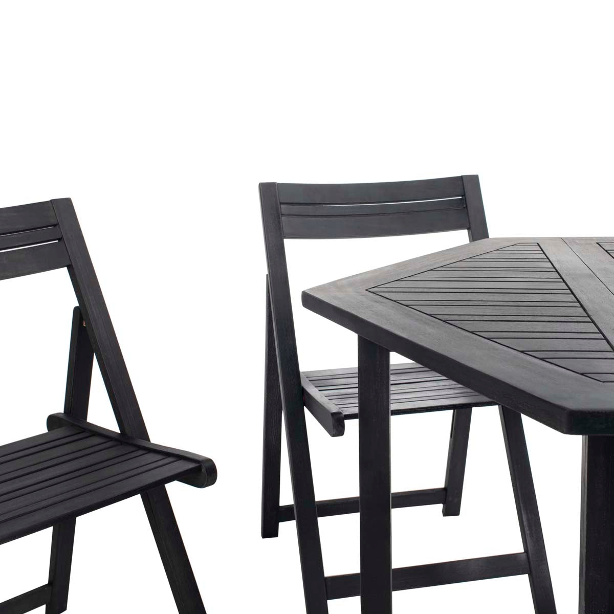 Stack the odds for carefree outdoor living in your favor with the ingenious Kerman dining table and chair set. Crafted of eco friendly black acacia wood, 4 director style chairs fold and tuck under a foldable hexagonal table for easy storage.