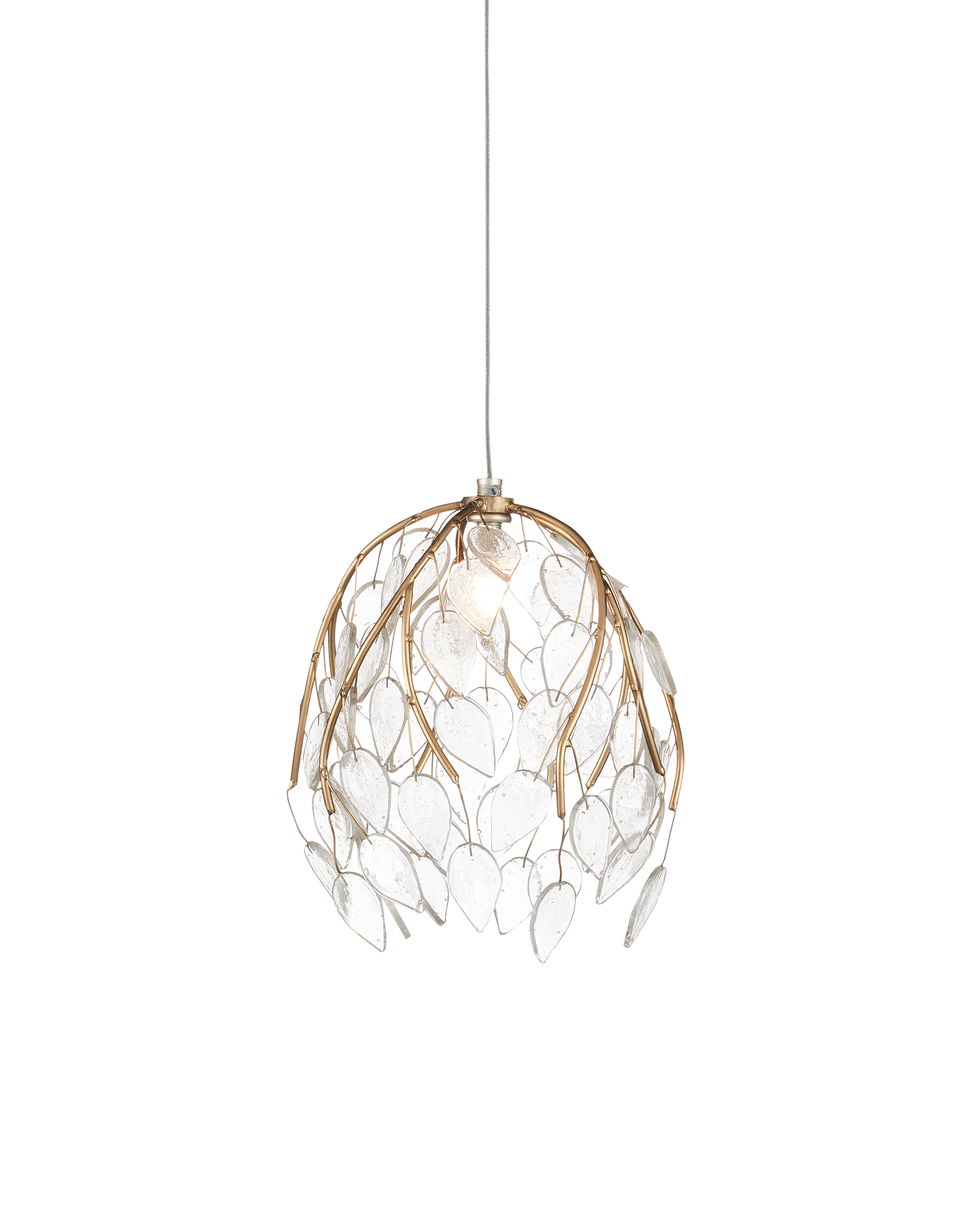The Currey & Company Banyan 1-Light Round Multi-Drop Pendant has a shade like a gold twisting branch form that holds clear glass leaves.