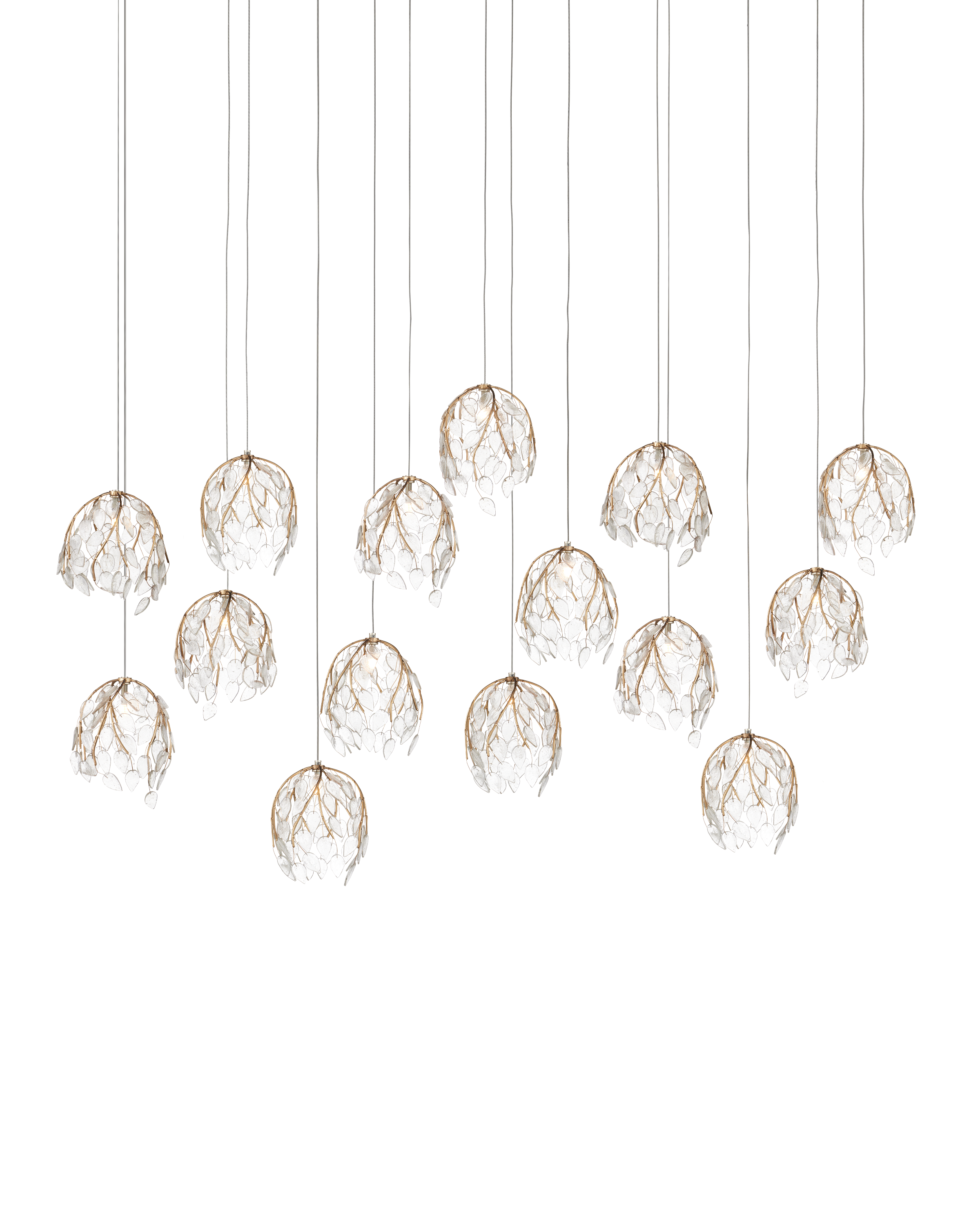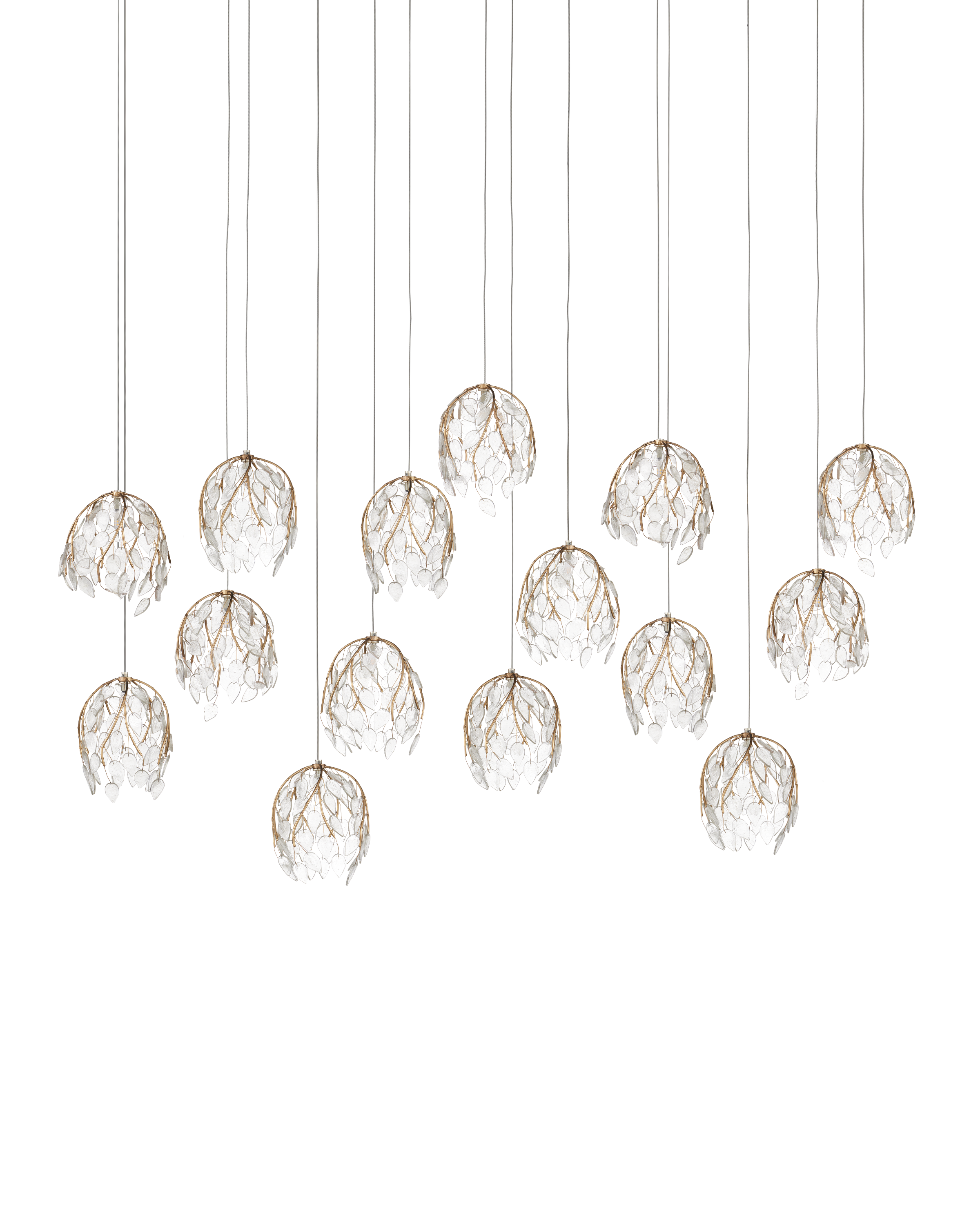 The Currey & Company Banyan 15-Light Linear Multi-Drop Pendant has shades like gold twisting branch forms that holds clear glass leaves.