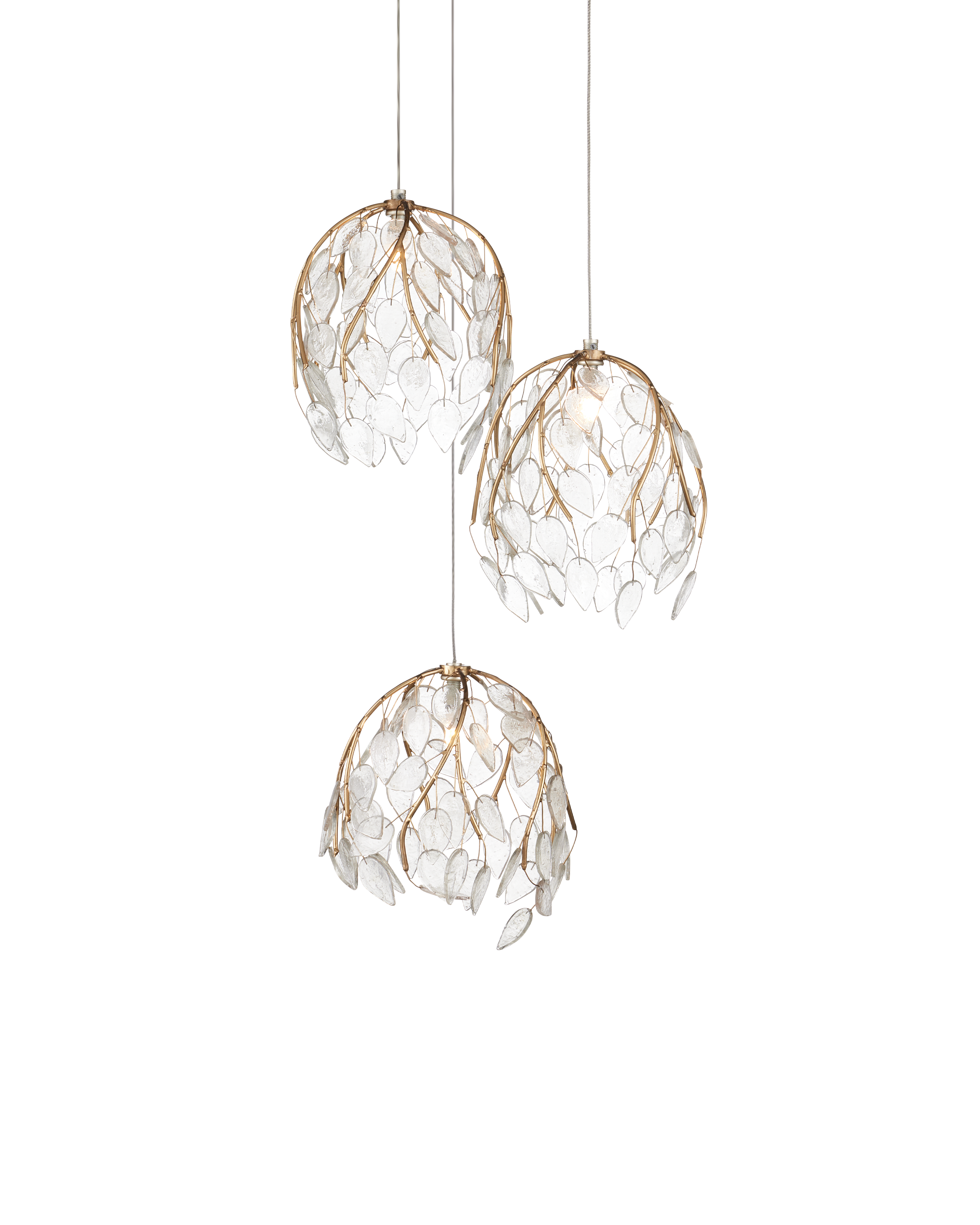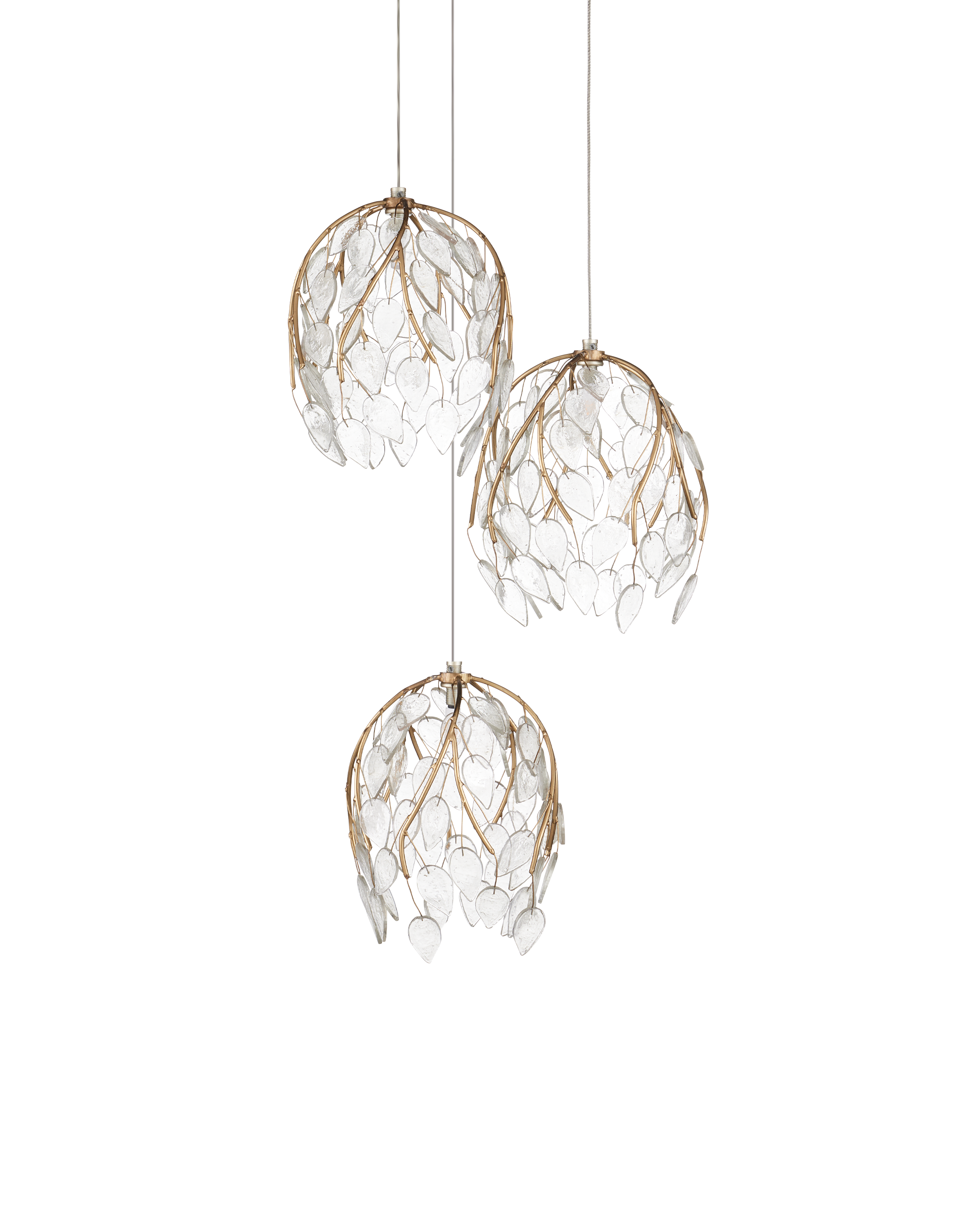 The Currey & Company Banyan 3-Light Round Multi-Drop Pendant has shades like gold twisting branch forms that holds clear glass leaves.