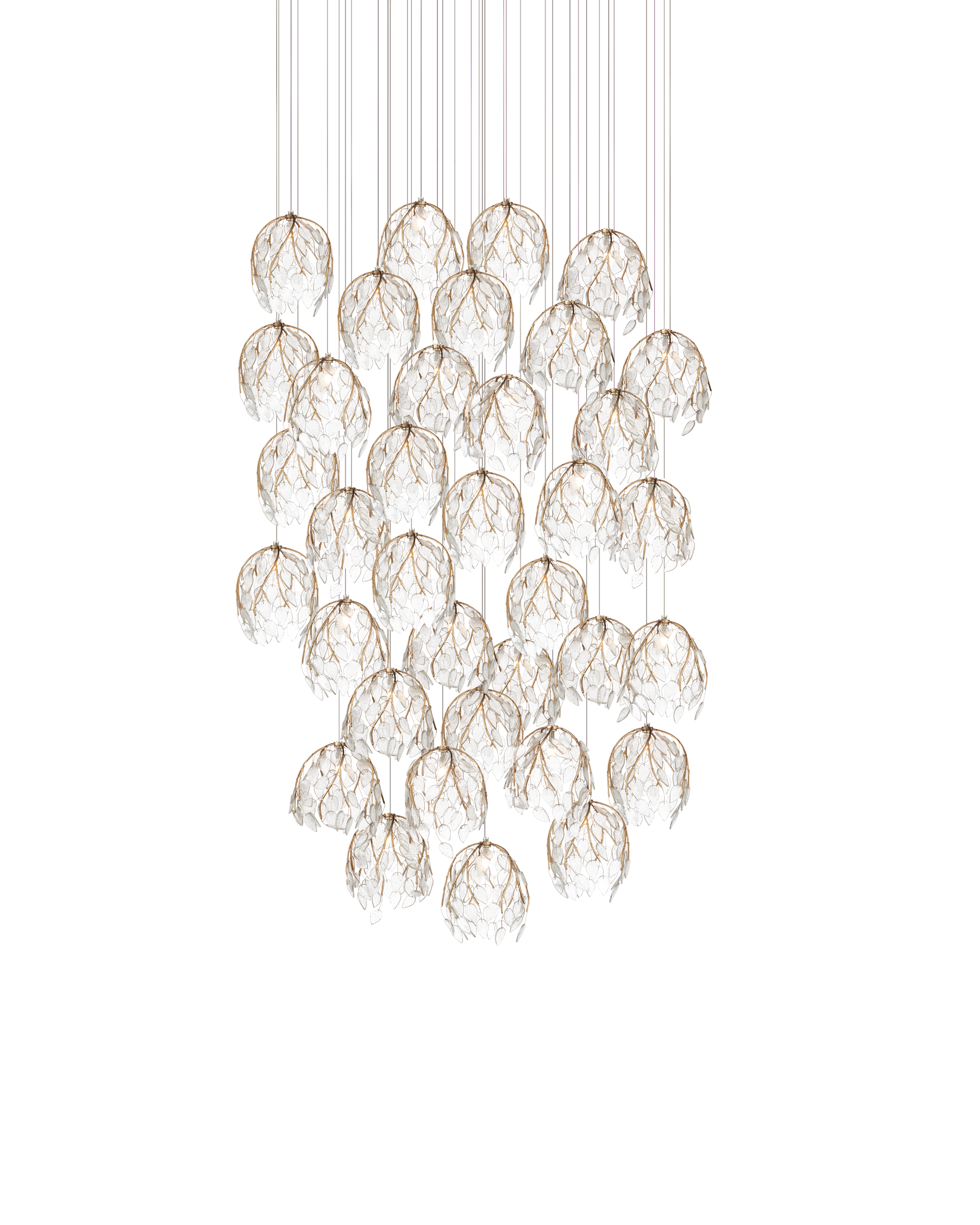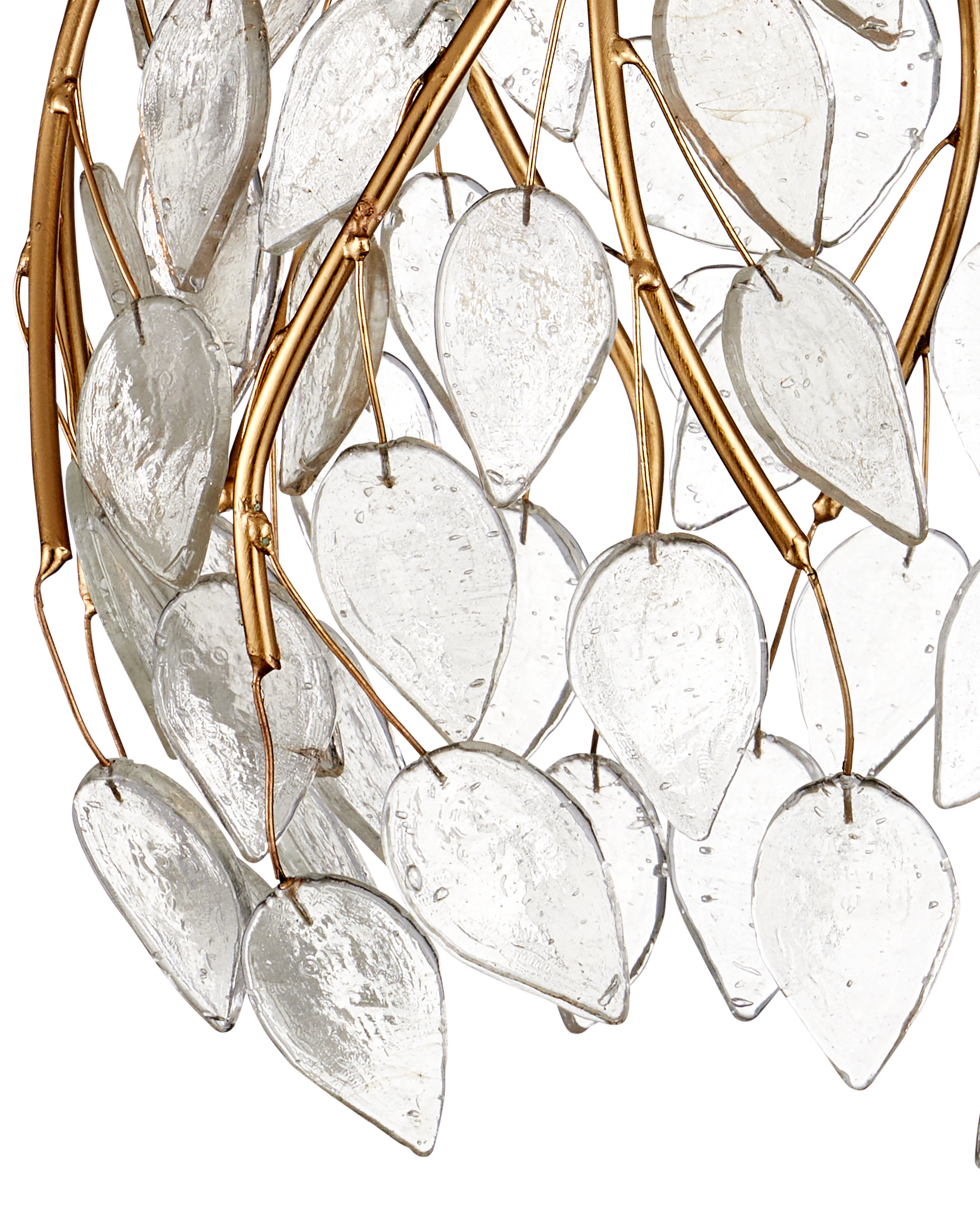 The Currey & Company Banyan 36-Light Round Multi-Drop Pendant has shades like gold twisting branch forms that holds clear glass leaves.