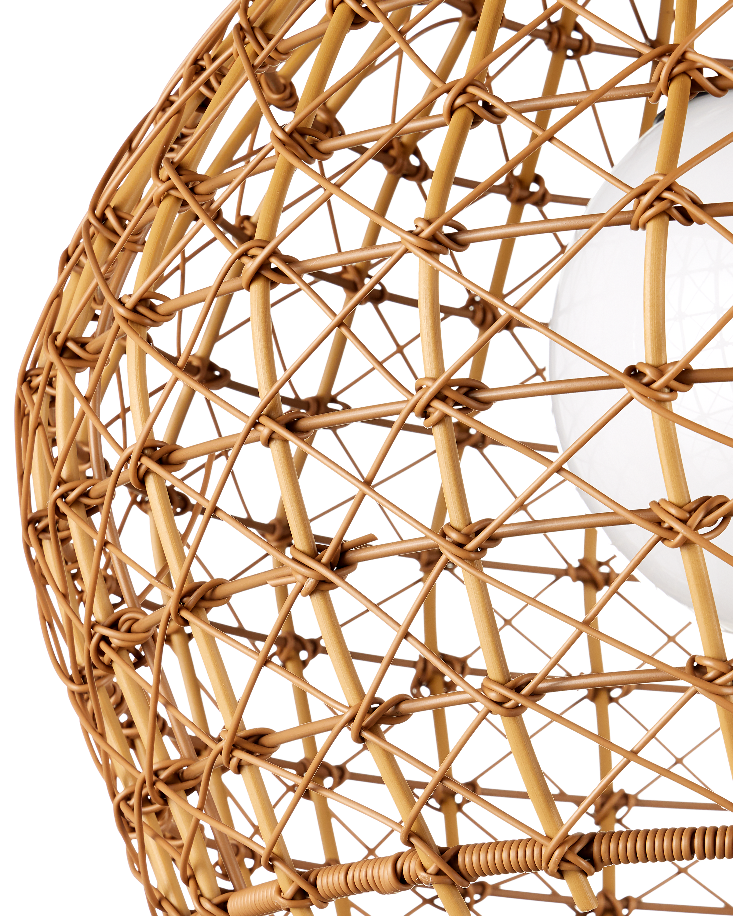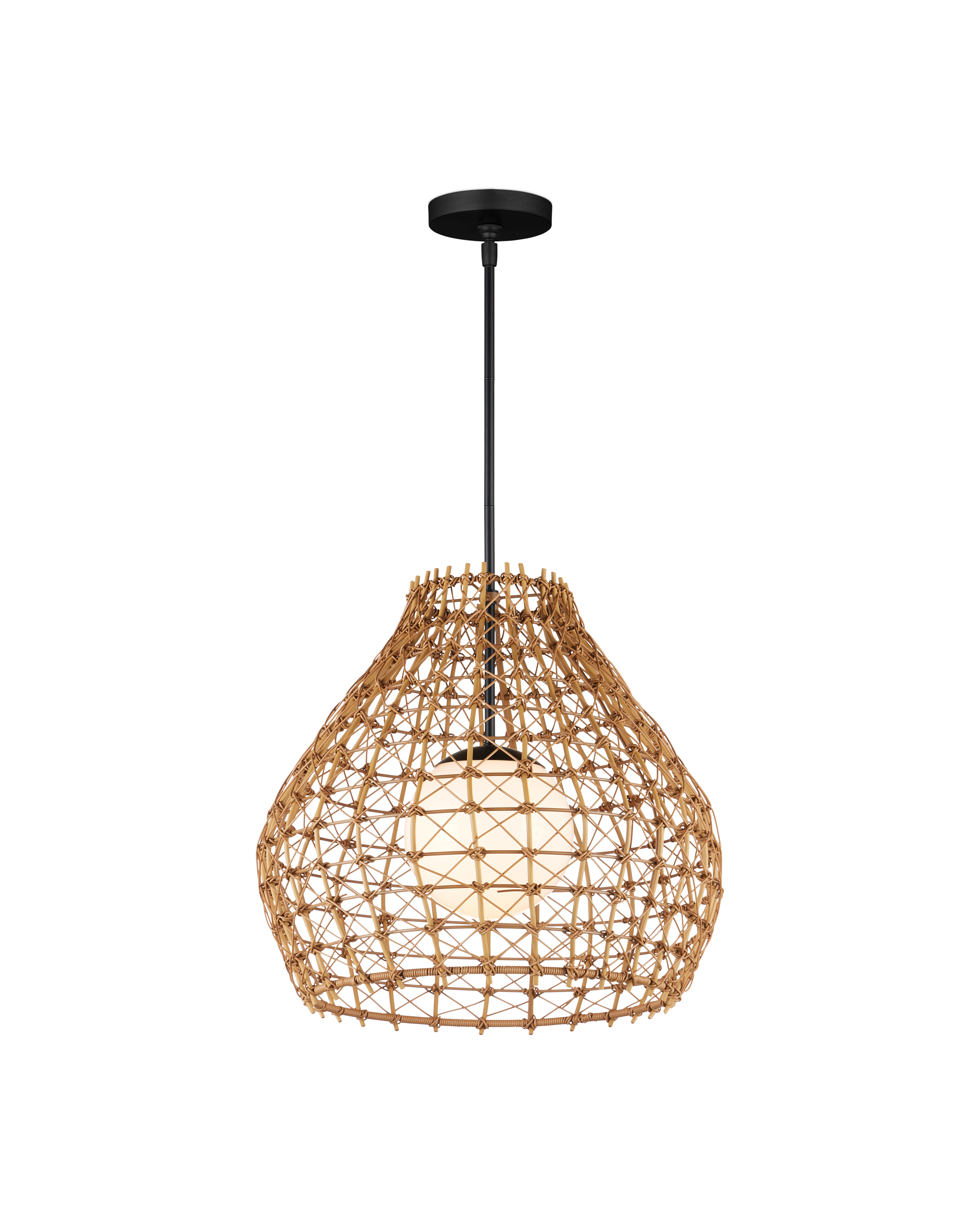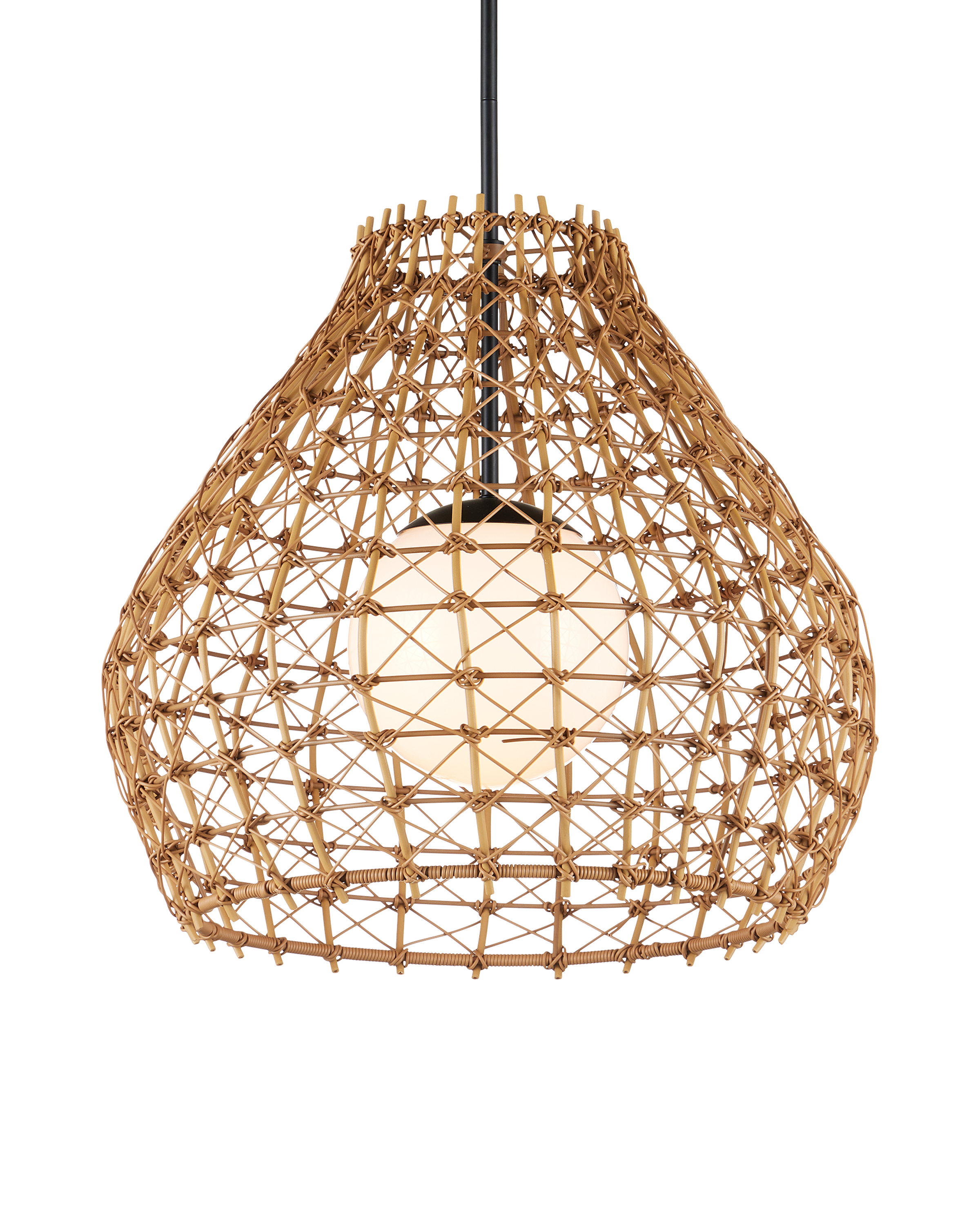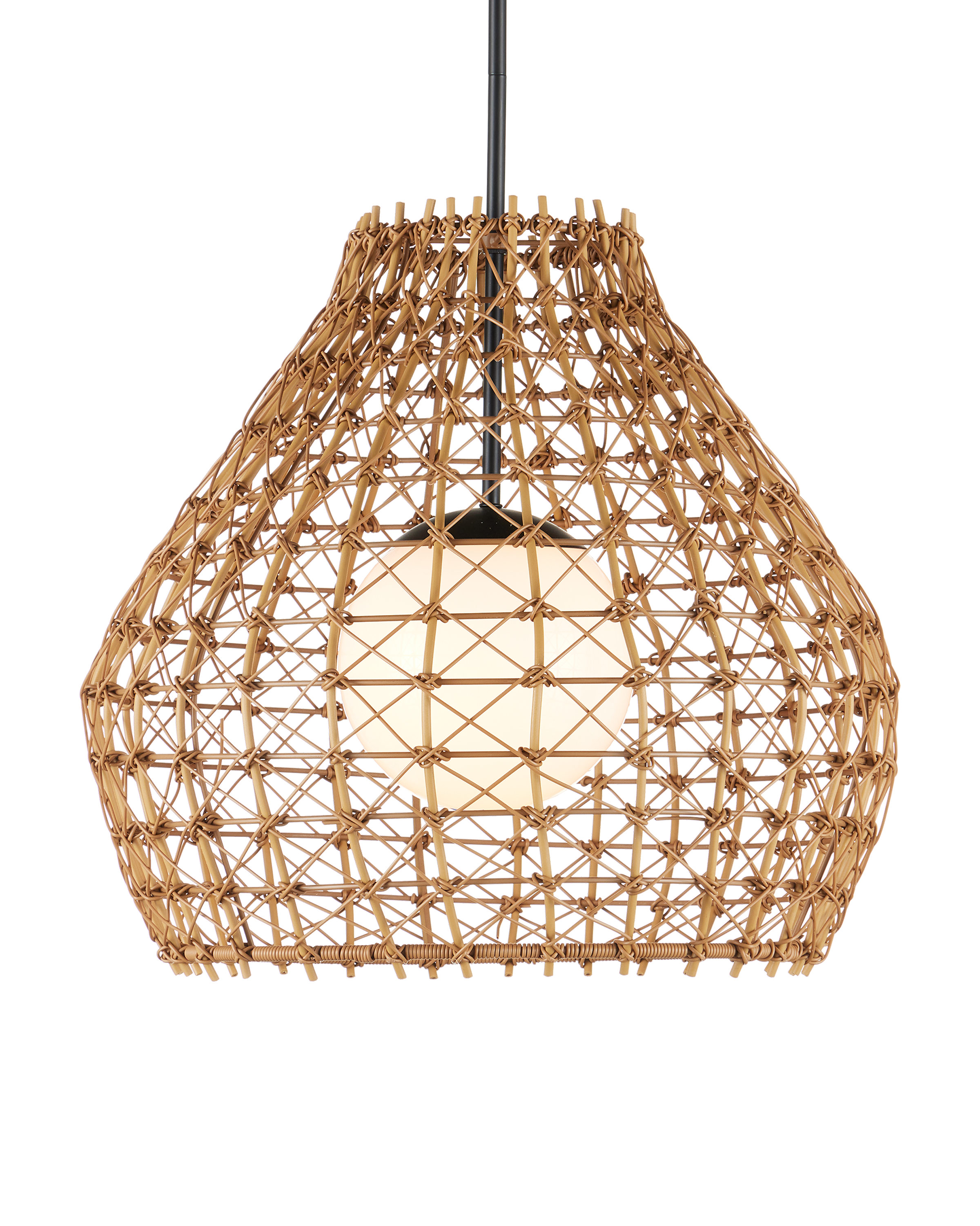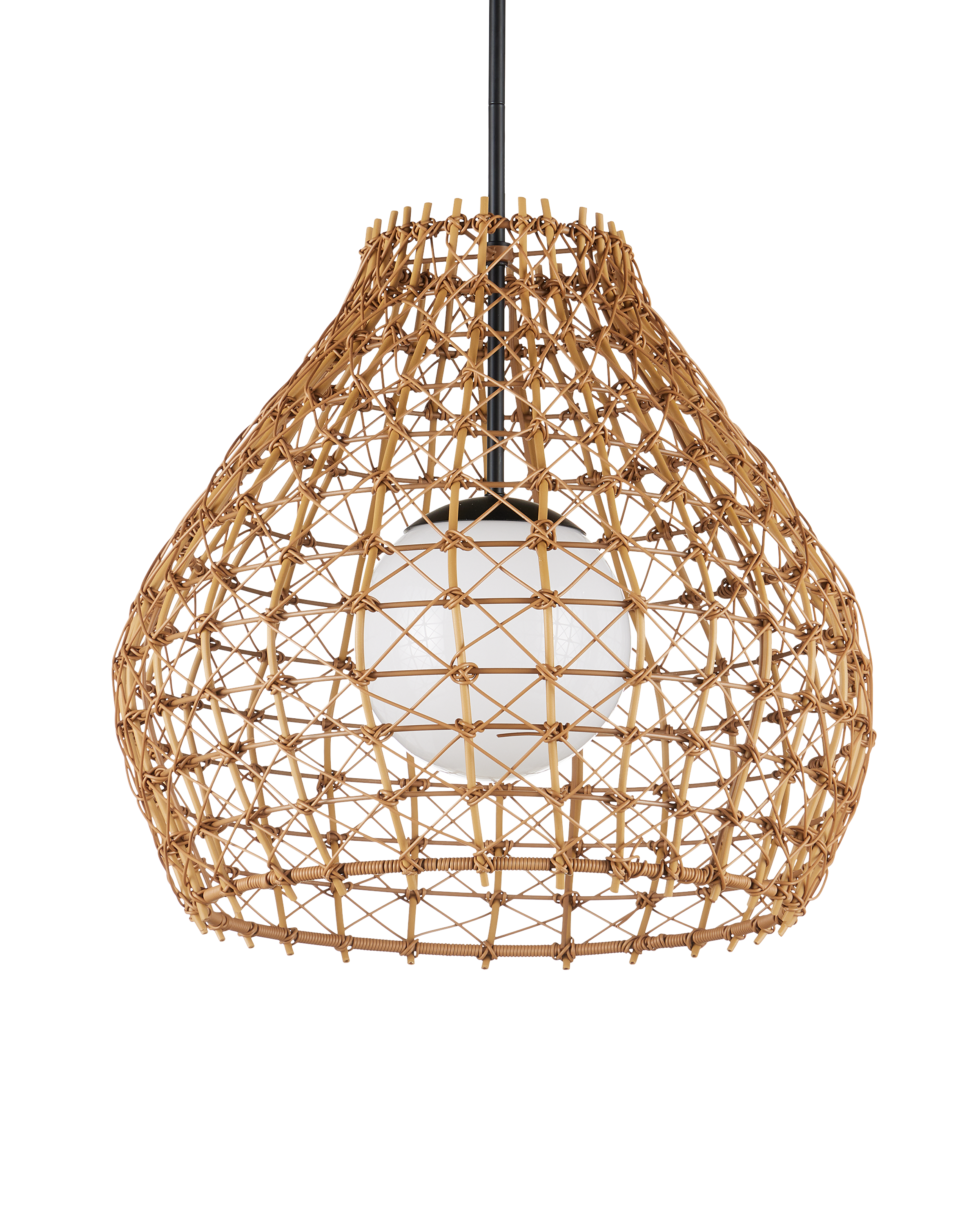 The Bly Outdoor Pendant brings artisanal charm to exterior spaces with its eye-catching crisscross pattern, meticulously woven from all-weather synthetic wicker. The large-scale design offers a handcrafted look, while the intricate weave adds depth and texture that feels both refined and relaxed. A black powder-coated metal frame ensures durability and contrast and the pendant is wet-location tested. Adjustable from 25" to 66.5" with use of included chain/rod kit/cable. If your space calls for a longer drop, additional chain/rods/cable is available for purchase.