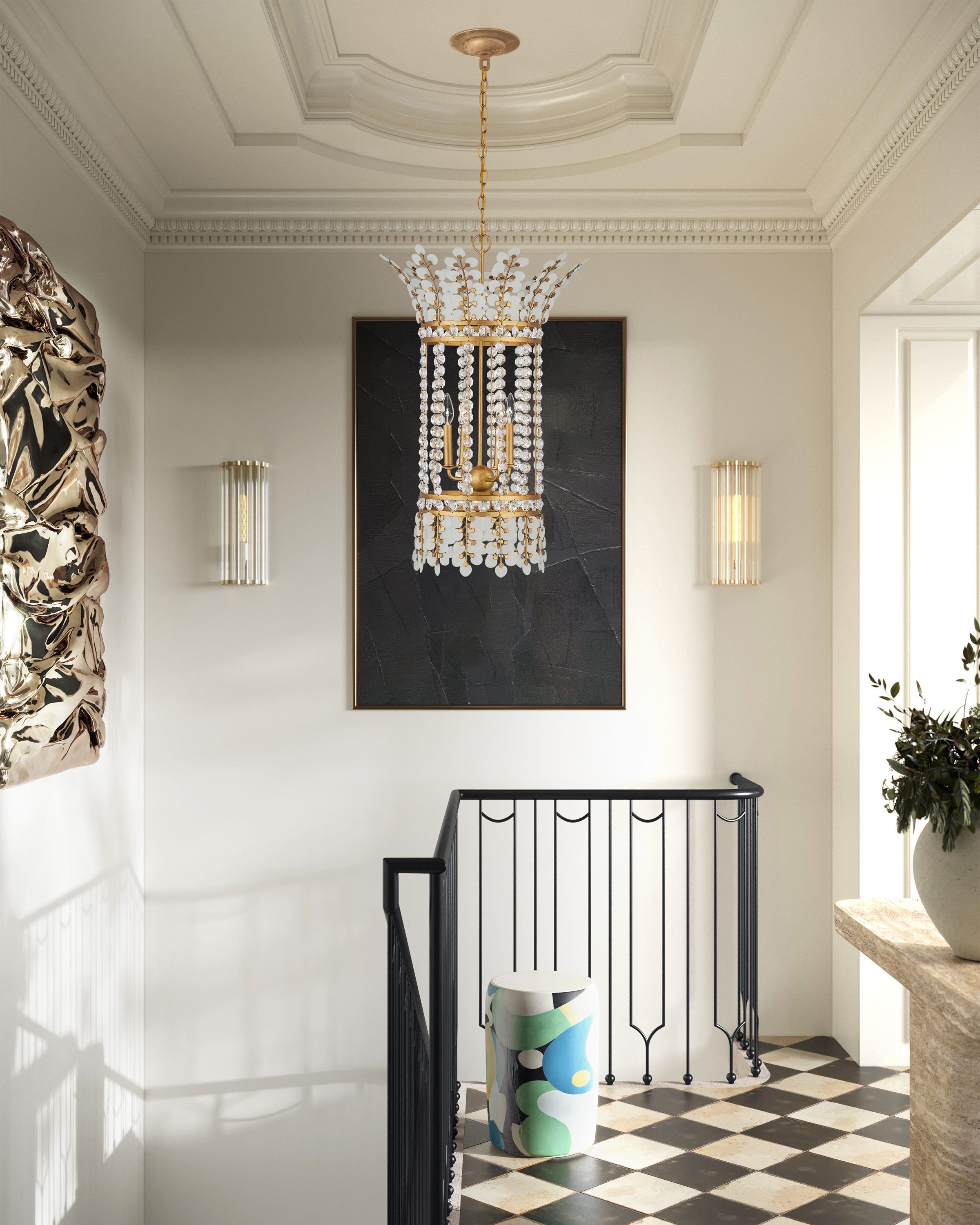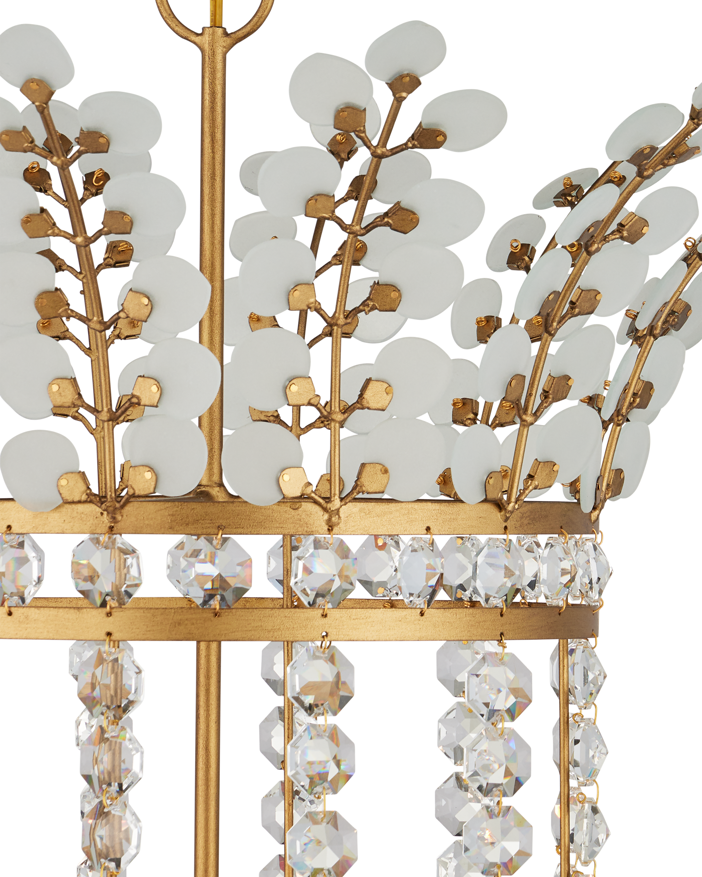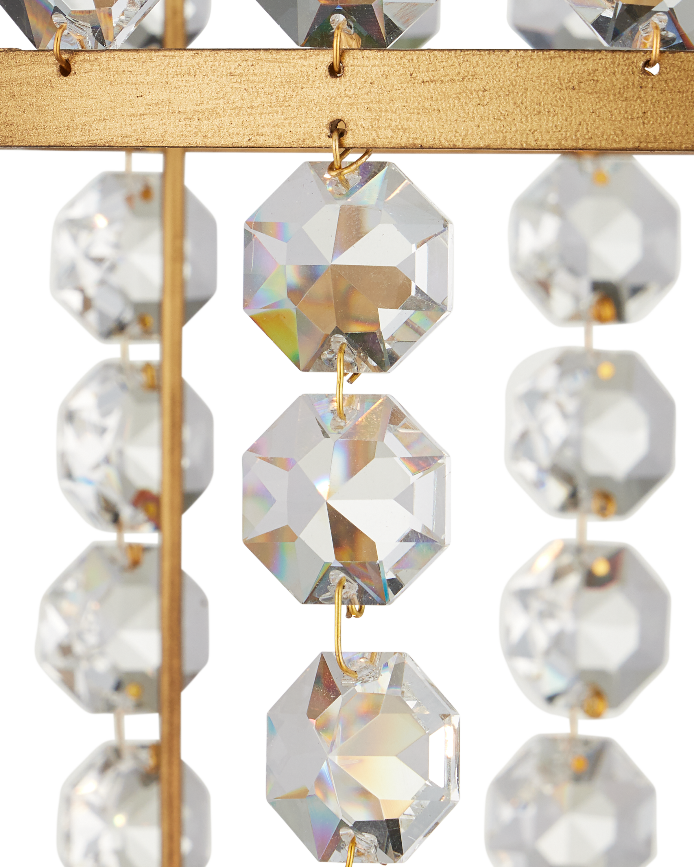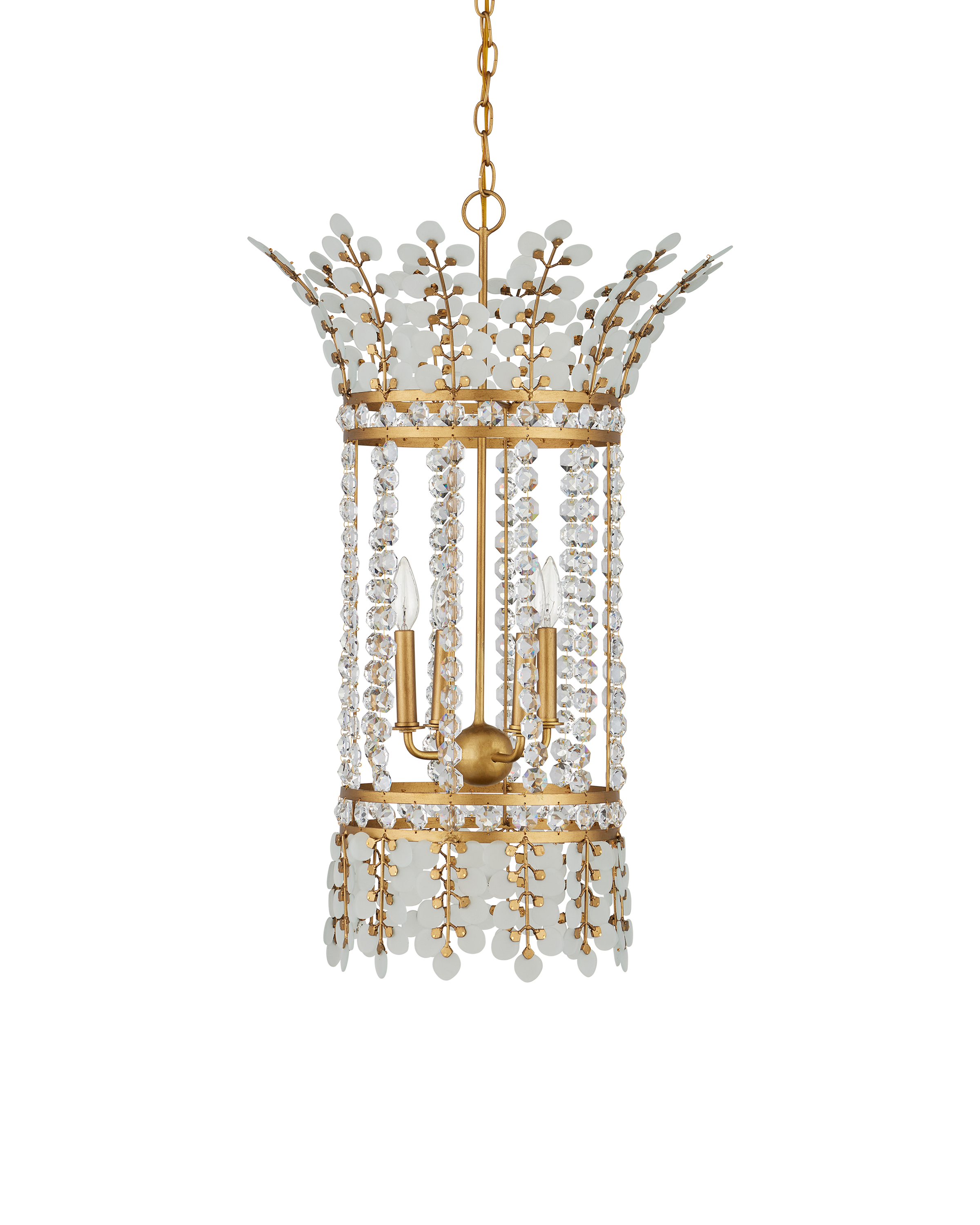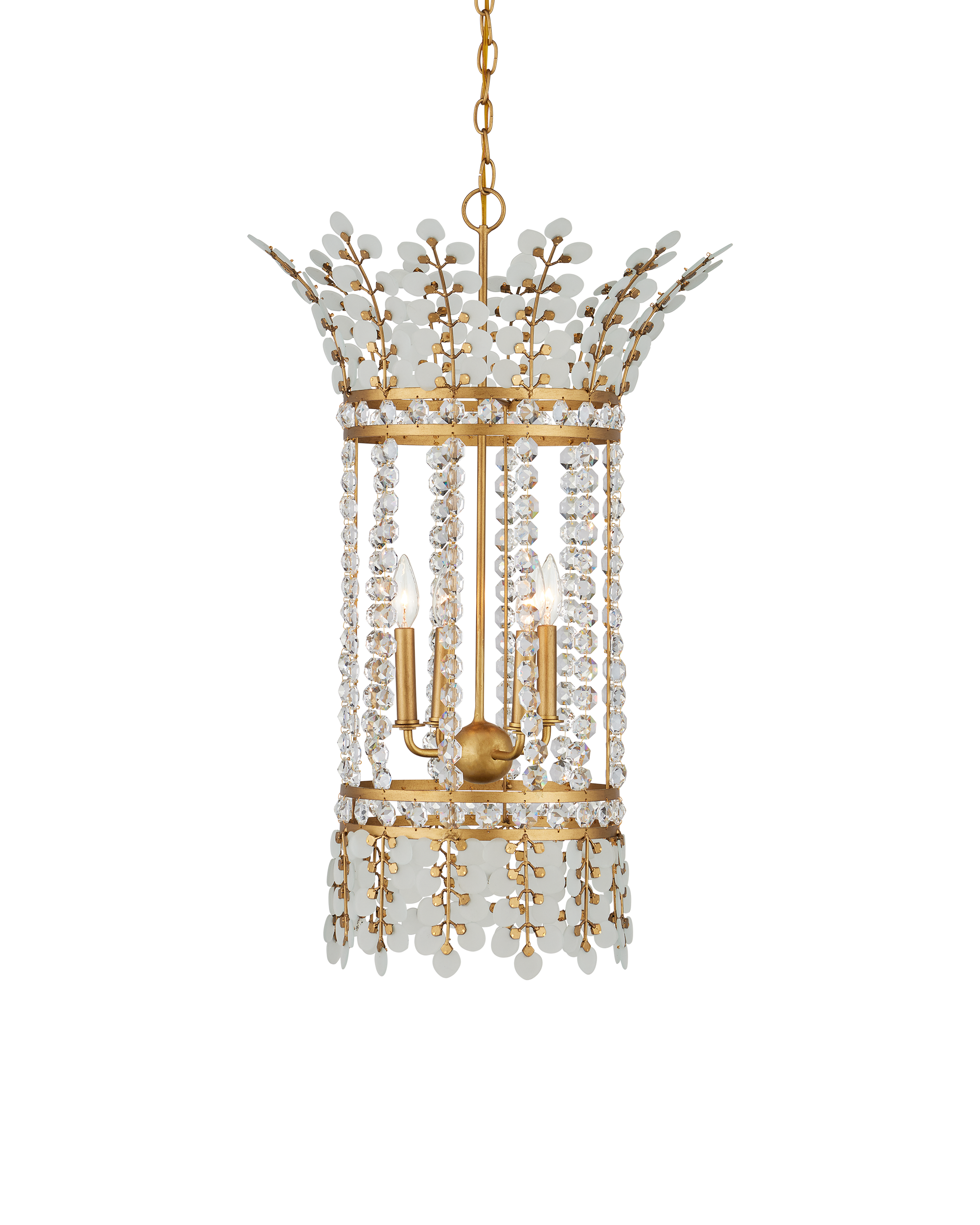 Designed by Bunny Williams, the Bradshaw Pendant showcases an elegant, classical silhouette with refined Art Deco inspiration. Crafted from wrought iron in a warm brass finish, its columnar frame is accented by bands of sparkling crystal baguettes at the center. Frosted glass discs add sculptural interest, flaring upward and downward in delicate flourishes—the topmost shaped like a coronet. This four-light pendant blends historical reference with modern elegance, resulting in a luminous focal point with timeless appeal. Adjustable from 39.5" to 107.5" with use of included chain/rod kit/cable. If your space calls for a longer drop, additional chain/rods/cable is available for purchase.