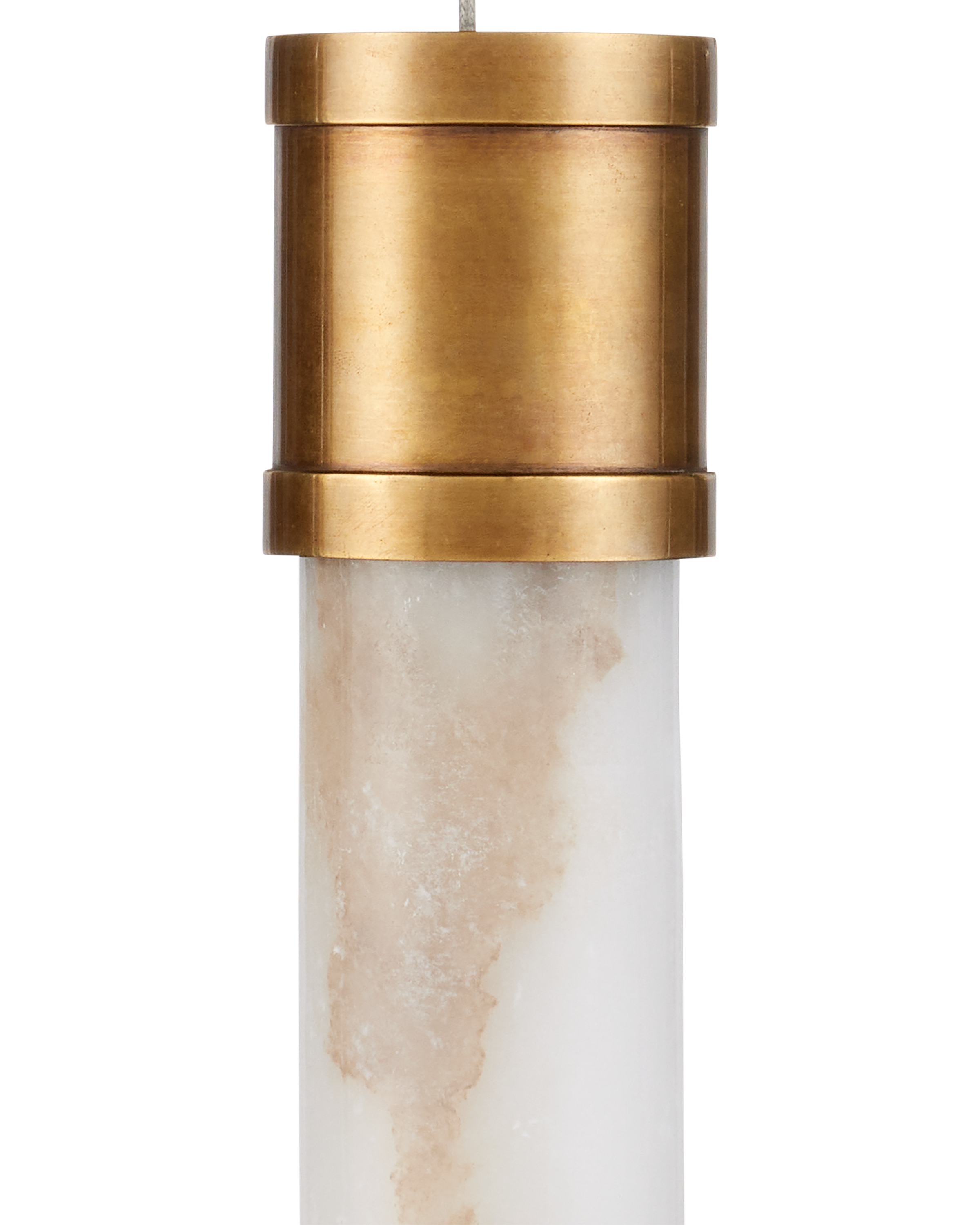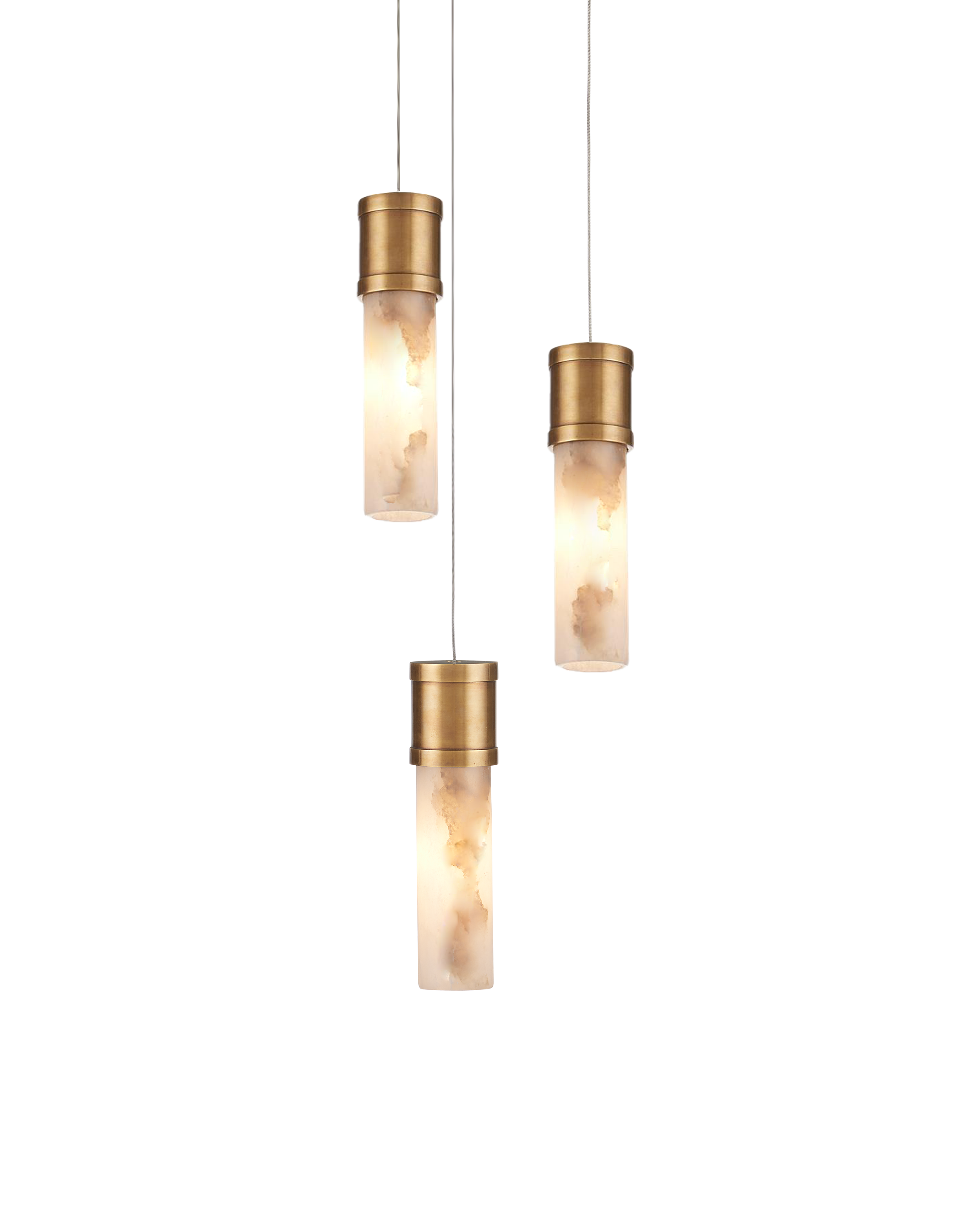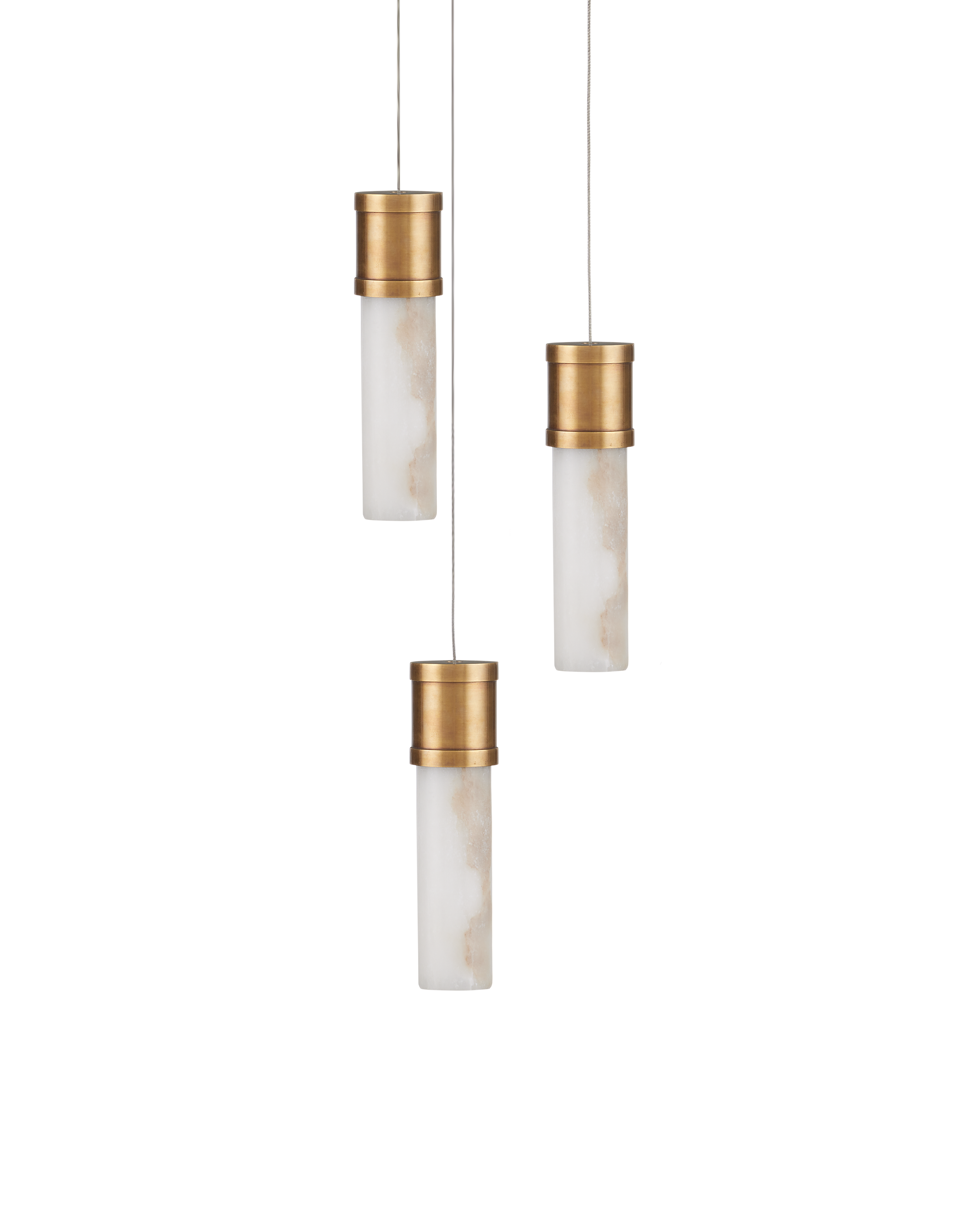 The Currey & Company Cannula 3-Light Round Multi-Drop Pendant has shades made of gold fittings that hold alabaster tubes.