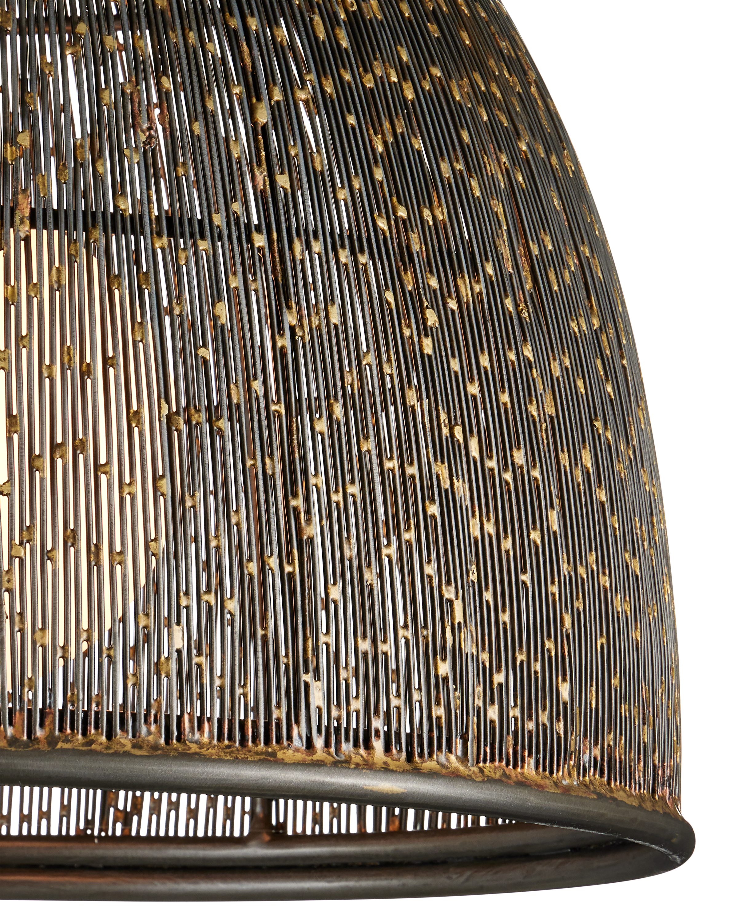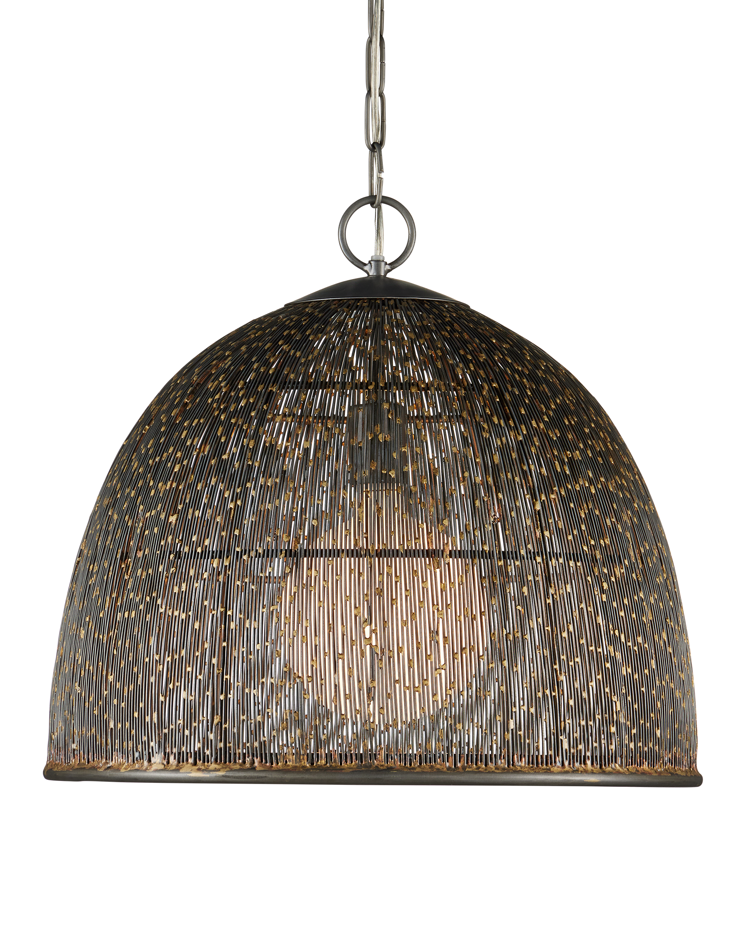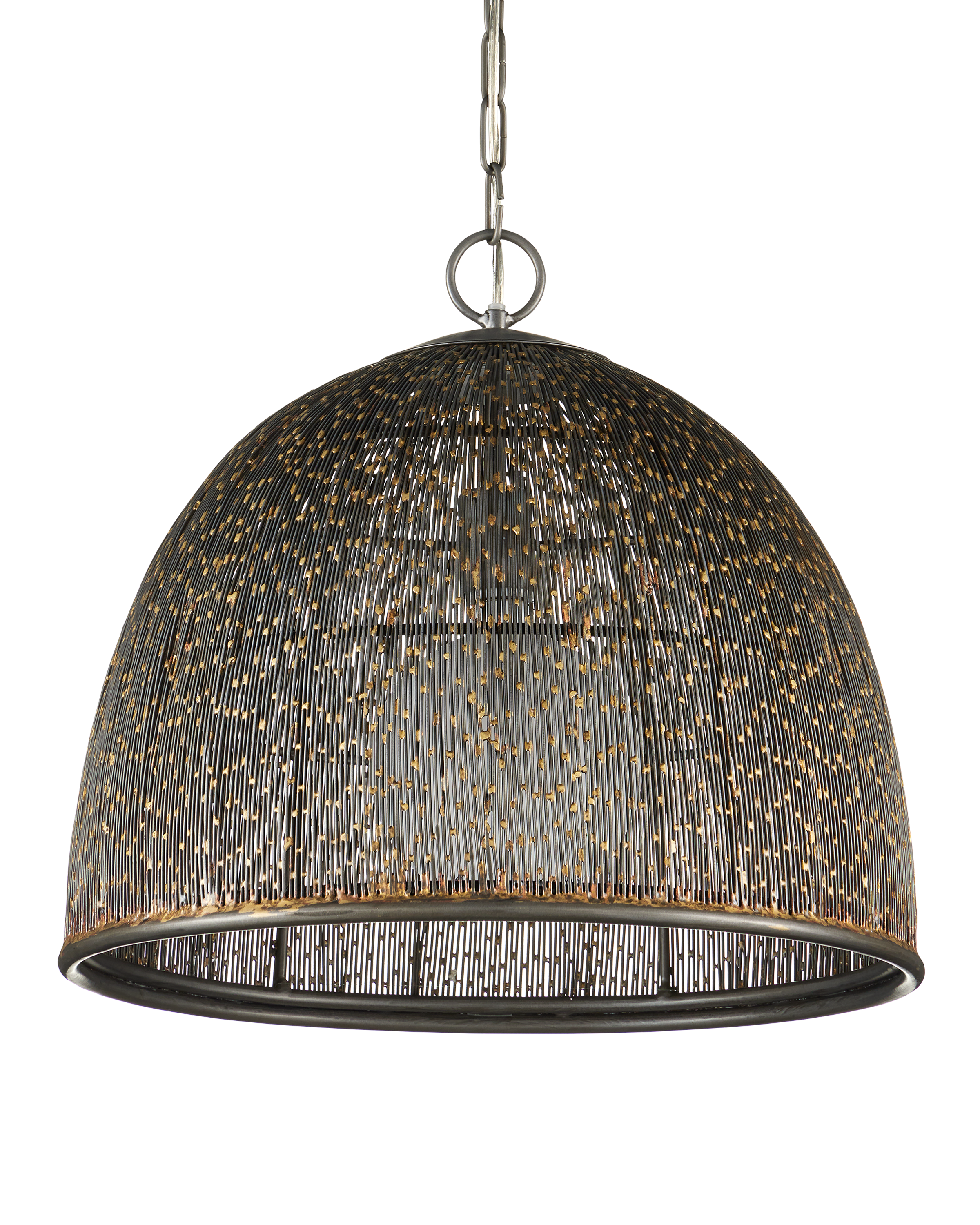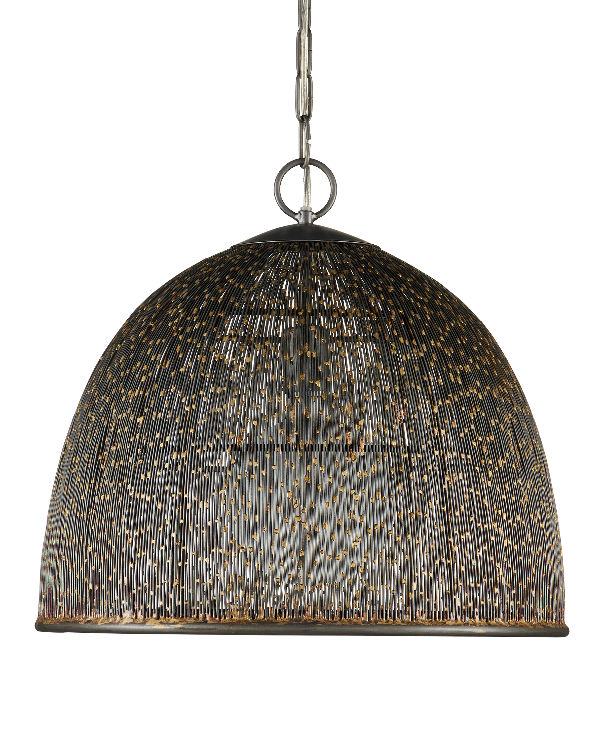 The Currey & Company Eduardo Pendant is made of strands of thin iron wires that create a pebbly pattern on the surface of its dome shape. Adjustable from 25.25" to 92.25" with use of included chain/rod kit/cable. If your space calls for a longer drop, additional chain/rods/cable is available for purchase.