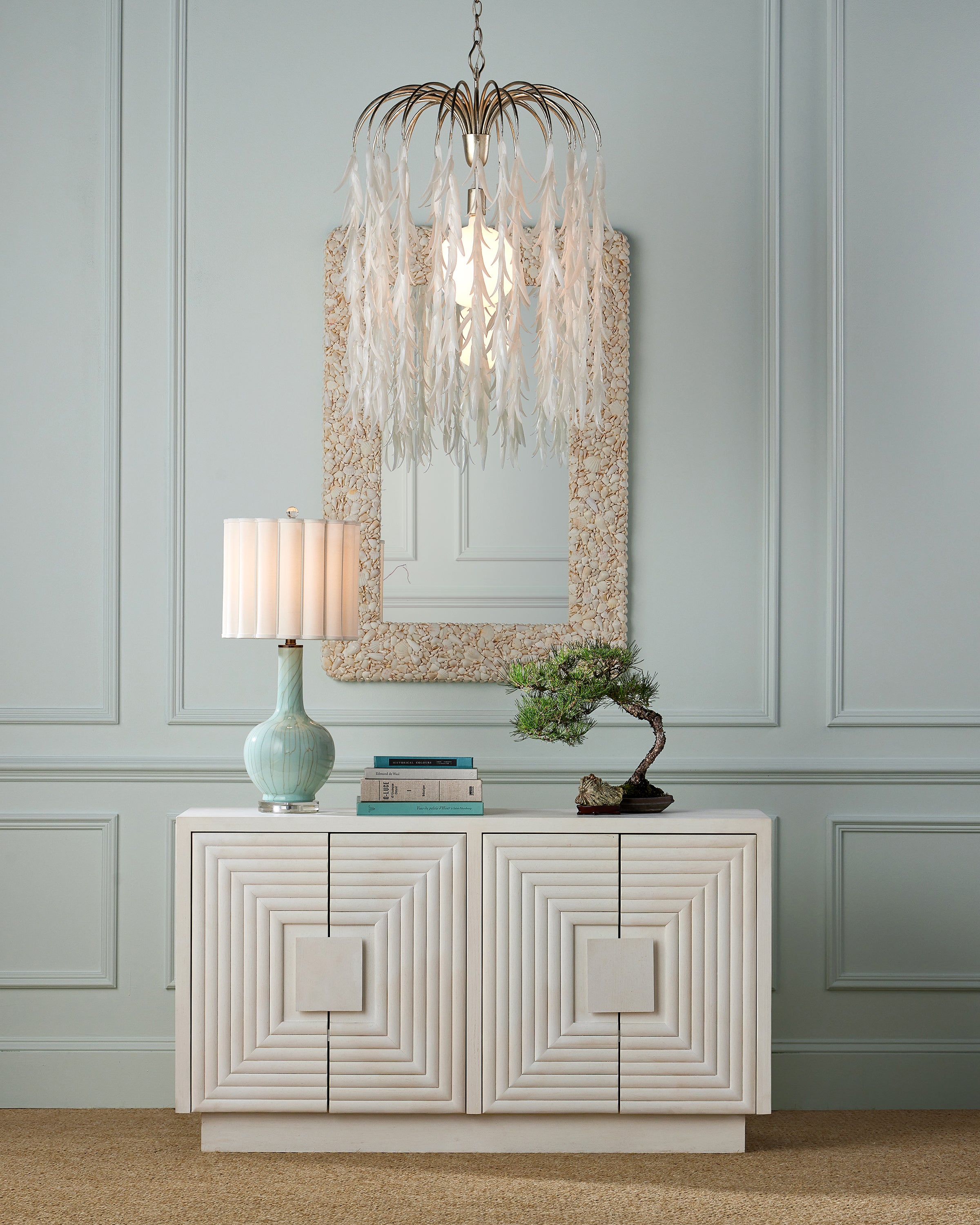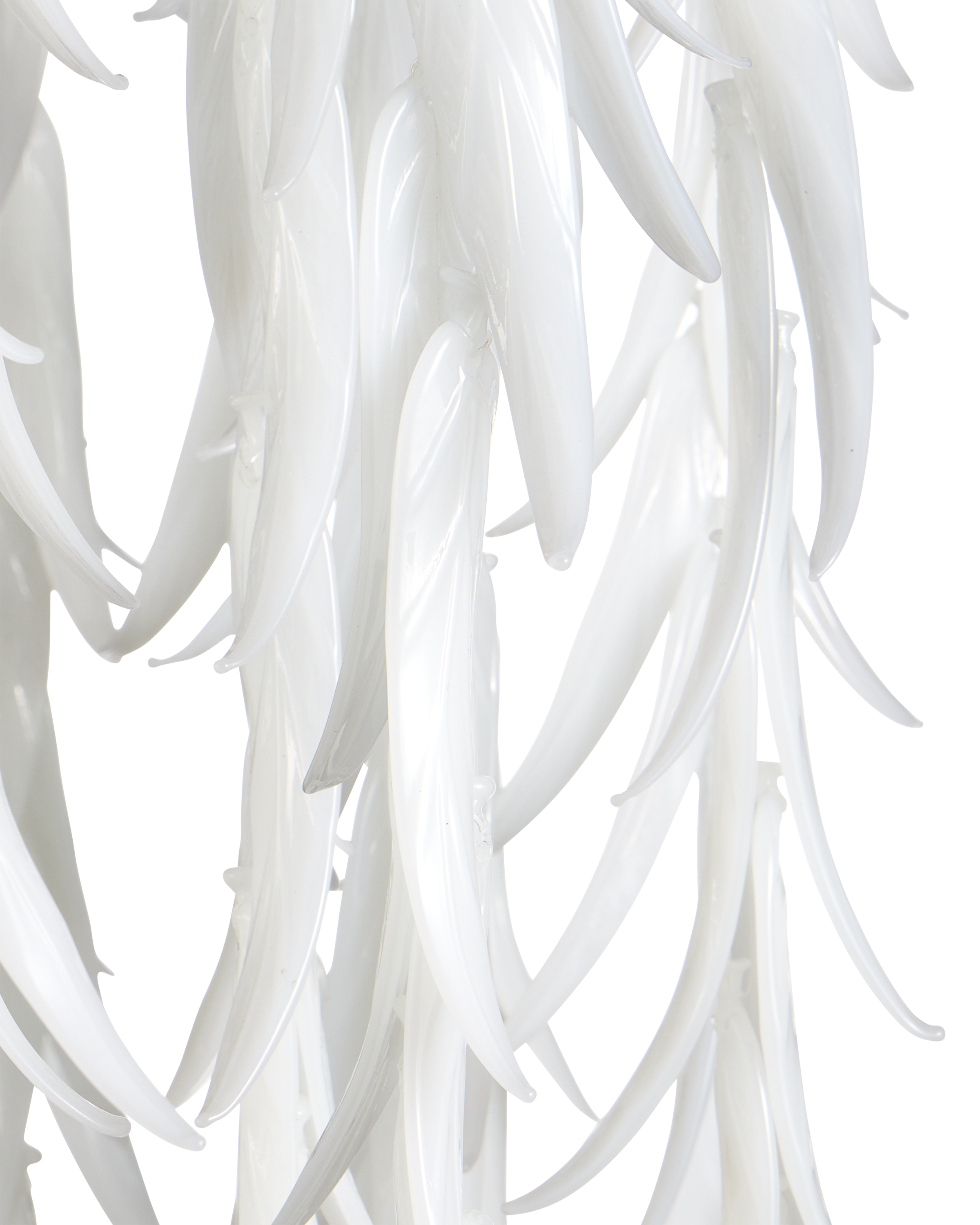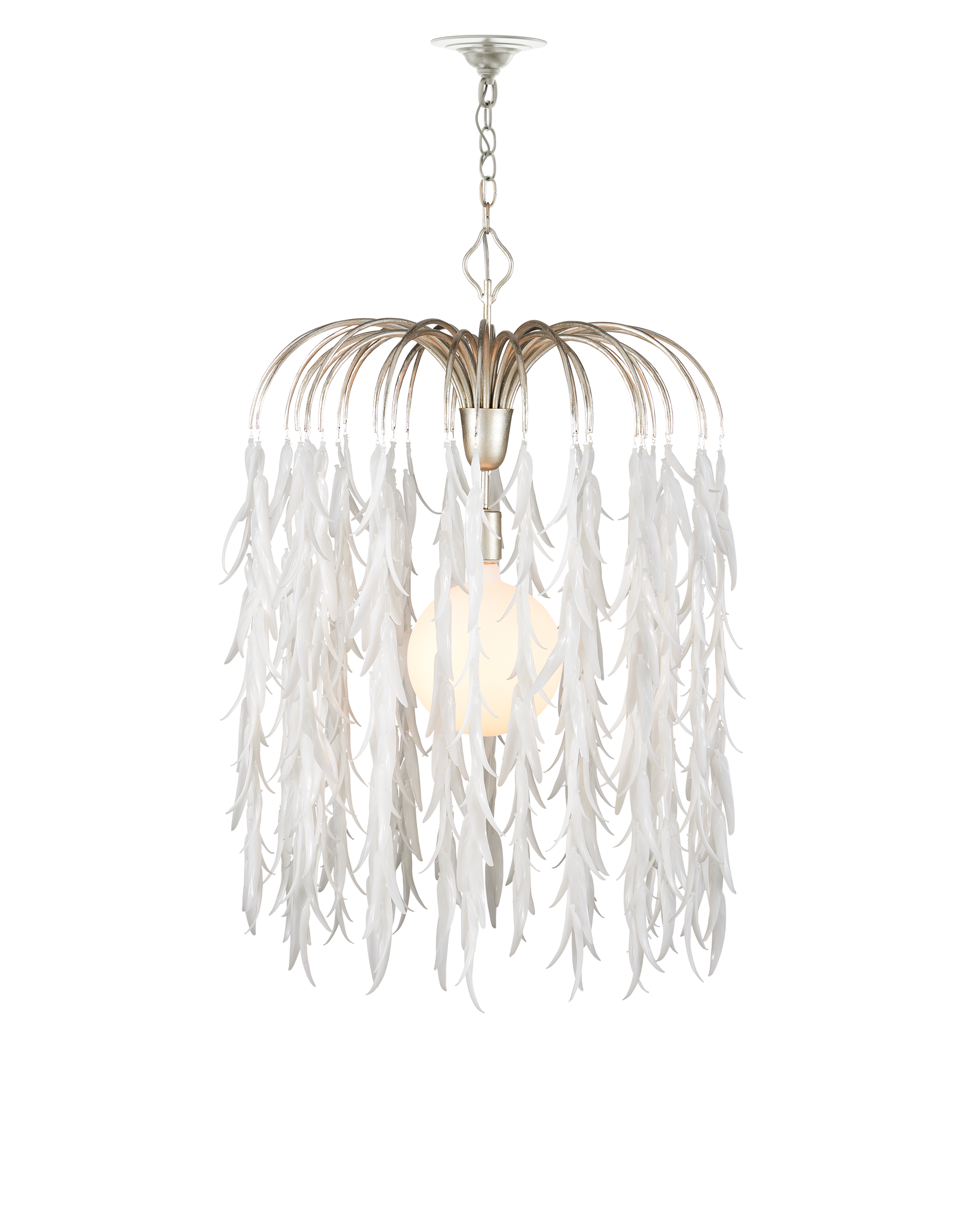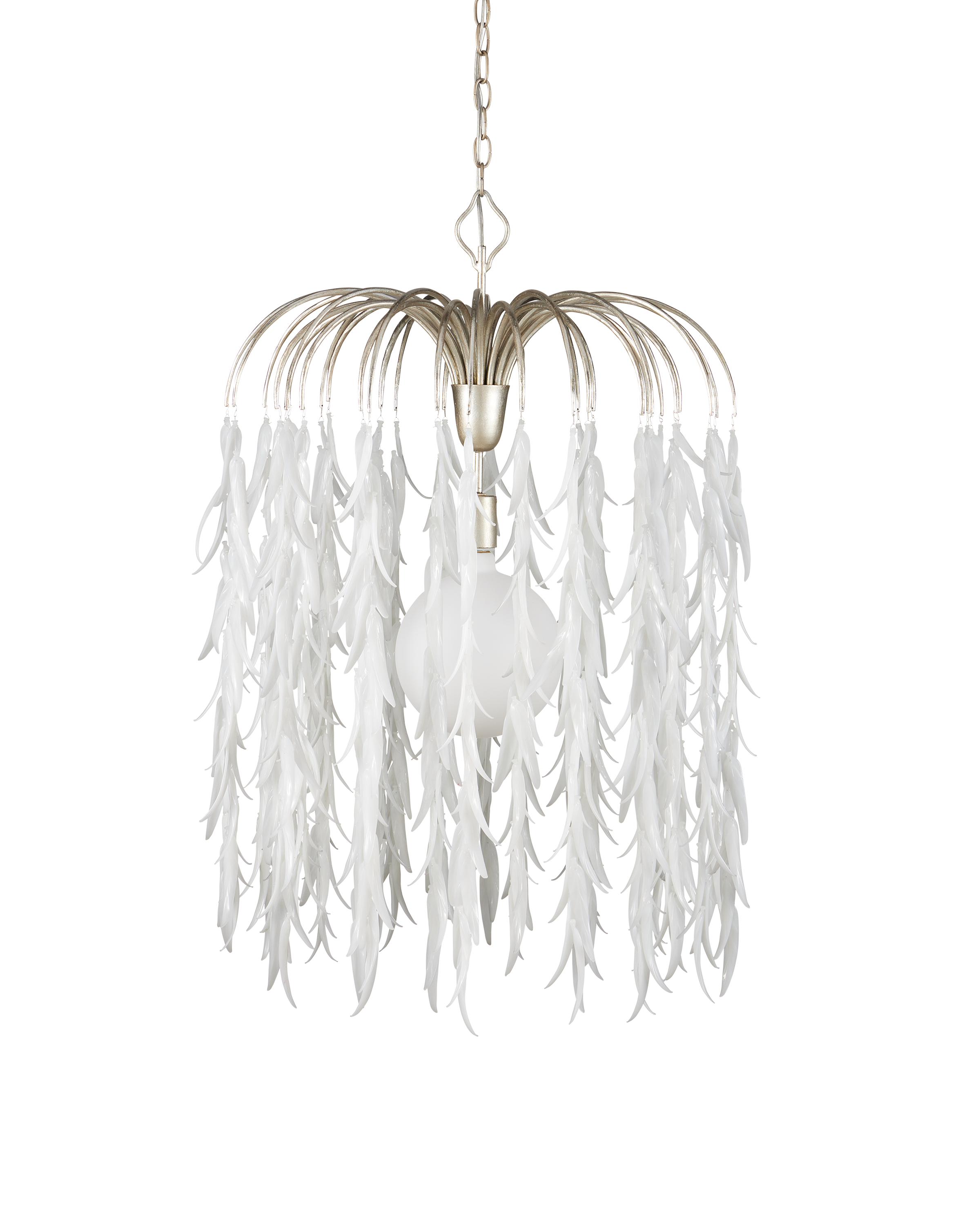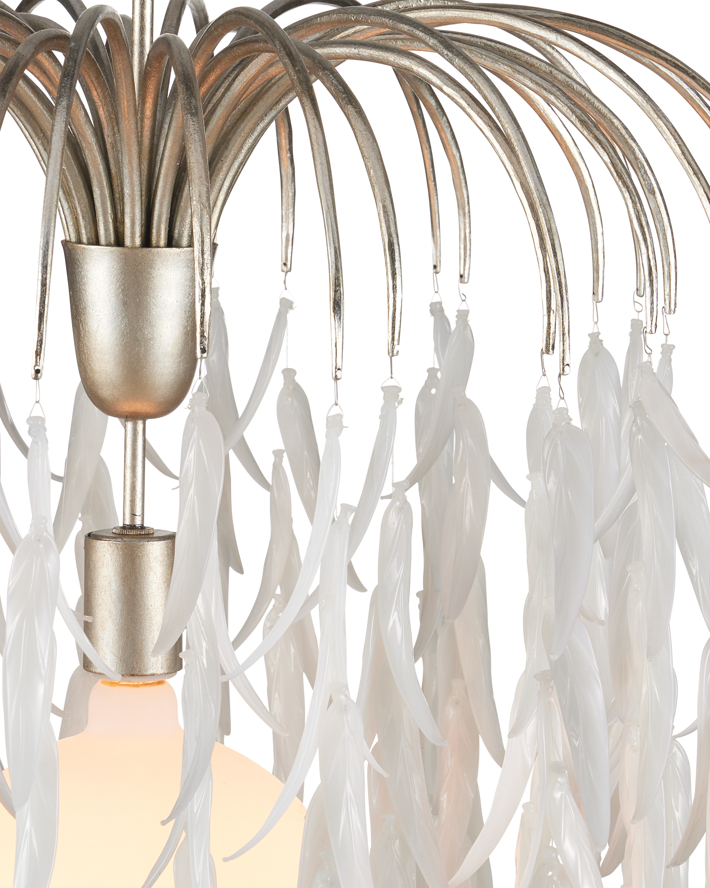 The Currey & Company Glen Arbor Medium Pendant is a silver pendant that drips with white leaves made from organically shaped pieces of glass. Adjustable from 44.5" to 112" with use of included chain/rod kit/cable. If your space calls for a longer drop, additional chain/rods/cable is available for purchase.