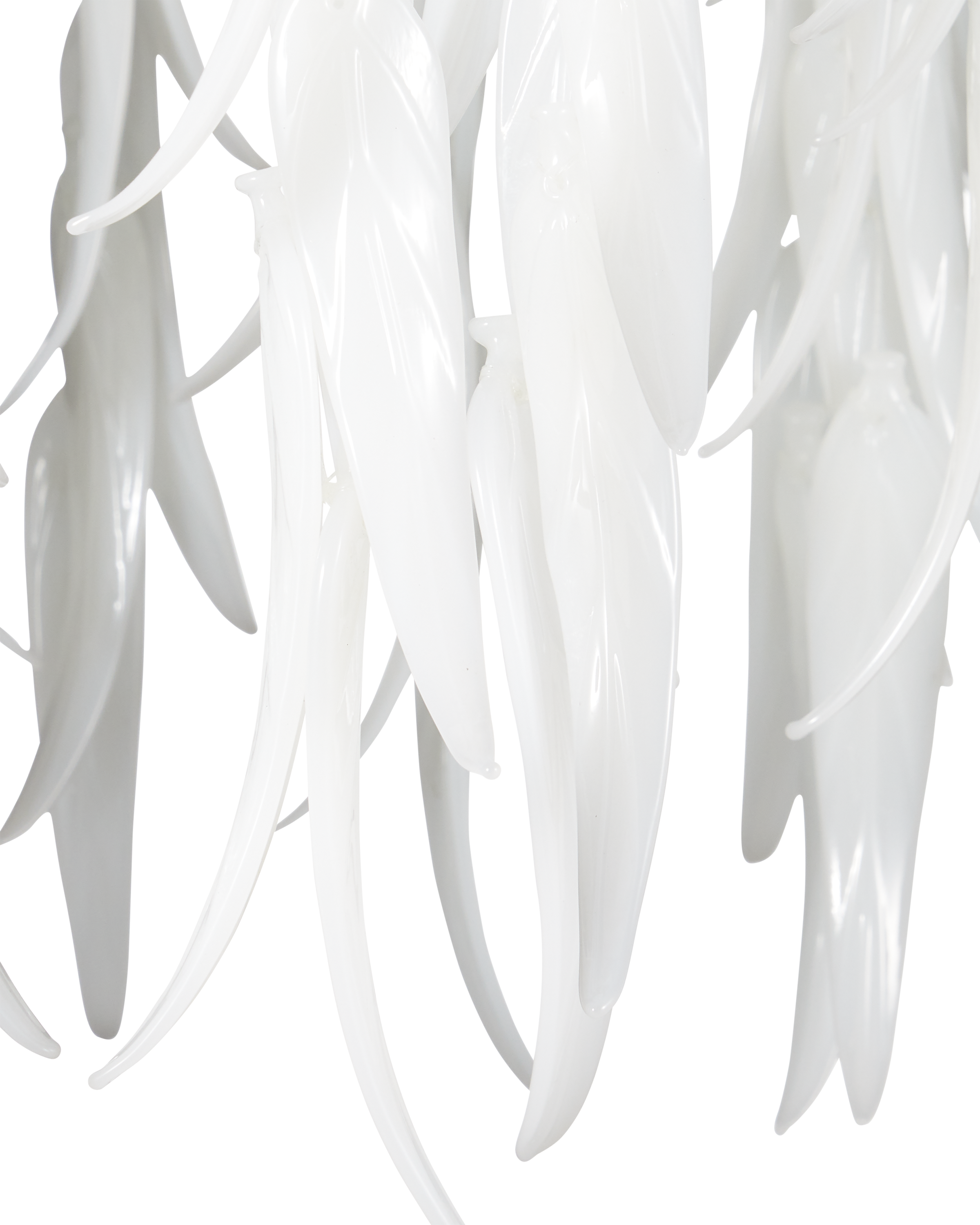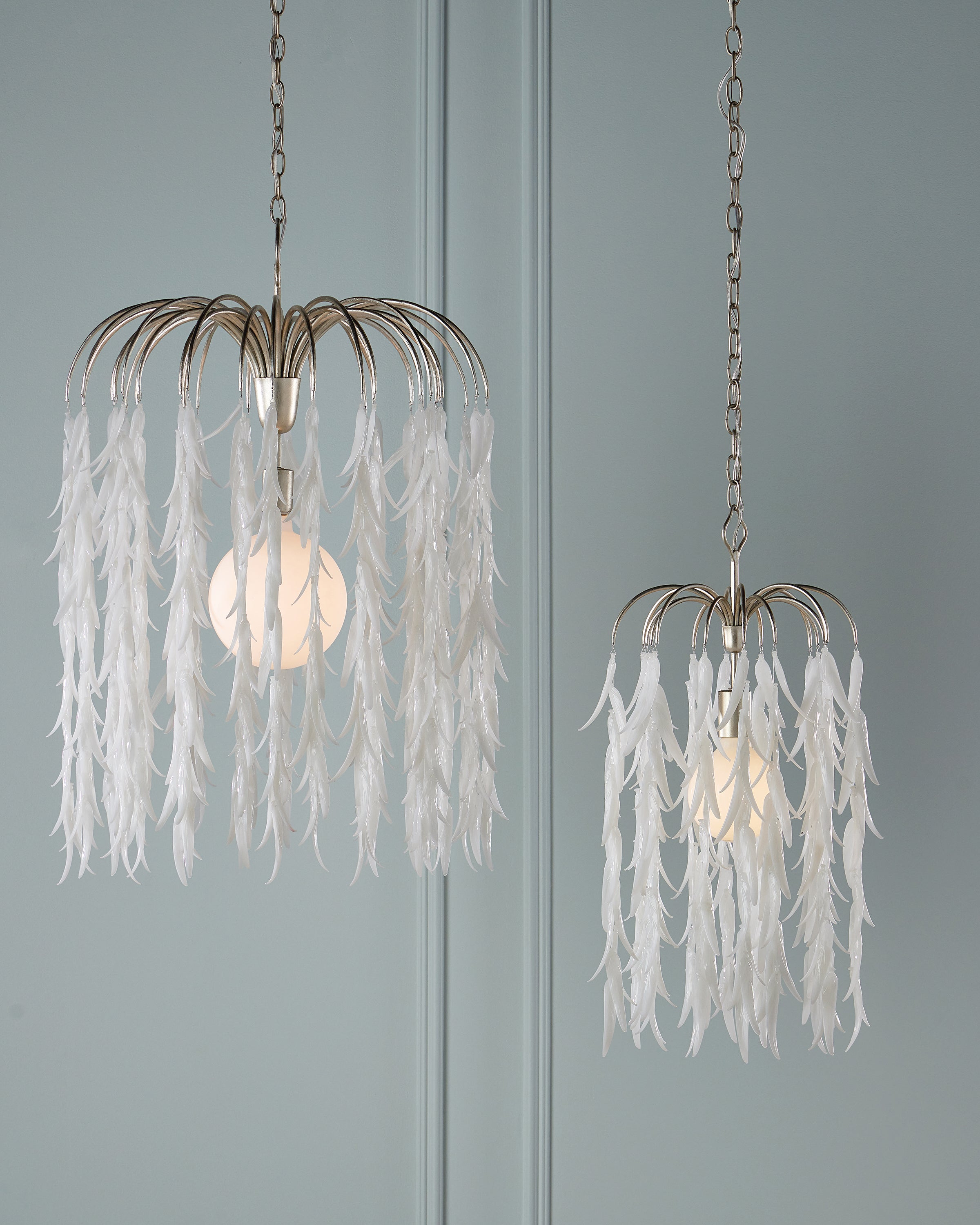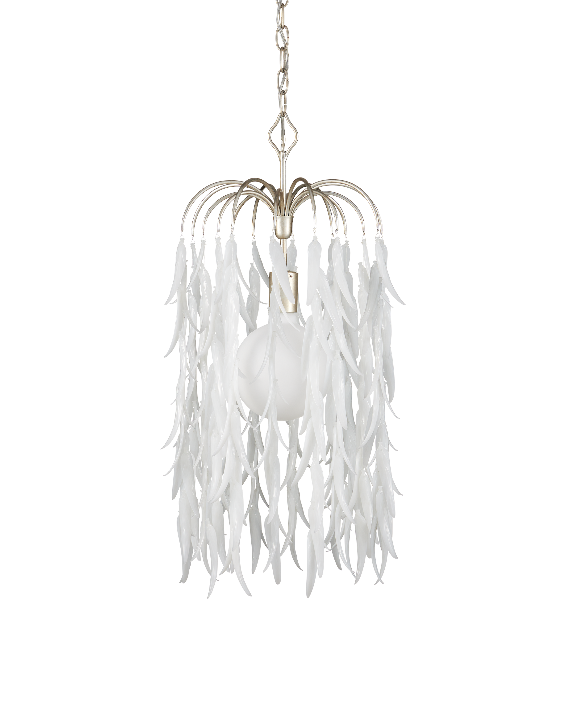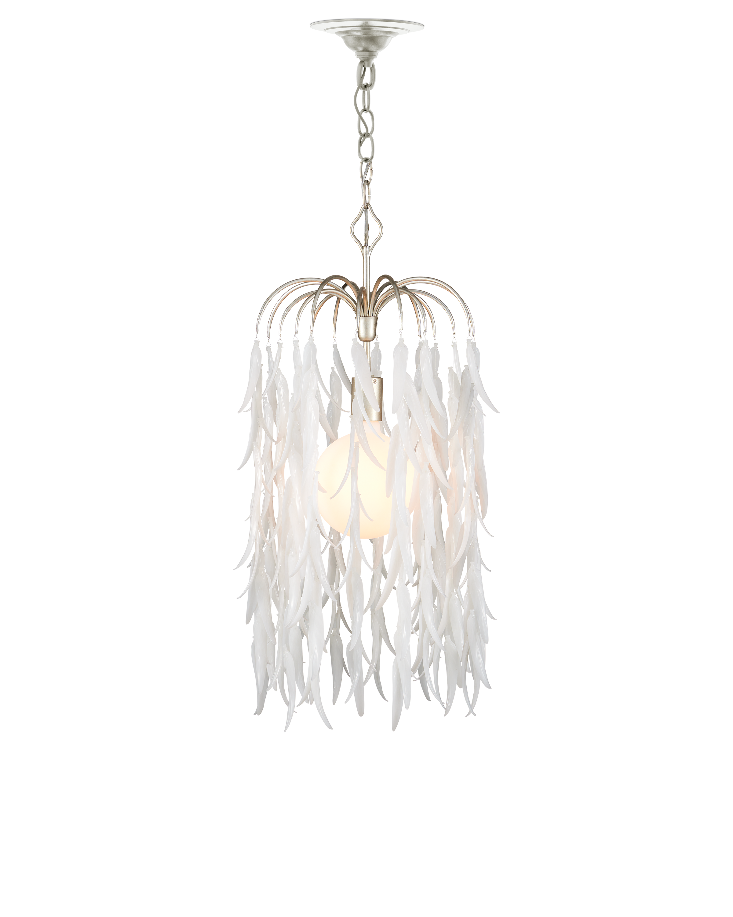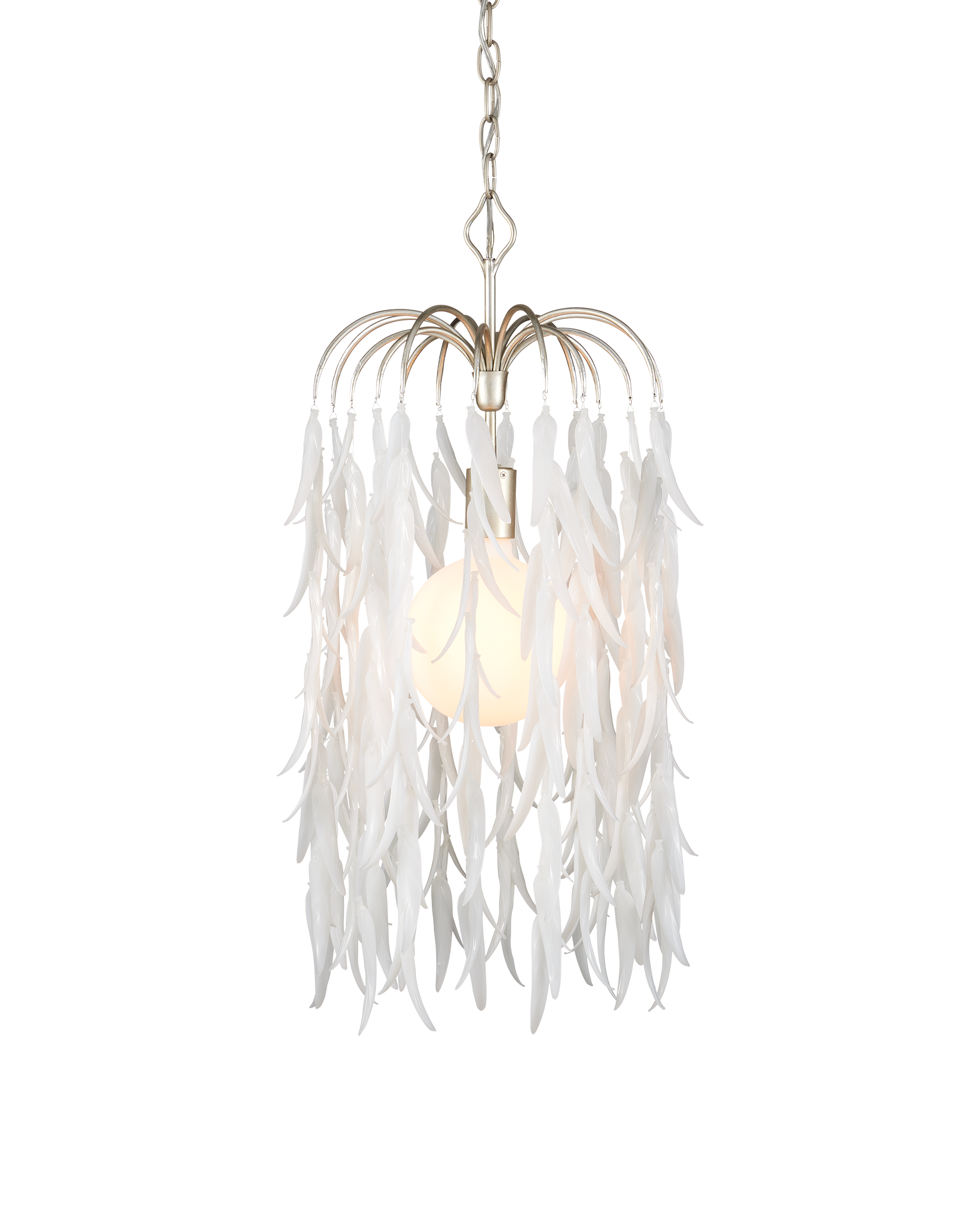 The Currey & Company Glen Arbor Small Pendant is a silver pendant that drips with white leaves made from organically shaped pieces of glass. Adjustable from 35" to 103" with use of included chain/rod kit/cable. If your space calls for a longer drop, additional chain/rods/cable is available for purchase.