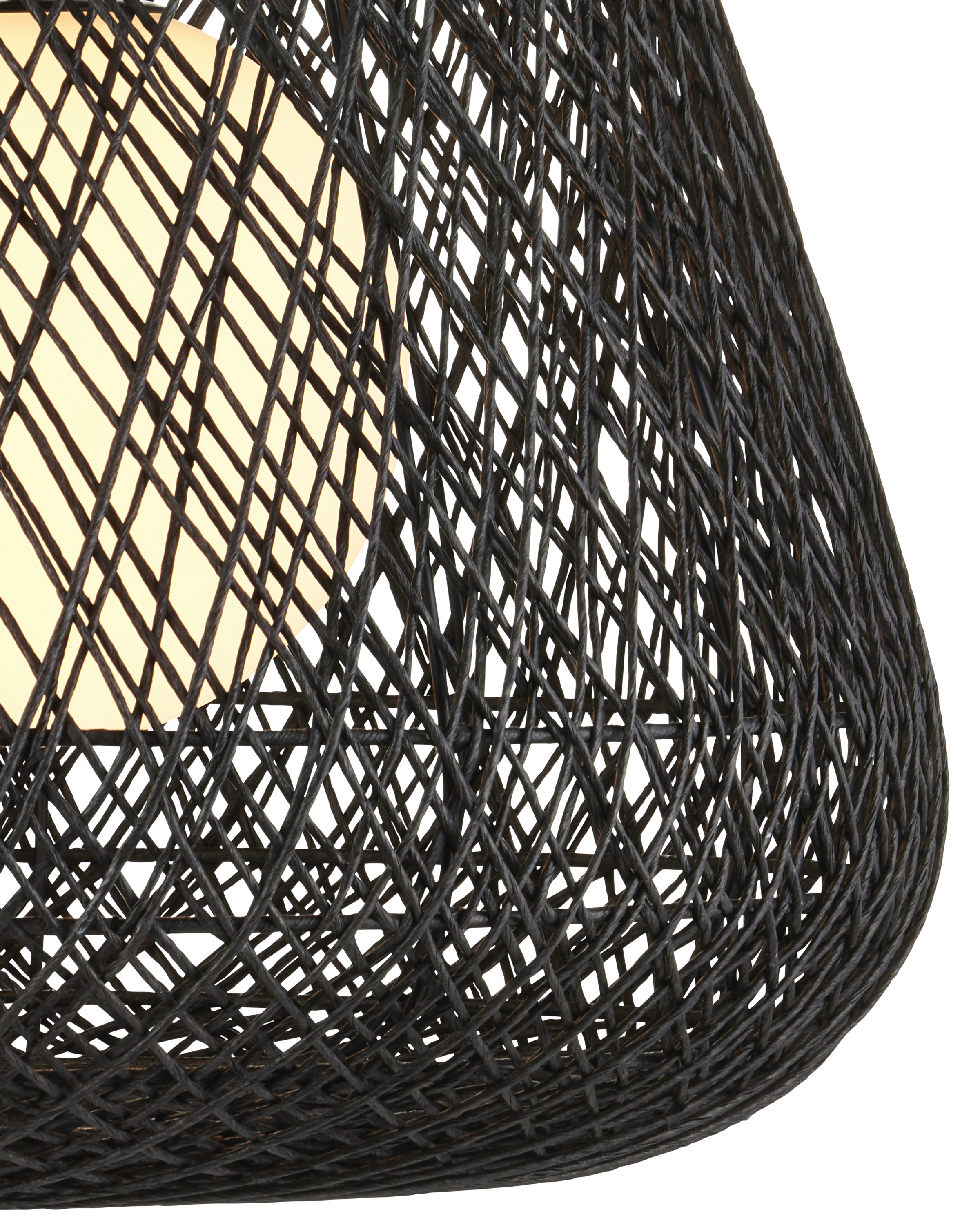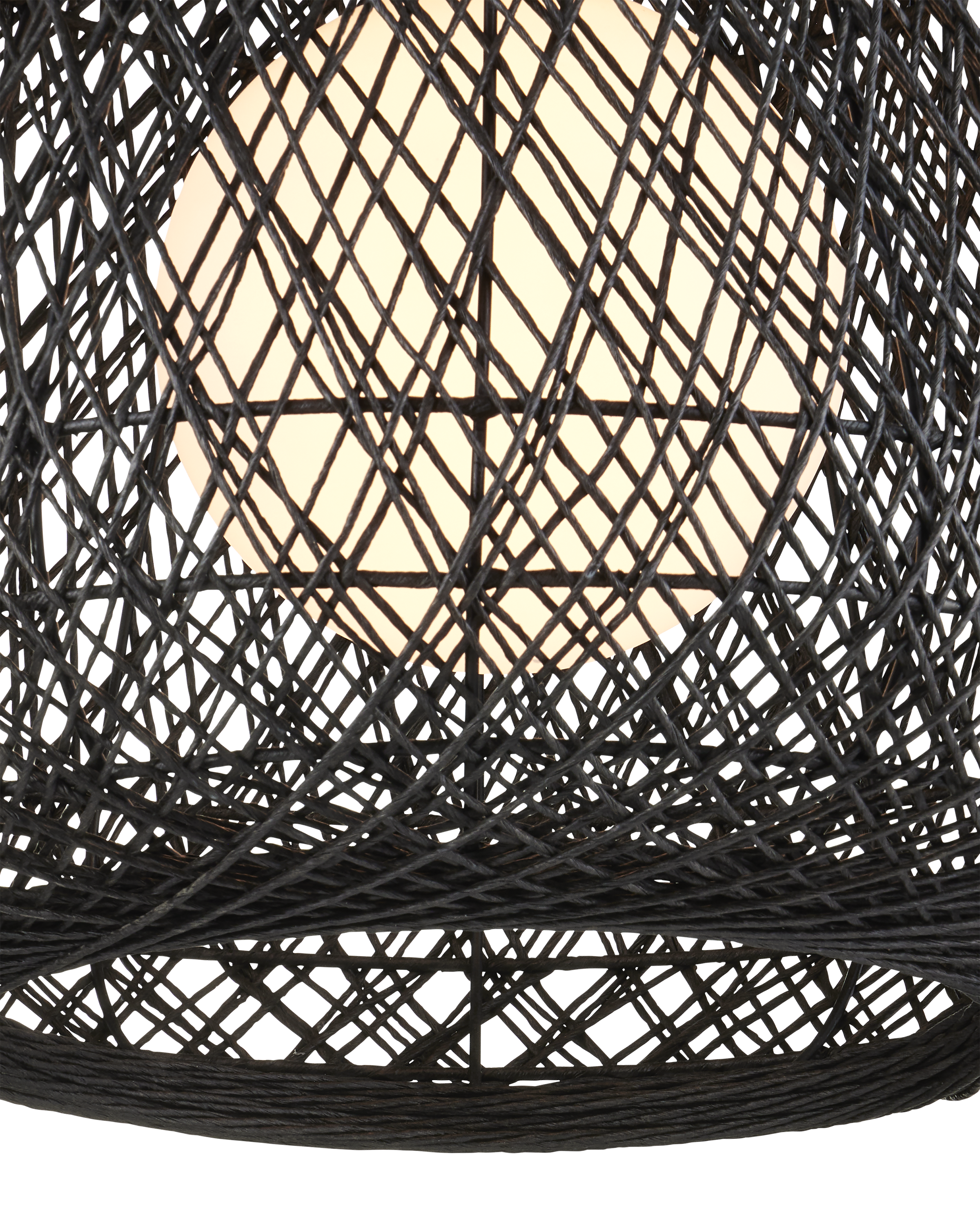 With a profile that looks like the moon nestled in a cocoon, the Osbert Black Pendant is made when black Kraft paper twine is looped around graduating sizes of thin rings. The artful way the string is layered takes great effort, and the darkness of the string complements the satin black finish on the metal. The mysterious feel of the white glass globe that sits within it is a powerful design detail. Adjustable from 28.75" to 99.5" with use of included chain/rod kit/cable. If your space calls for a longer drop, additional chain/rods/cable is available for purchase.