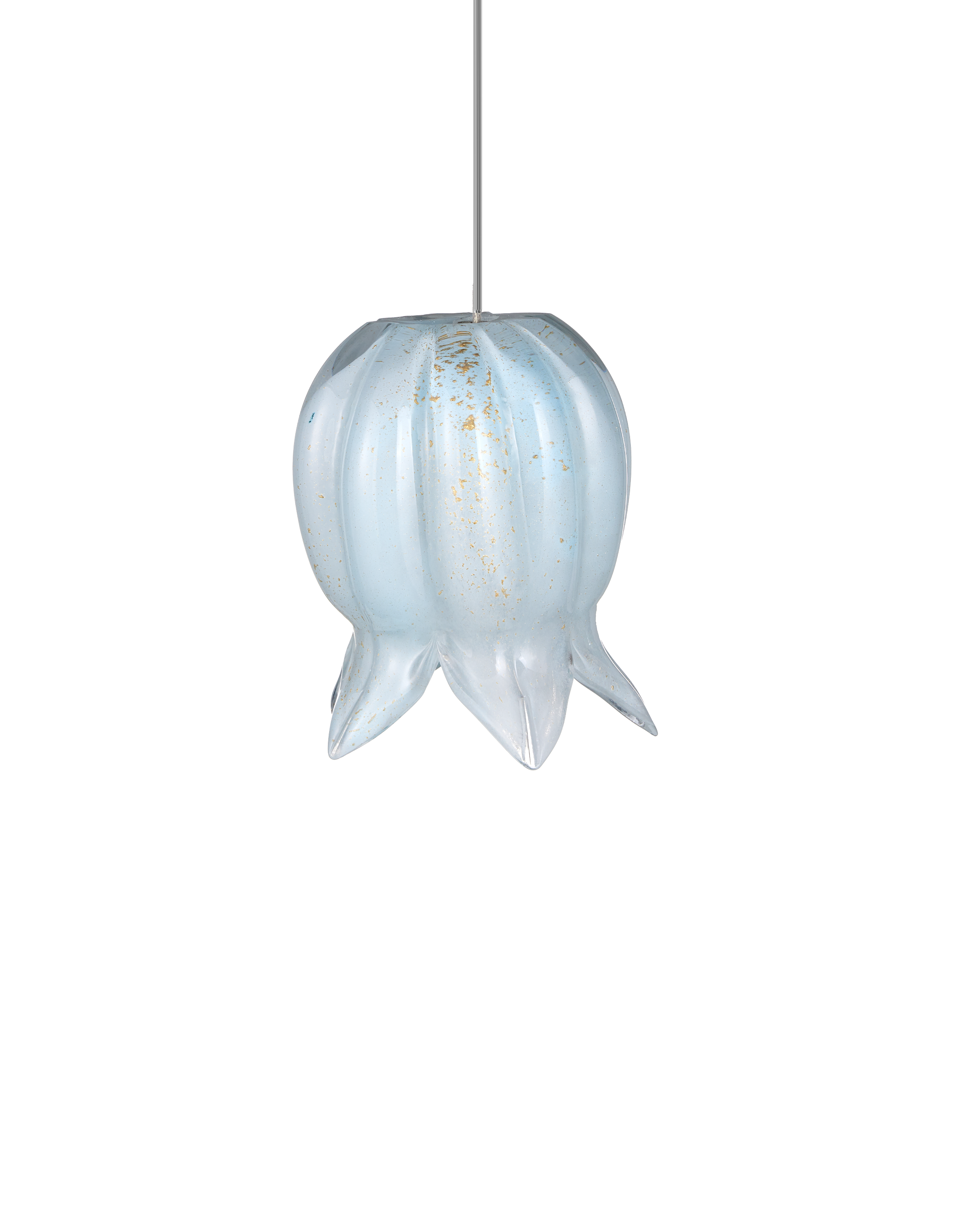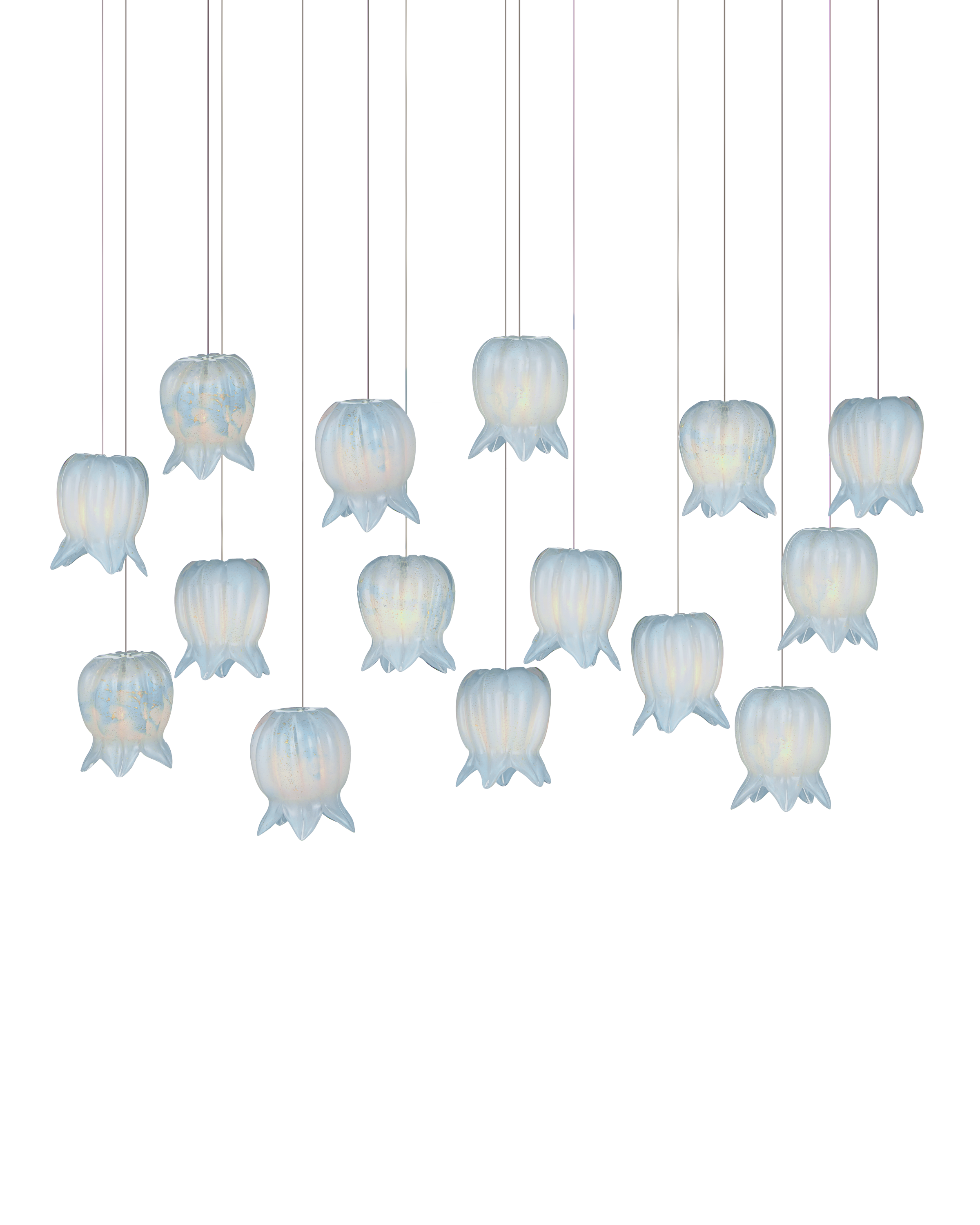 The Currey & Company Polpo Blue 15-Light Linear Multi-Drop Pendant has bell-shaped shades like lily-of-the-valley flowers made of art glass.