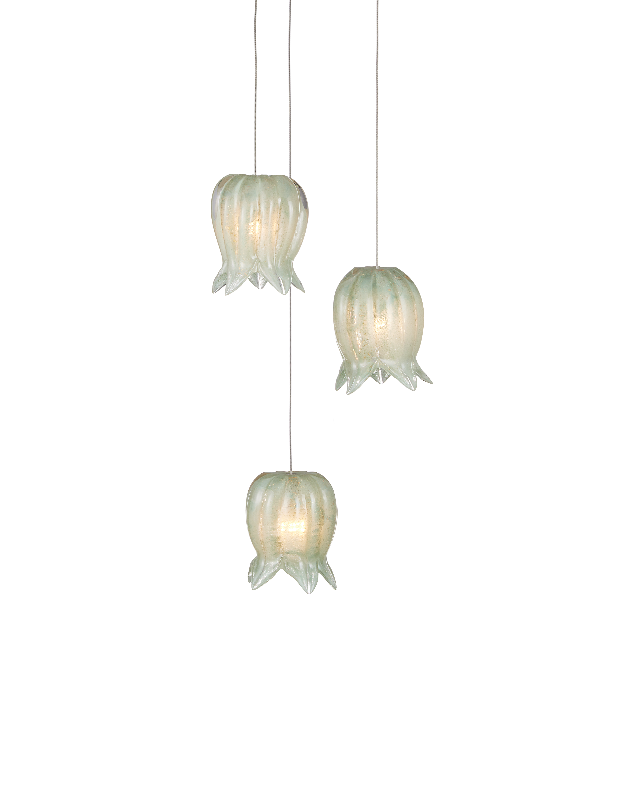 The Currey & Company Polpo Green 3-Light Round Multi-Drop Pendant has bell-shaped shades like lily-of-the-valley flowers made of art glass.