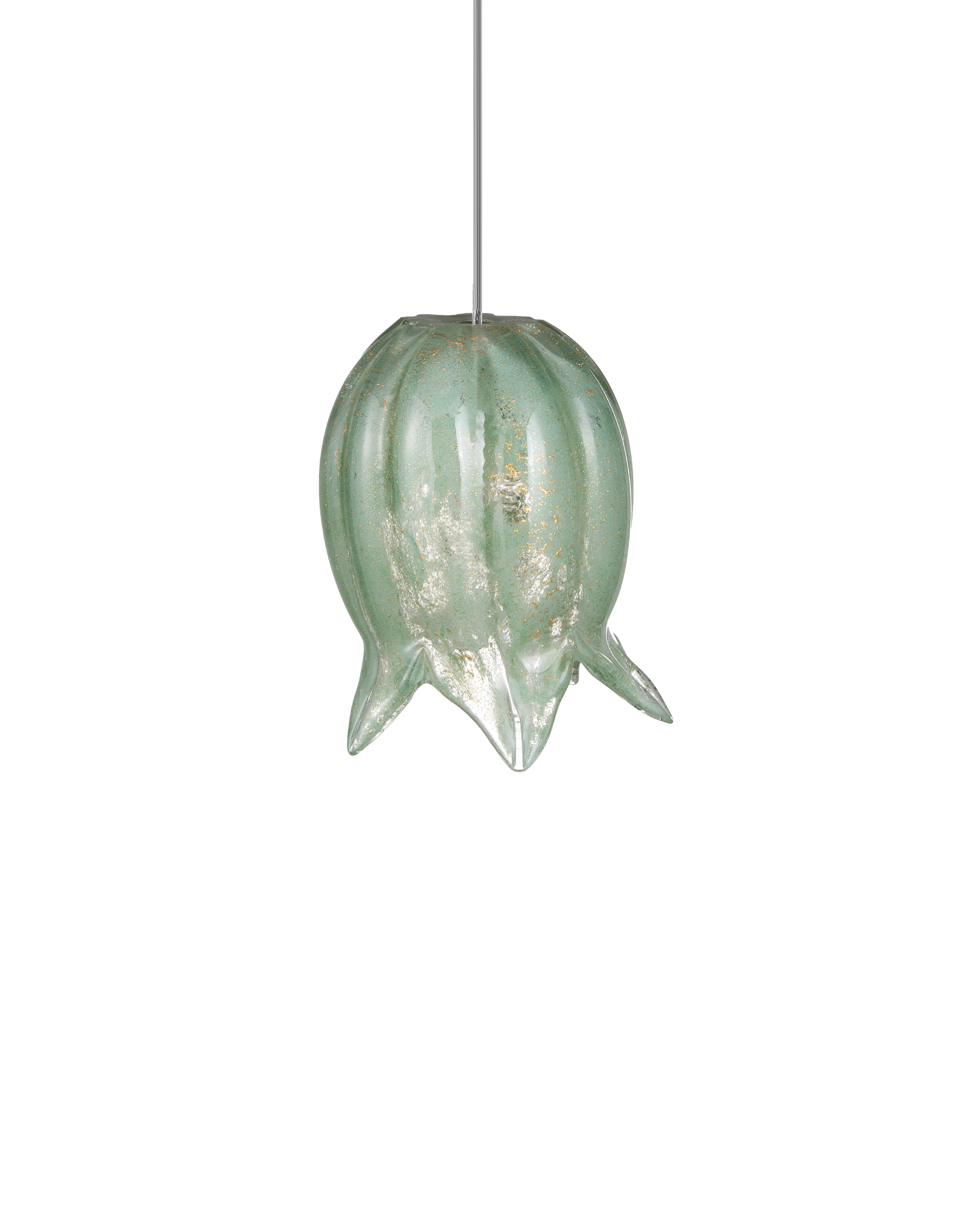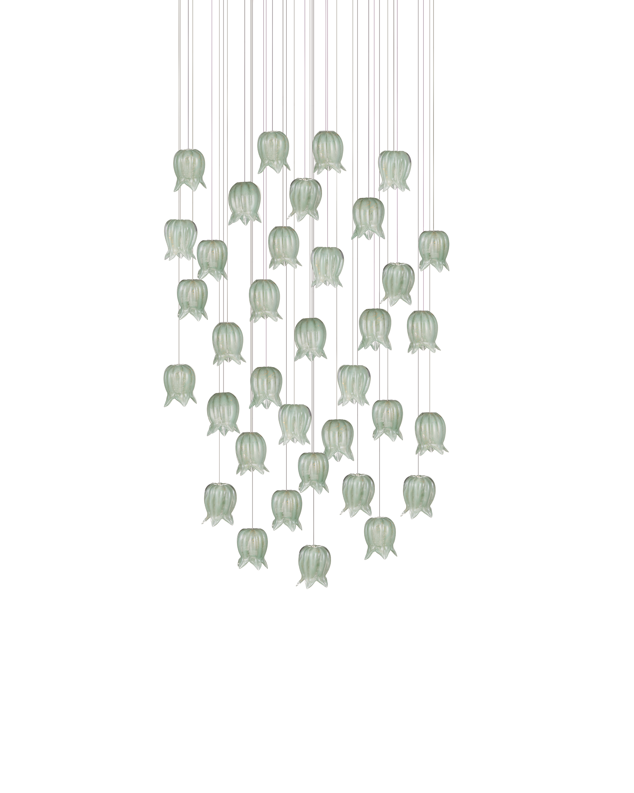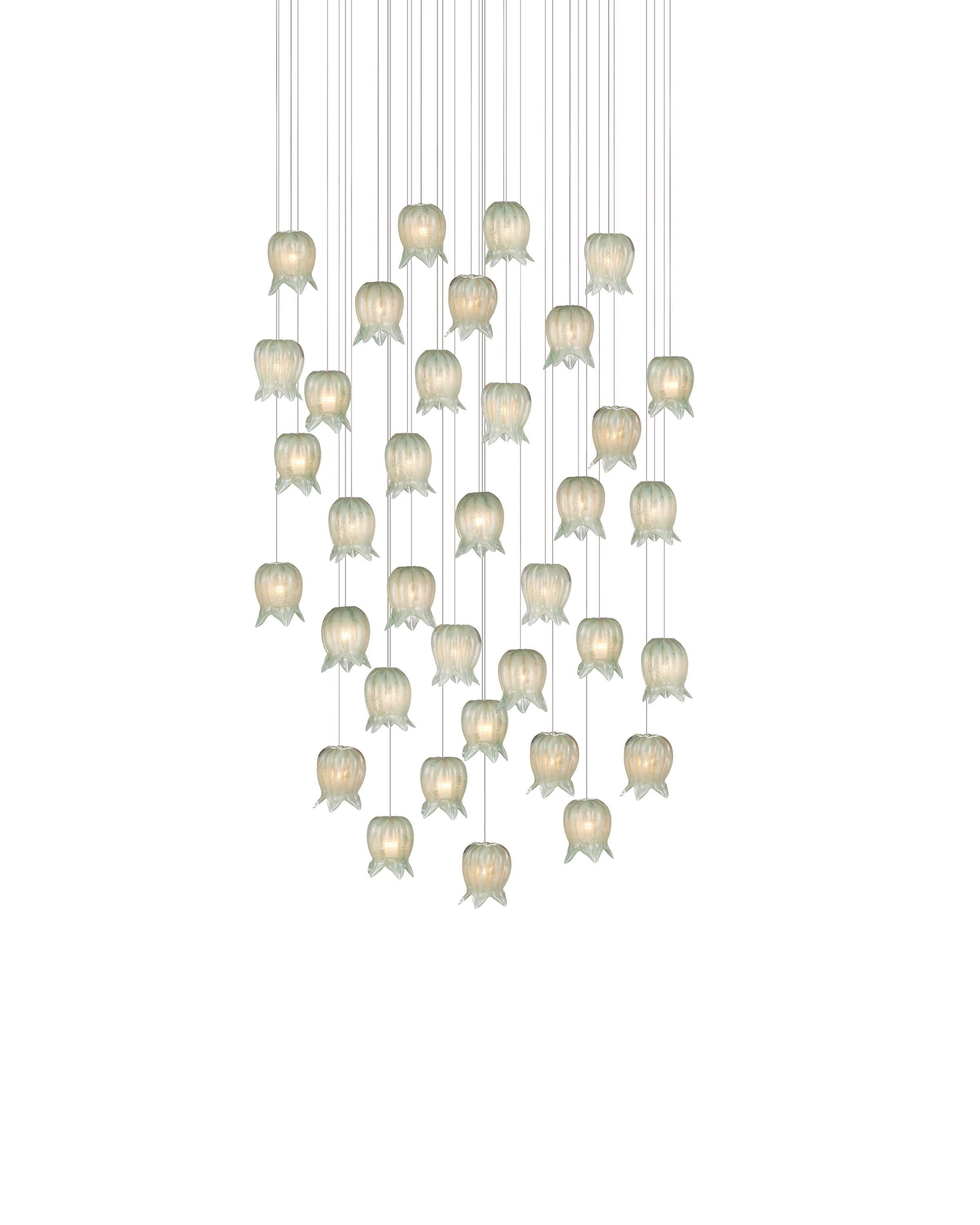 The Currey & Company Polpo Green 36-Light Round Multi-Drop Pendant has bell-shaped shades like lily-of-the-valley flowers made of art glass.