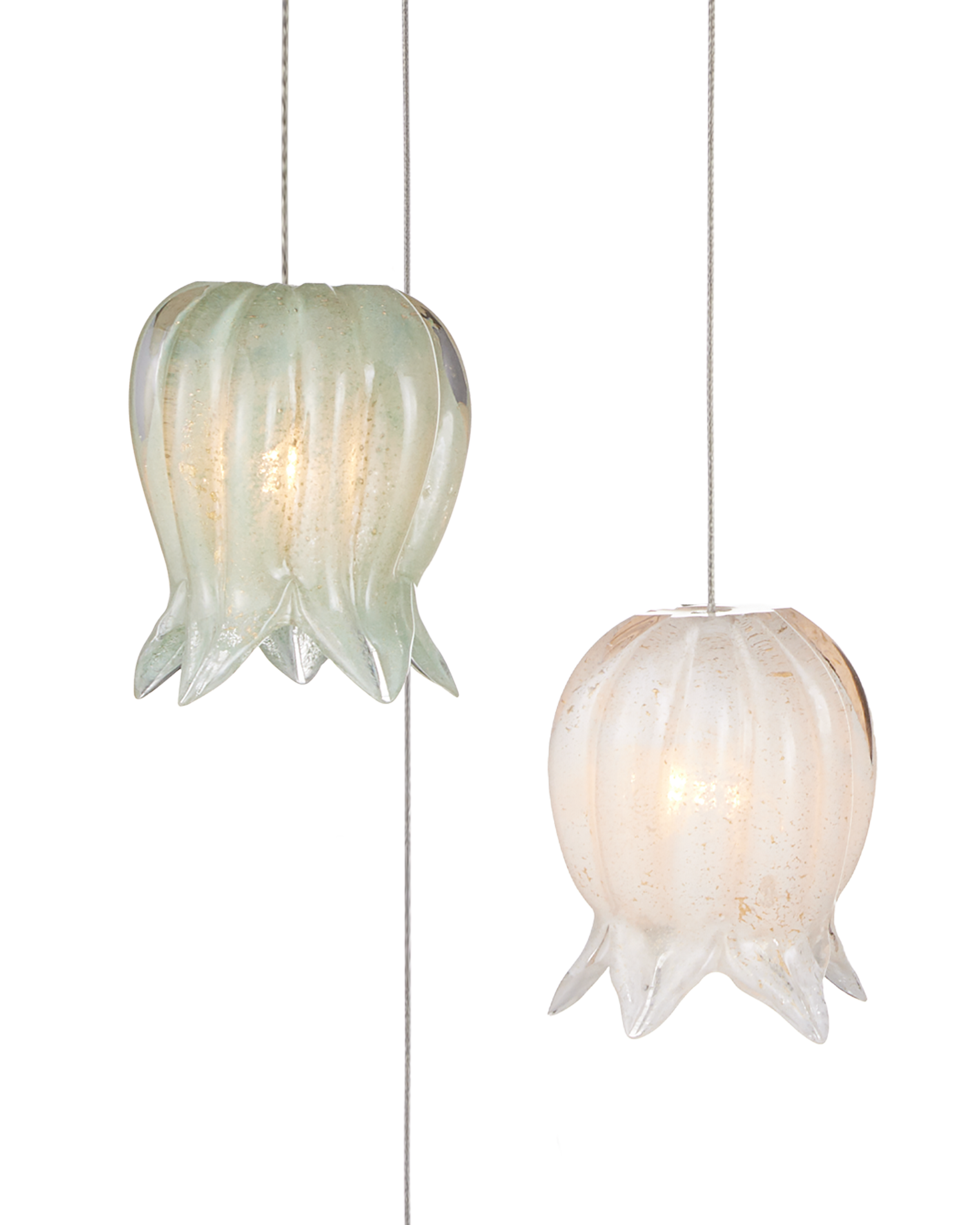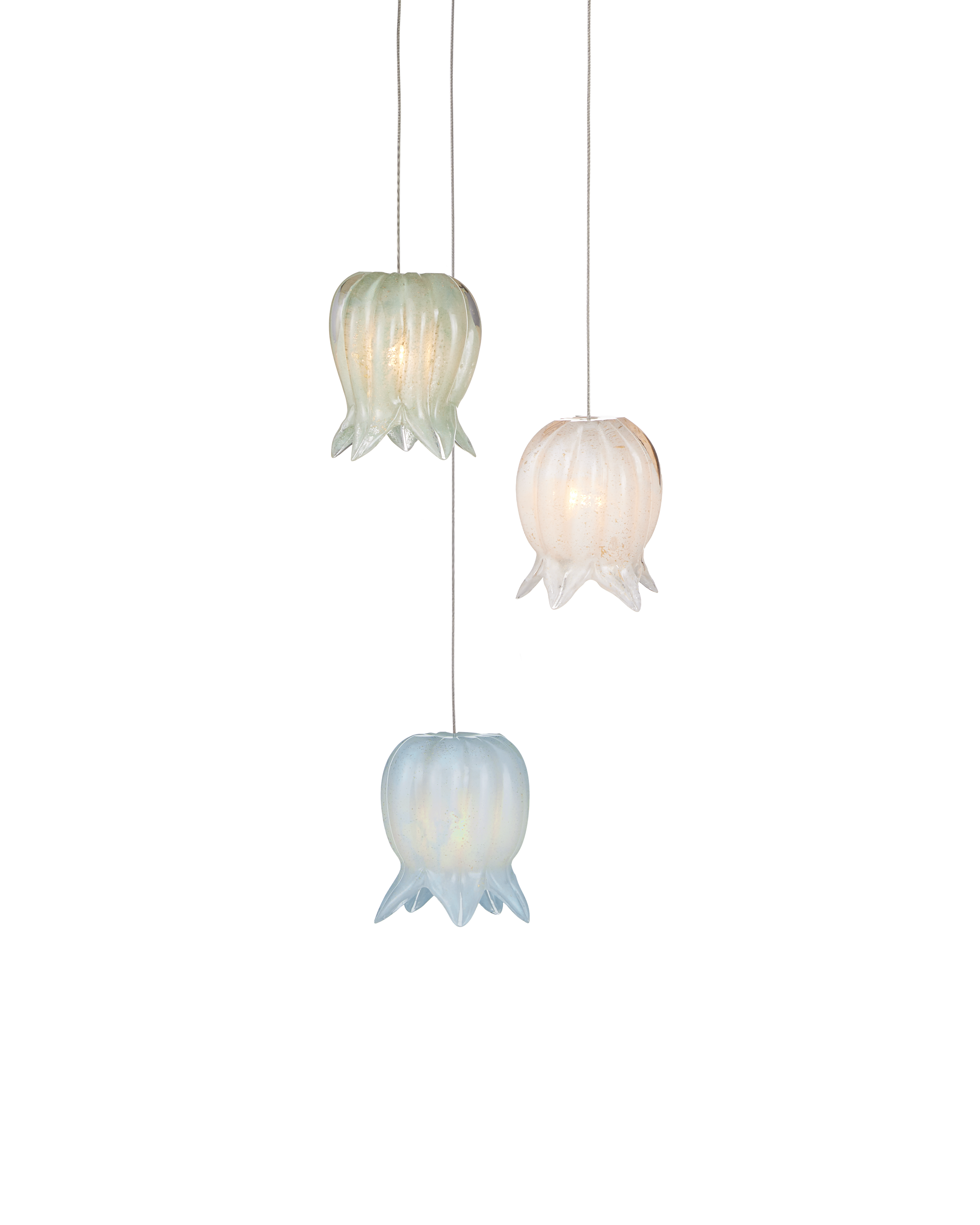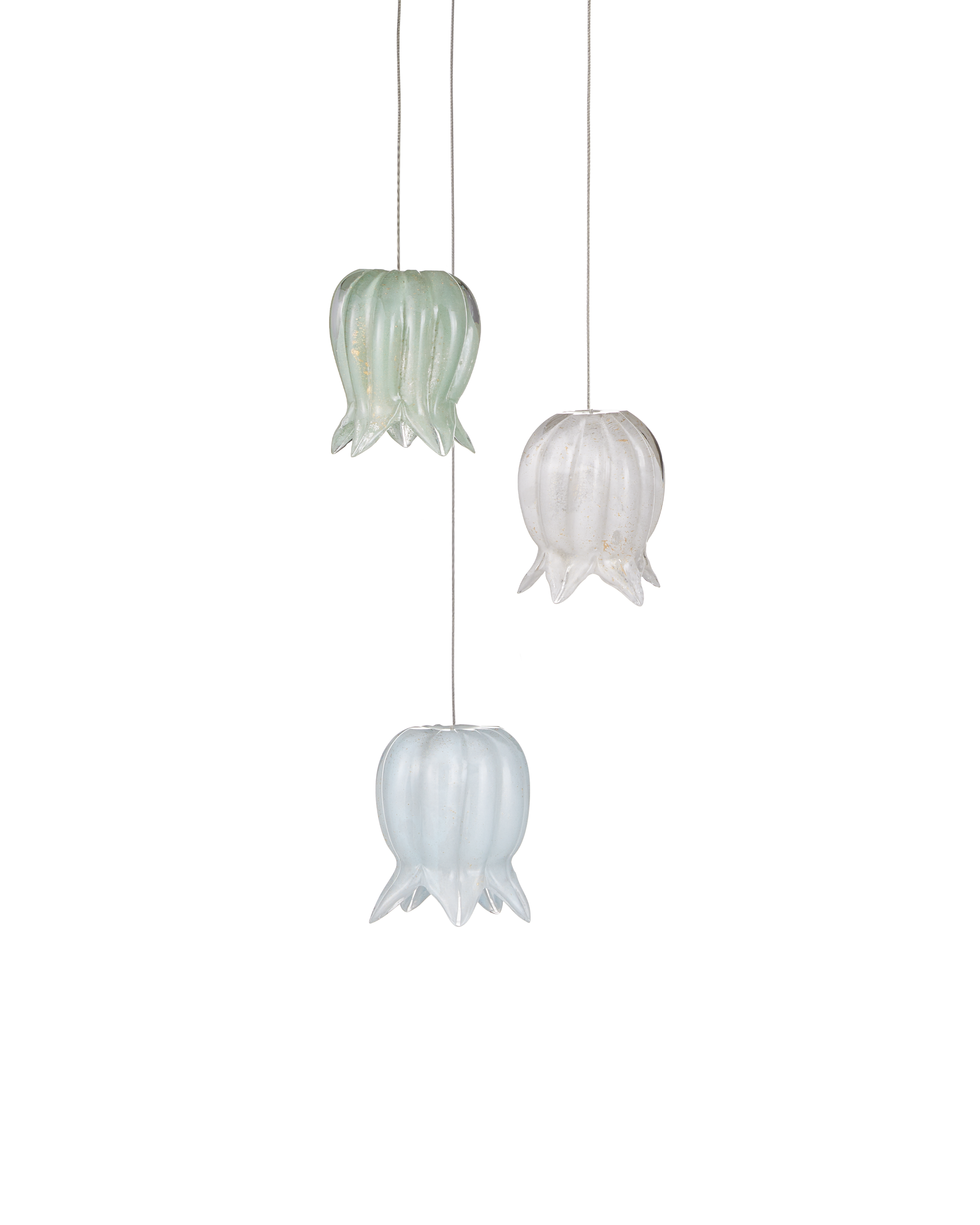 The Currey & Company Polpo Misto 3-Light Round Multi-Drop Pendant has bell-shaped shades like lily-of-the-valley flowers made of art glass.