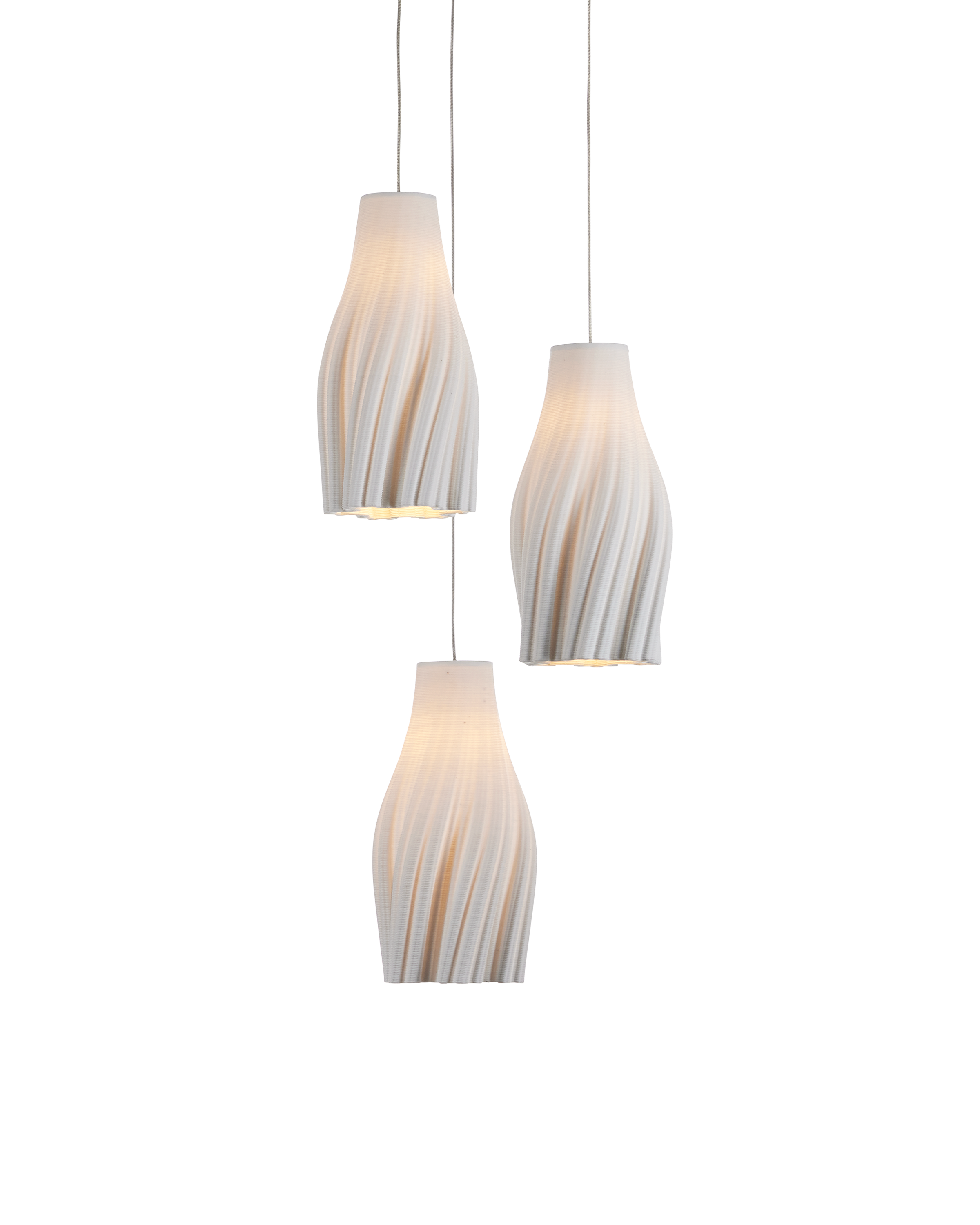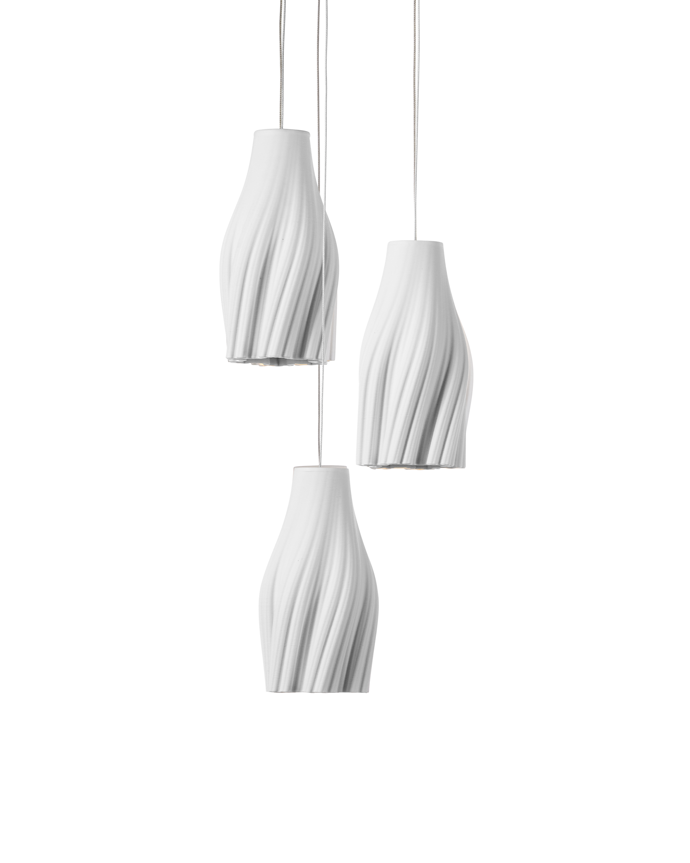The Posh 3-Light Round Multi-Drop Pendant has shades made of white ceramic crafted to resemble tassels. The sense of movement created by the material is an artisanal touch that brings the shades a lovely graceful quality. The thin silver cables from which they hangs leave the shades themselves to be the star of the design.