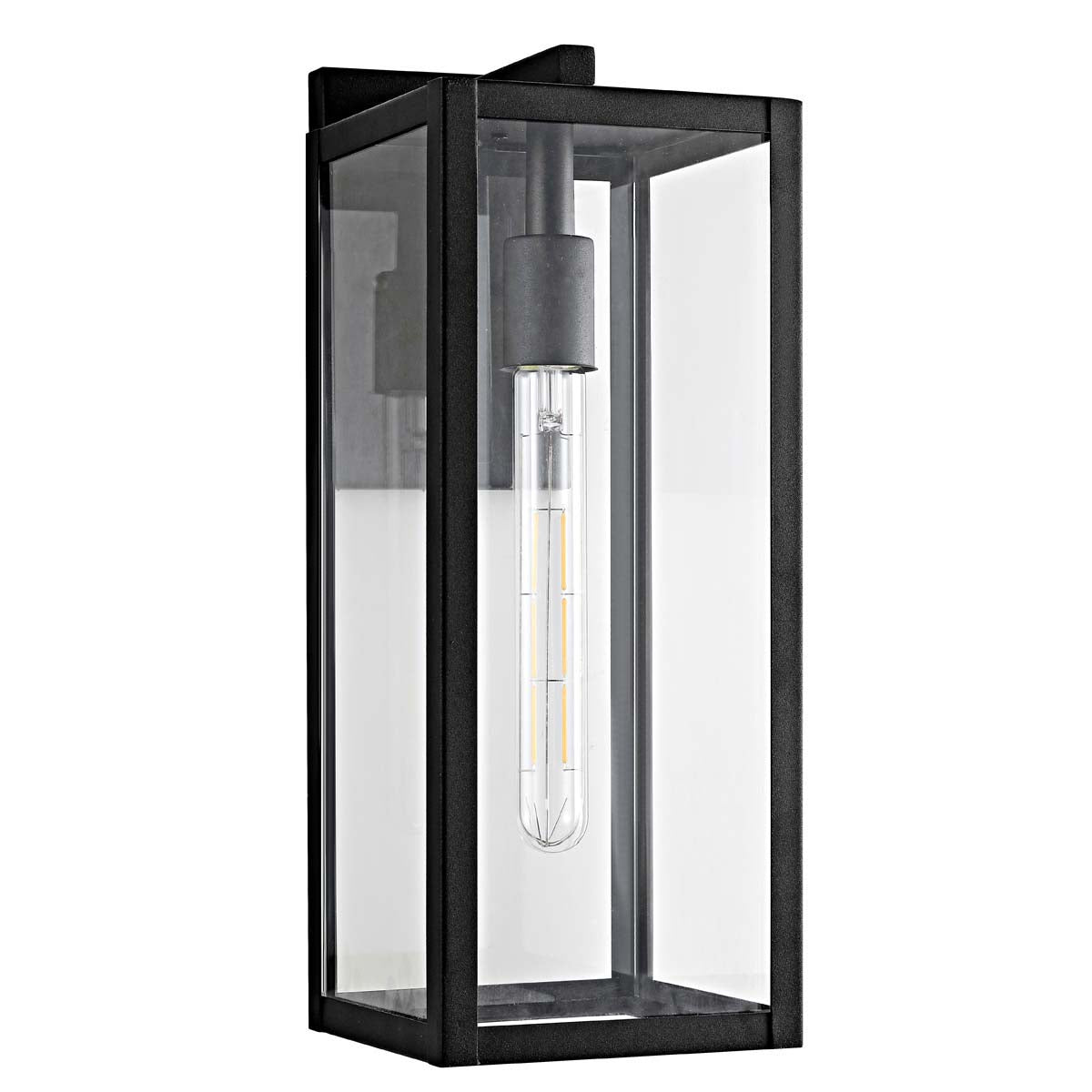 Designed with form and function, this contemporary outdoor wall lantern instantly transforms any outdoor space into a deluxe oasis. Durable and stylish, its rectangular black metal frame and clear glass create the perfect canvas for its ambient glow.