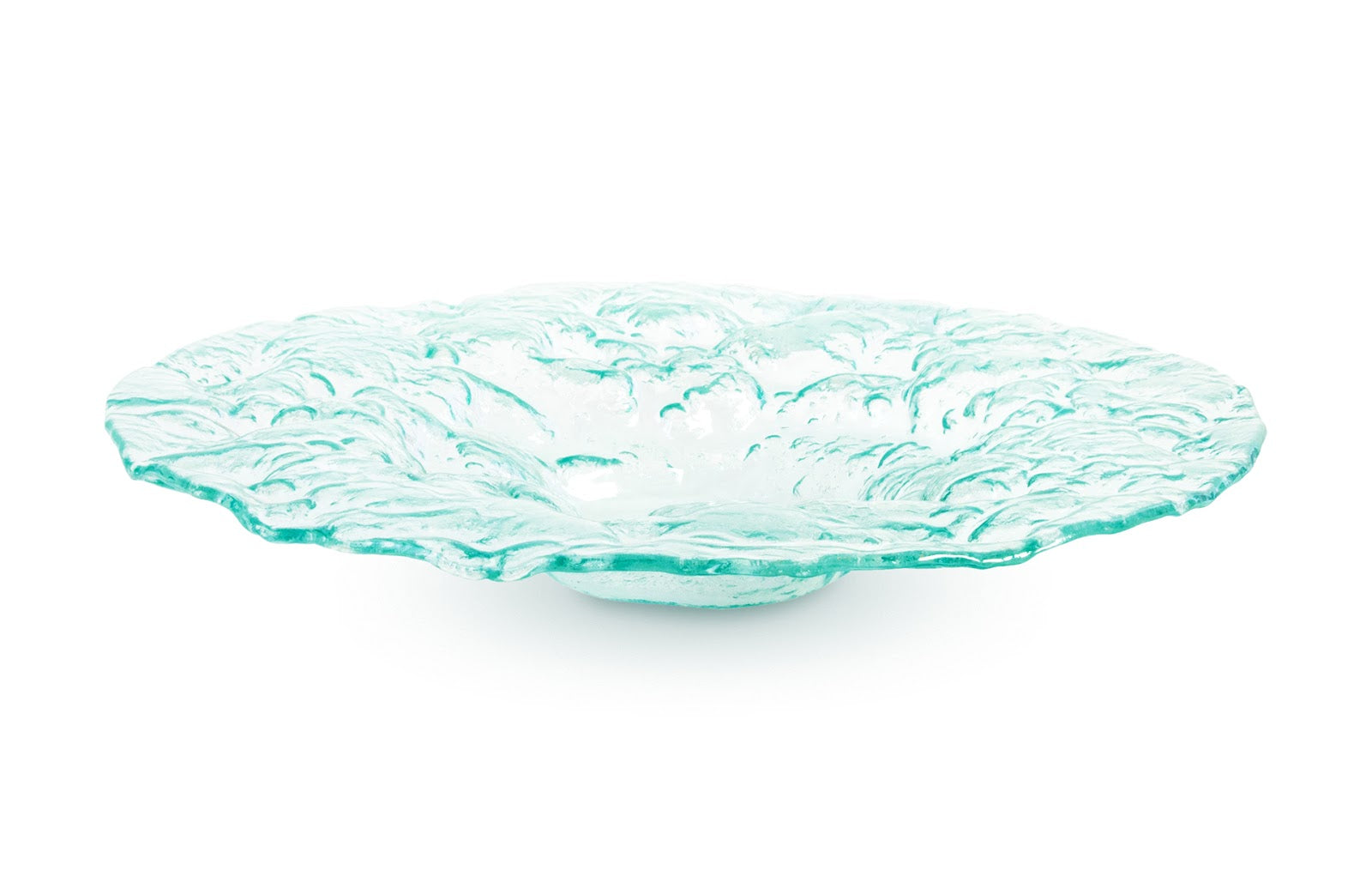 Made of glass with a turquoise sheen, the Large Bubble Bowl is stamped with a flowing pattern that is created when molten glass is laid onto a surface covered with stones. The rocks create varying sizes of impressions that bring this decorative bowl its bubbly personality. The versatility of this decorative accent is one of its charms: place it on a large kitchen island and fill it with dried artichokes or line several of them on a dining room table to form a lovely centerpiece. A design aspect of note is how the fluted edges were created by the bumpy surface of the stones, which is the perfect representation of the Phillips Collection ethos: modern organic. We also offer this design in medium and small sizes.