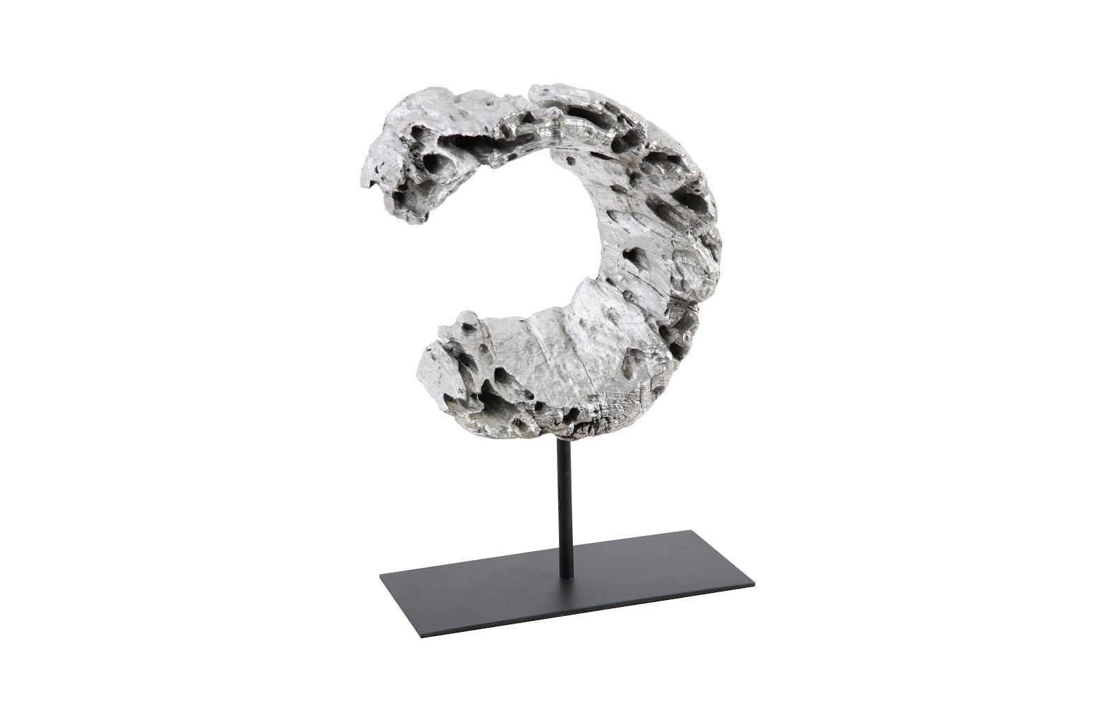 Bring an immediate sense of seriousness to a room with the Cast Eroded Wood Semi-Circle Sculpture. Though it is made of composite, it imitates a relic so convincingly, it could have been pulled from the smoky ruins of a bygone volcano. The mix of silver leaf and black finishes help amplify this ruse, which reflects the ethos that Phillips Collection personifies: modern organic. We offer a similar shape in this collection of table sculptures and several wall tiles, as well.