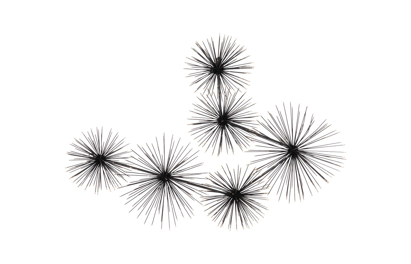 Made of metal, the Sea Root Wall Art has a subtle surprise in store. Each rounded tip of the black extrusions that coalesce to mimic the shape of a sea urchin is tipped in gold. The black wall sculpture has a delicate profile as the explosions of needles float along an angular frame. The fact that we are imitating Nature in a contemporary wall sculpture makes this piece a perfect example of the Phillips Collection ethos of modern organic.