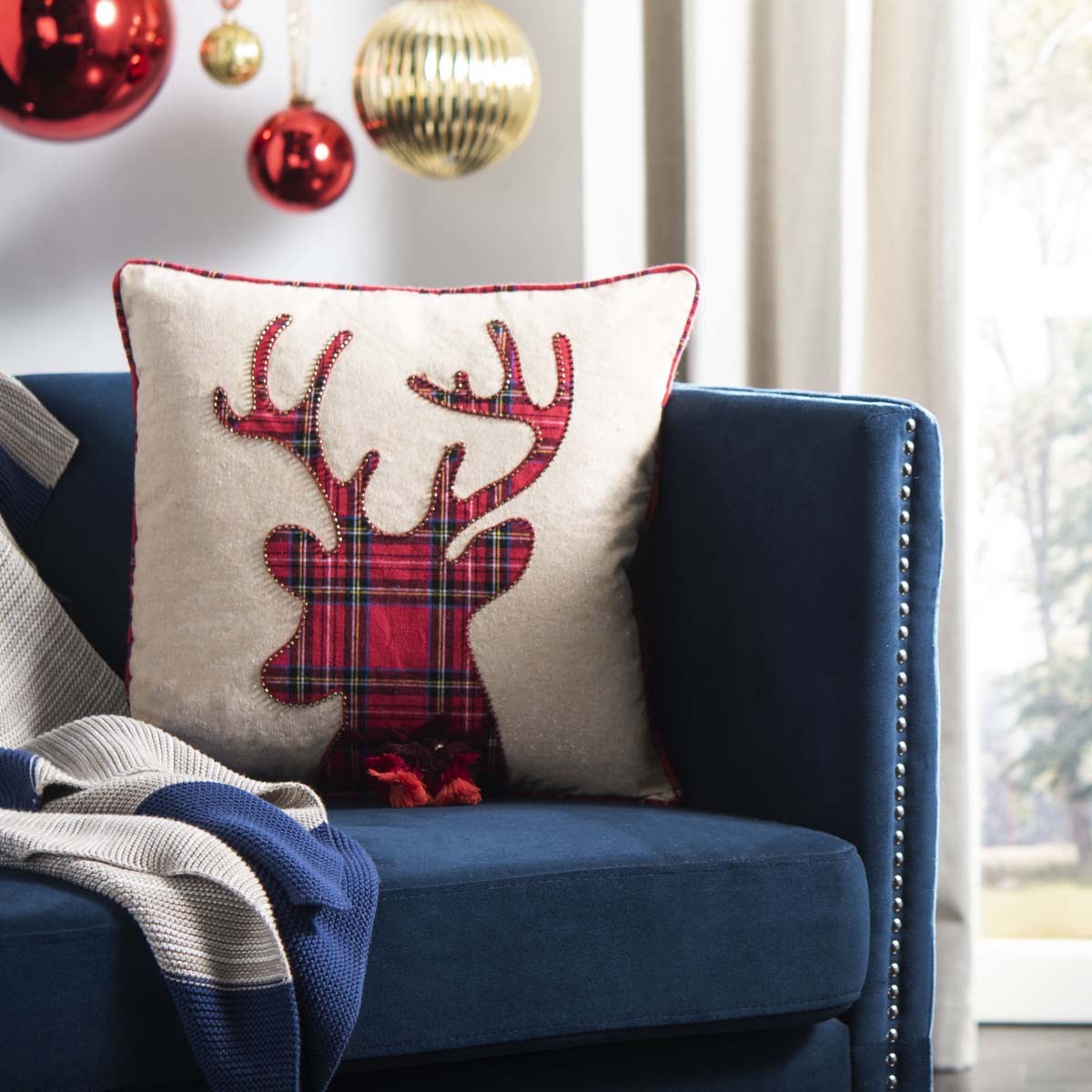 The warm colors of the season are artfully displayed in the charming plaid reindeer of the Blitz Pillow by Safavieh. Bright red, blue and white tartan hues create a lovely rendition of this familiar holiday character, with plaid piping around the ivory cover adding a marvelous finishing touch. Blitz is made of polyester with an easy access zipper for convenient care and cleaning year after year.