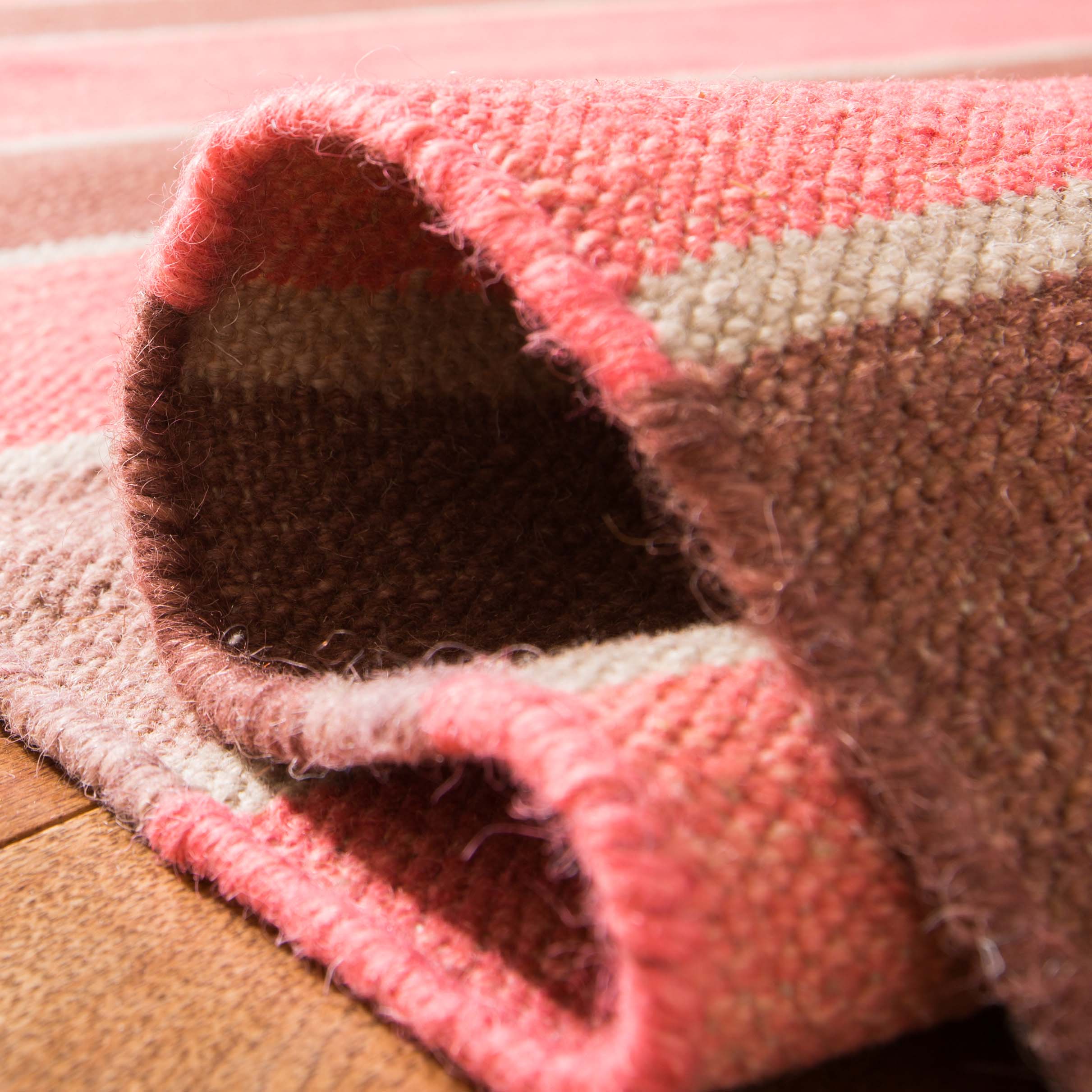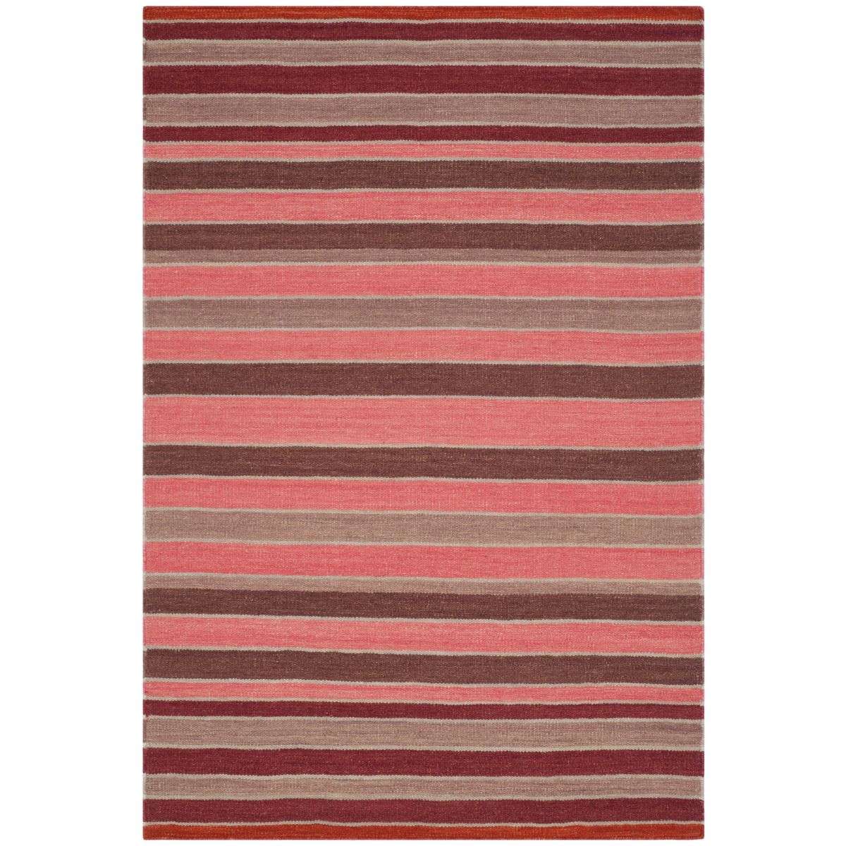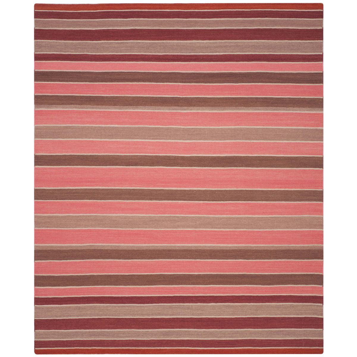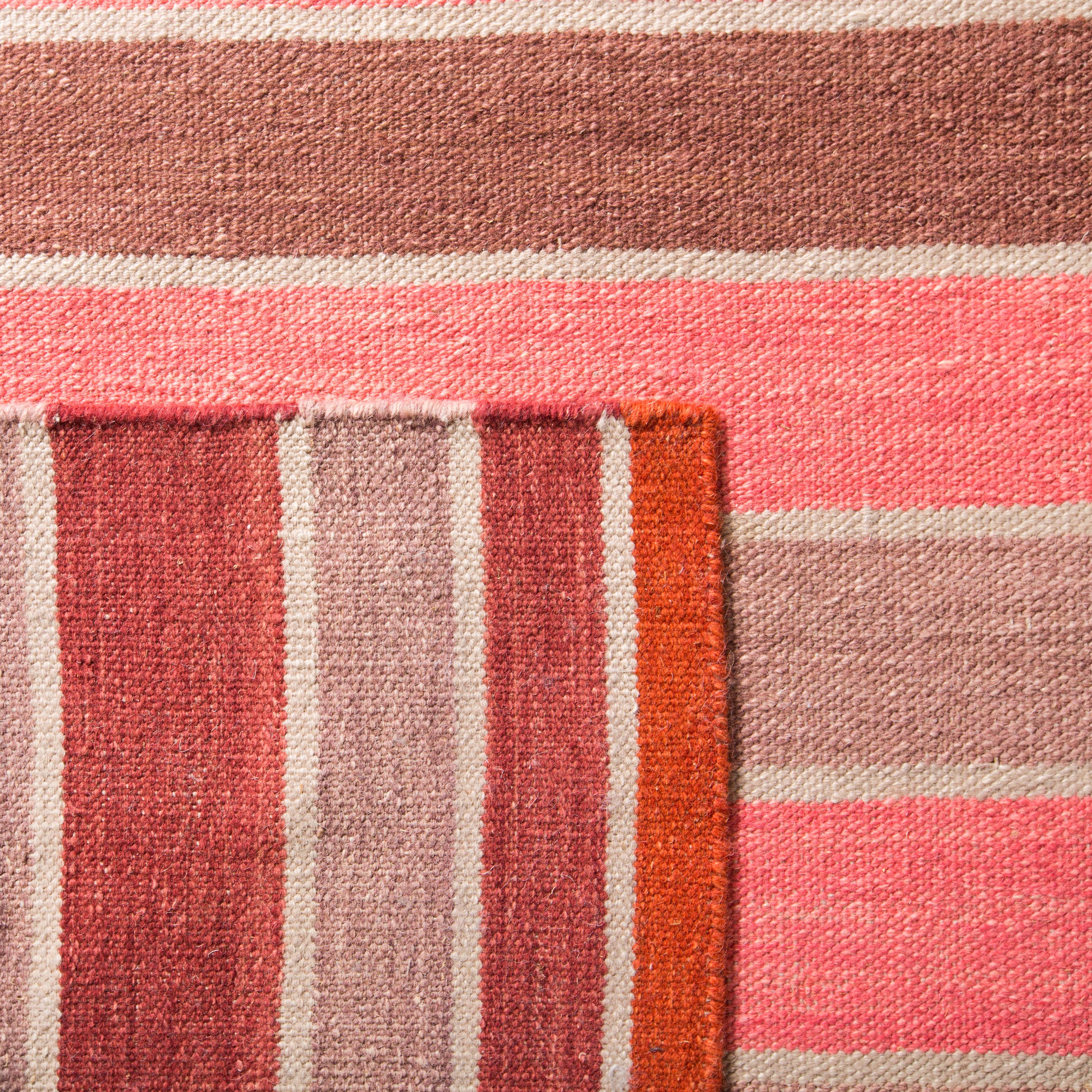 Crafted by skilled artisans in India, the rug showcases a dynamic striped pattern with a harmonious blend of rich and cozy hues that will effortlessly complement your decor. The horizontal stripes in varying shades of pink, red, and brown create a visual feast, lending an inviting and contemporary feel to any room.