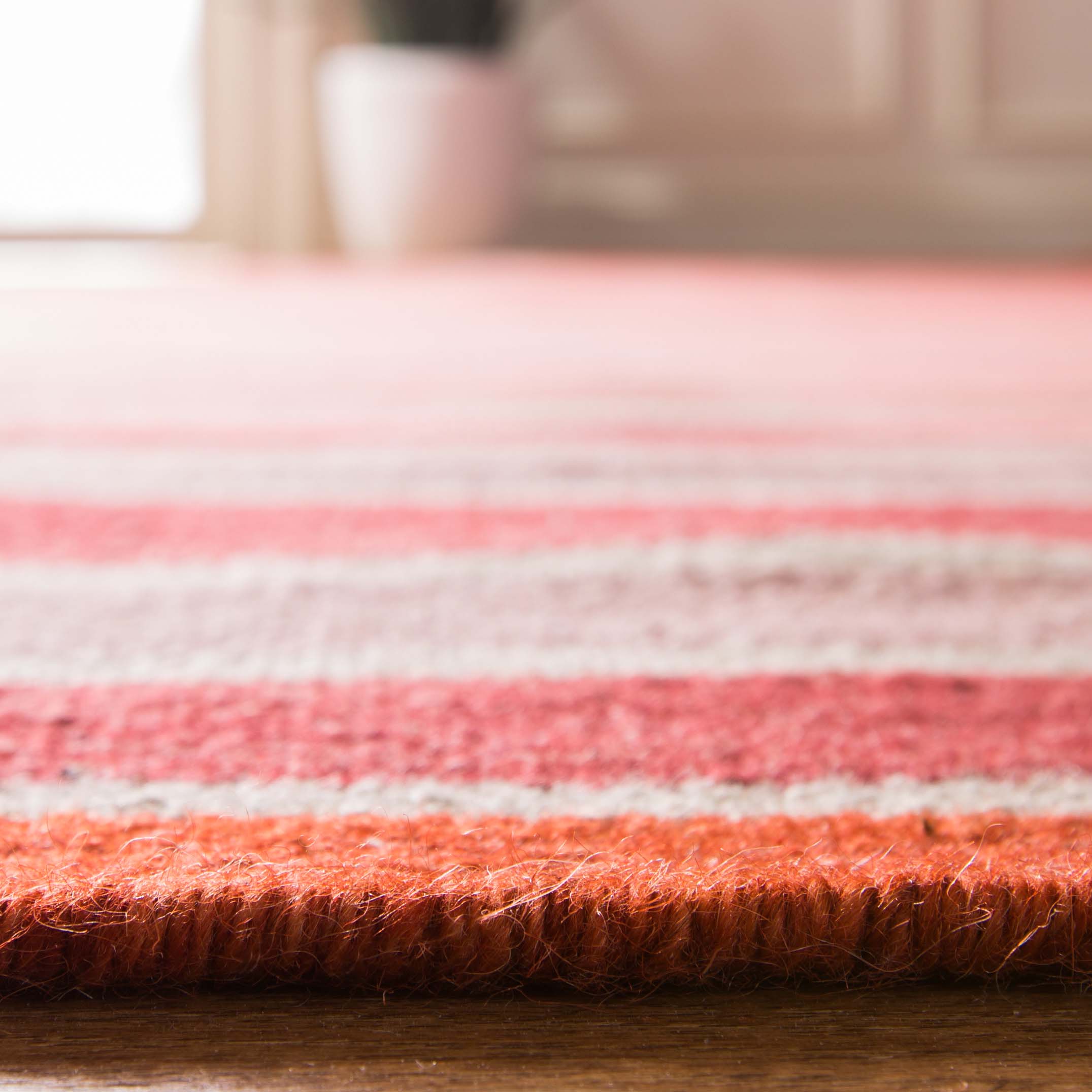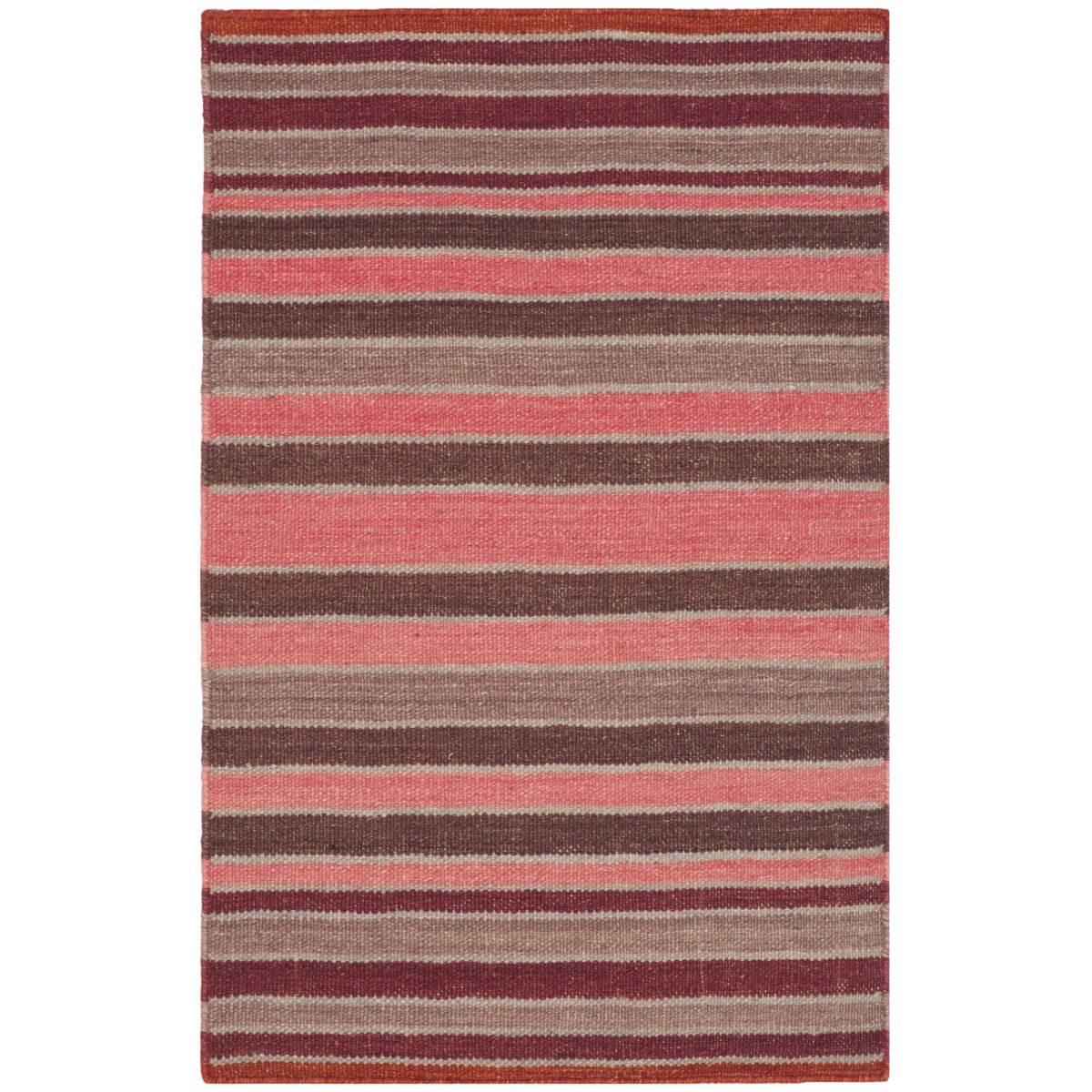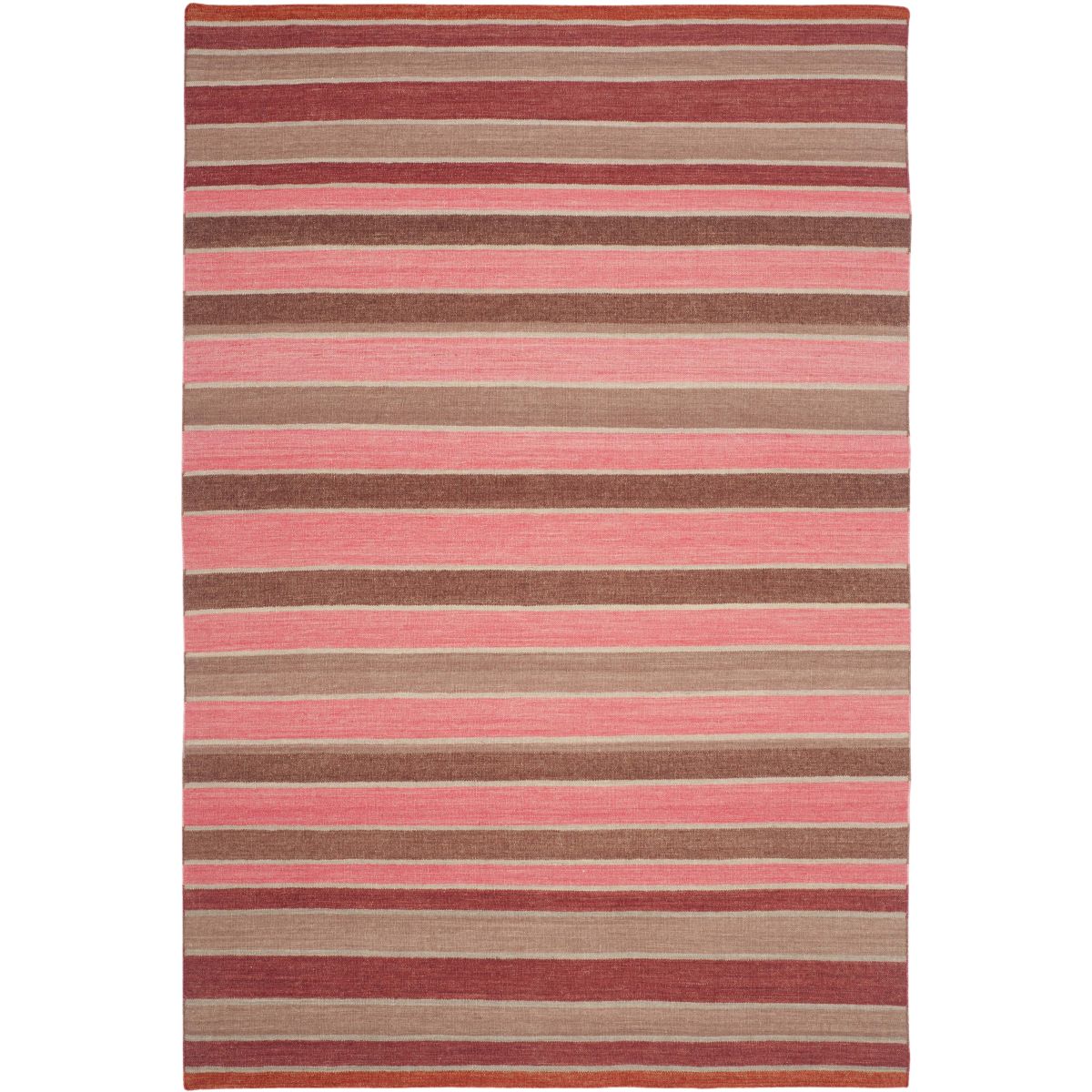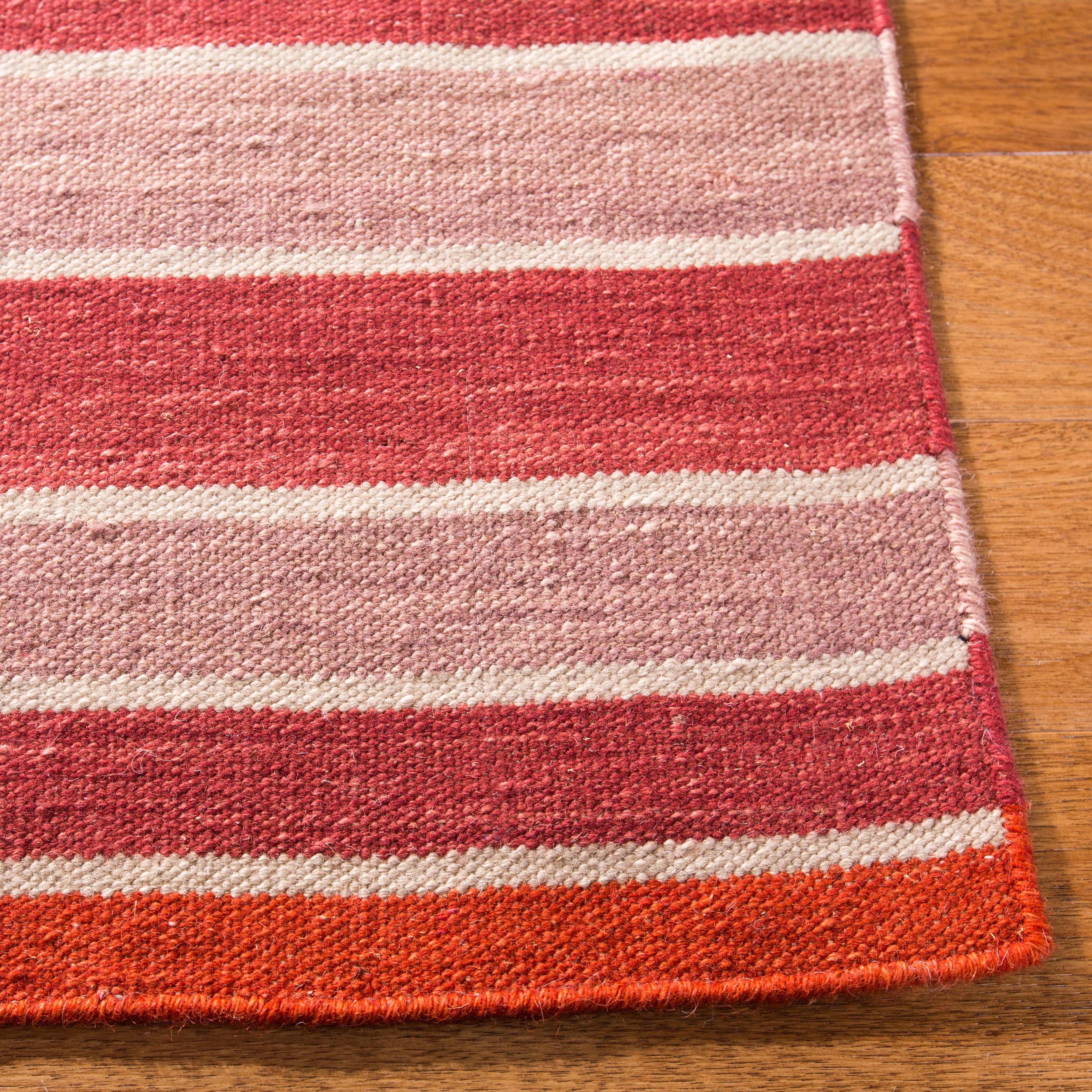 Crafted by skilled artisans in India, the rug showcases a dynamic striped pattern with a harmonious blend of rich and cozy hues that will effortlessly complement your decor. The horizontal stripes in varying shades of pink, red, and brown create a visual feast, lending an inviting and contemporary feel to any room.