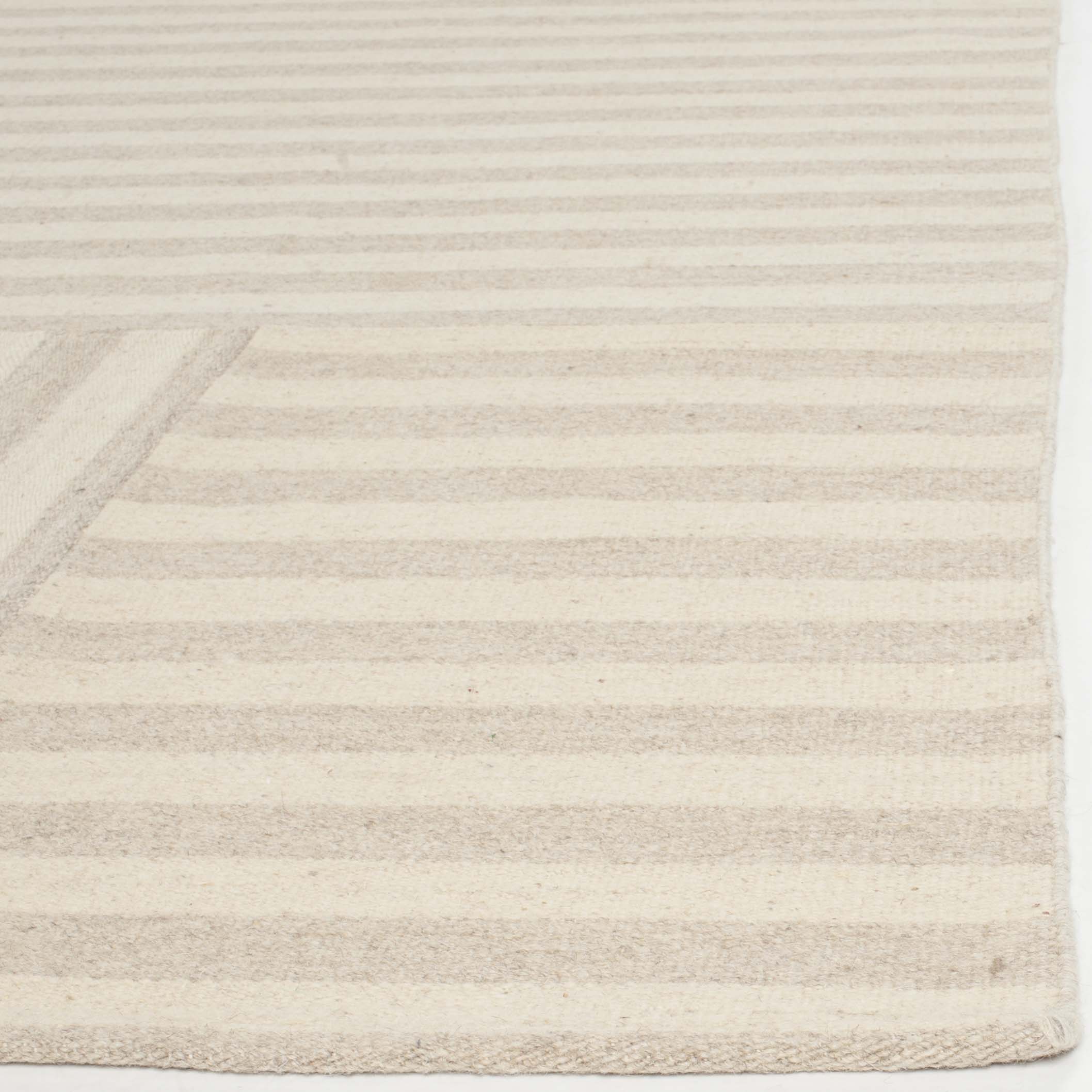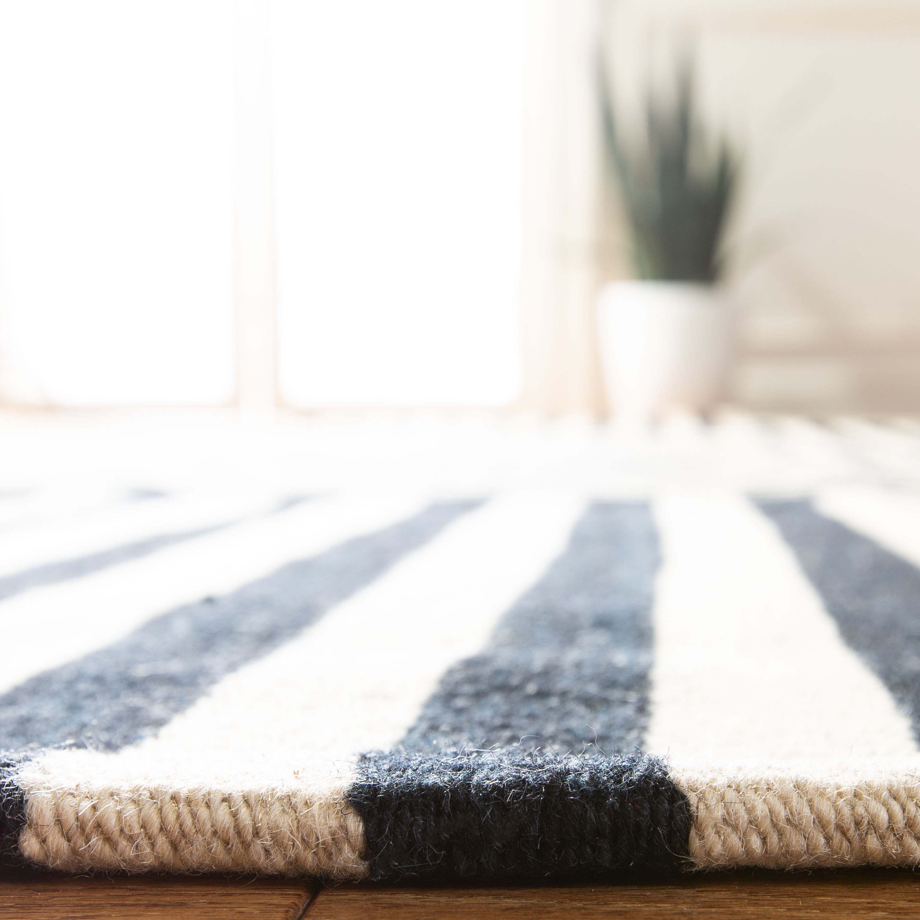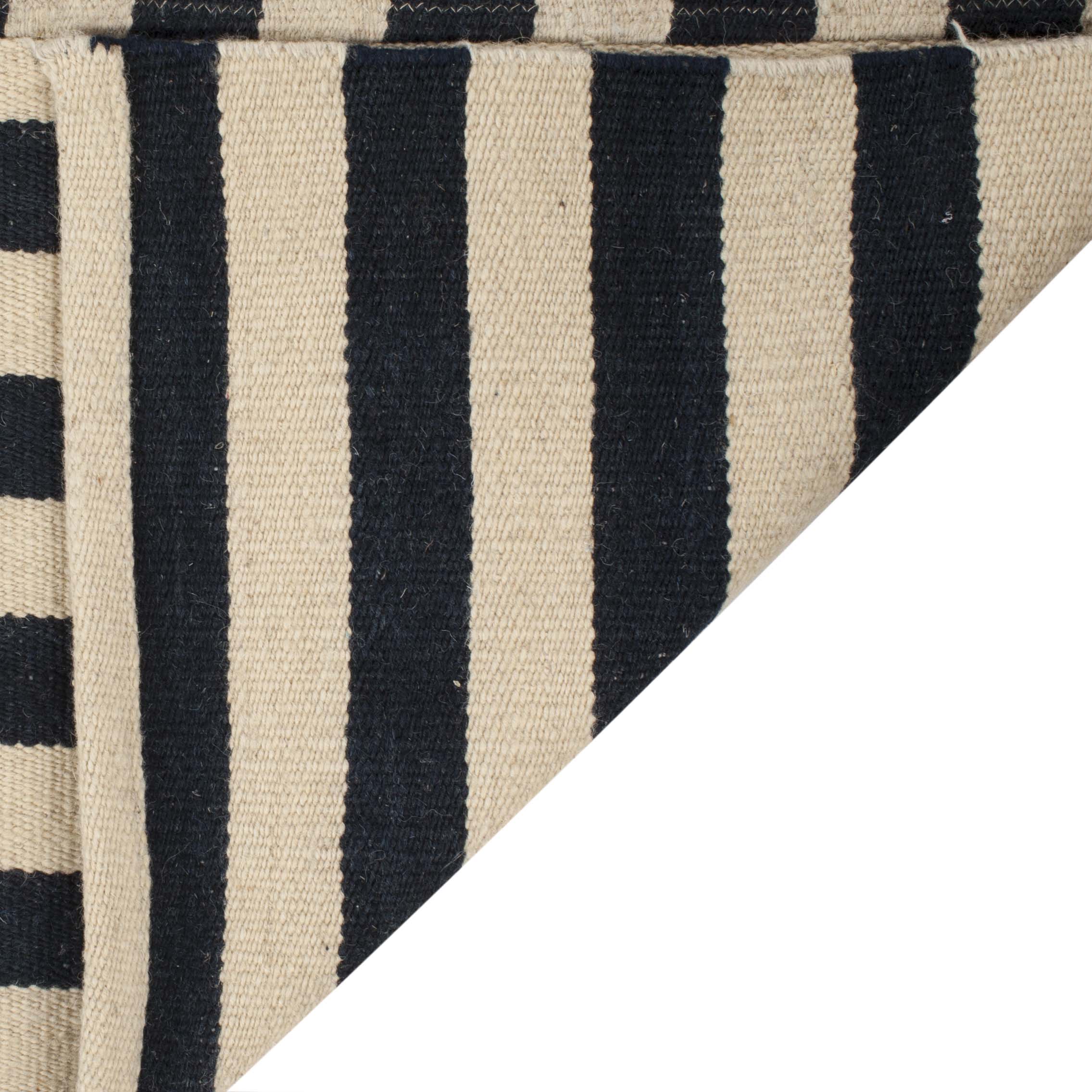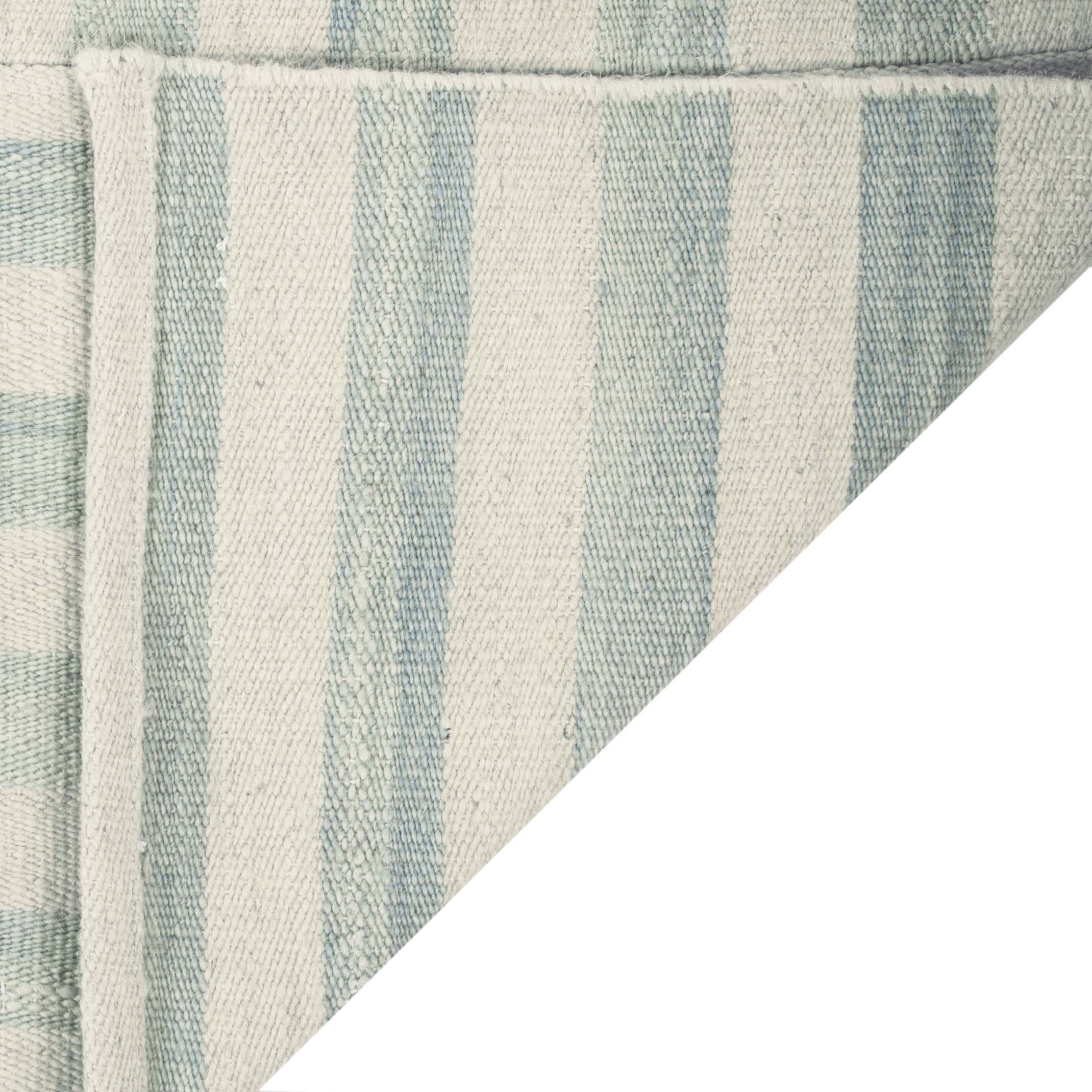 The rug pattern, inspired by a harmonious blend of stripes, accents the rug with a simplistic, yet sophisticated design. This charming tapestry is a nod to traditional craftsmanship, updated with a modern style that complements any room, from your home office to the cozy corner of your living room. Add a touch of elegance and comfort to your floor with this handcrafted gem.