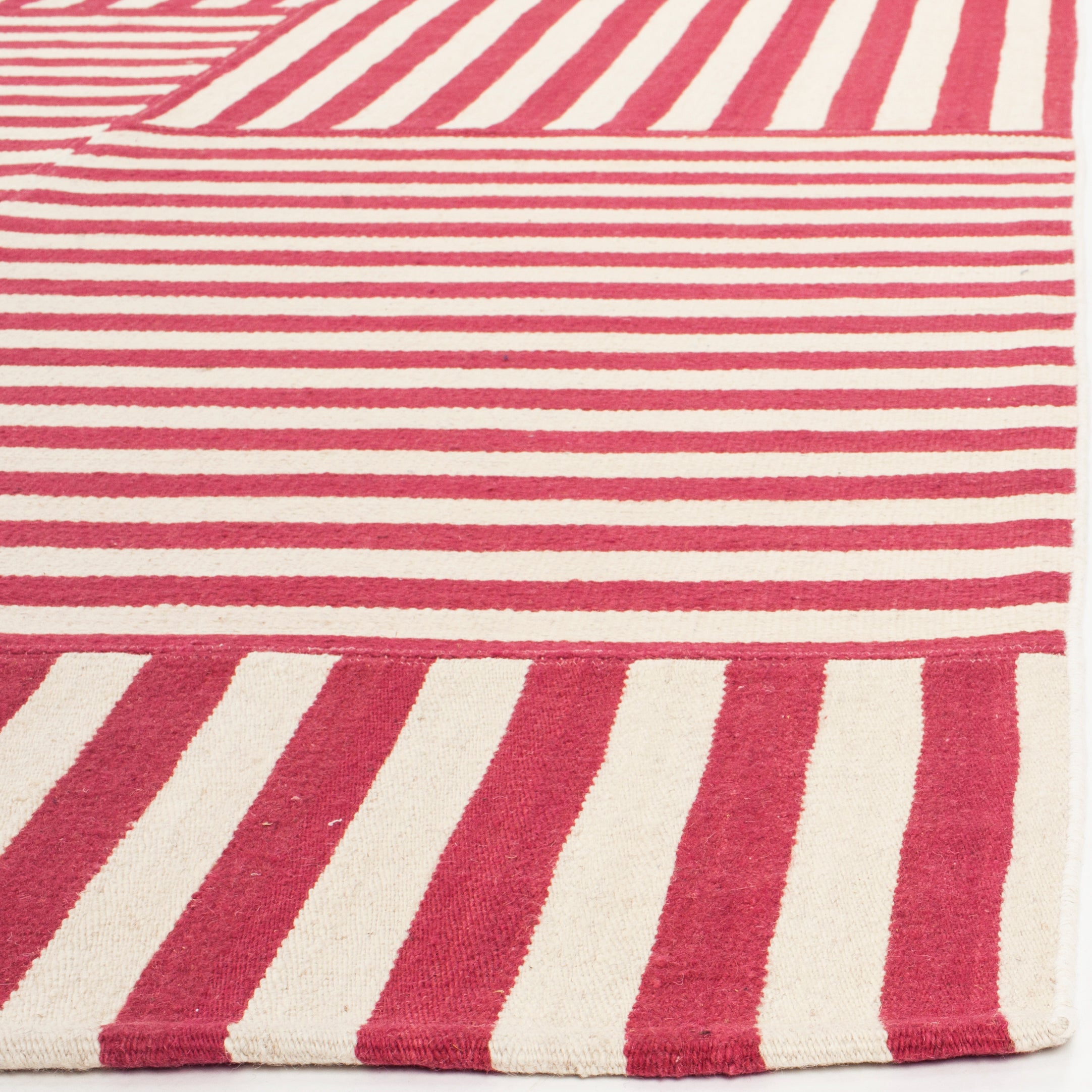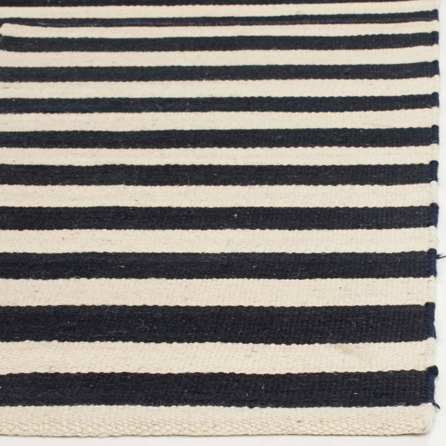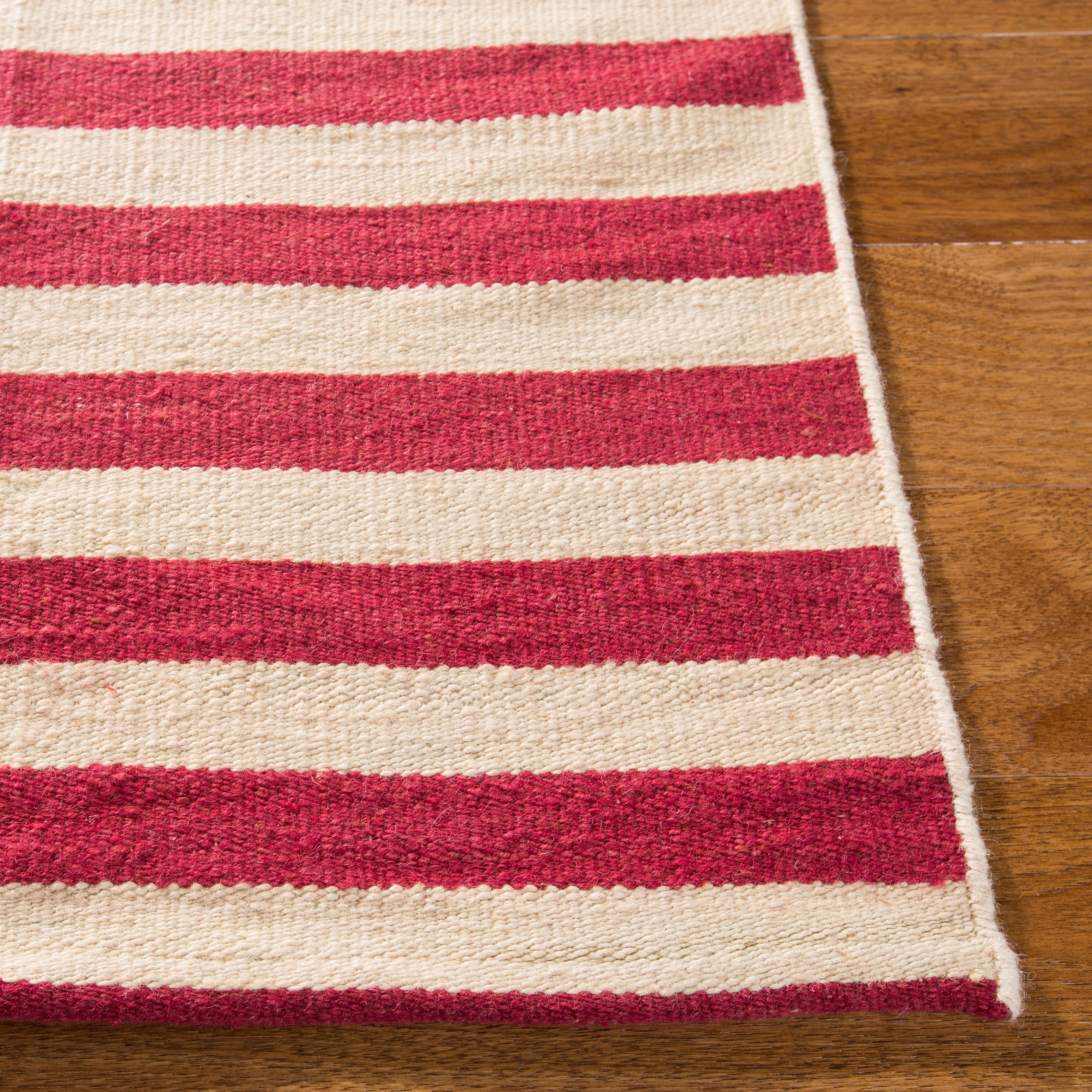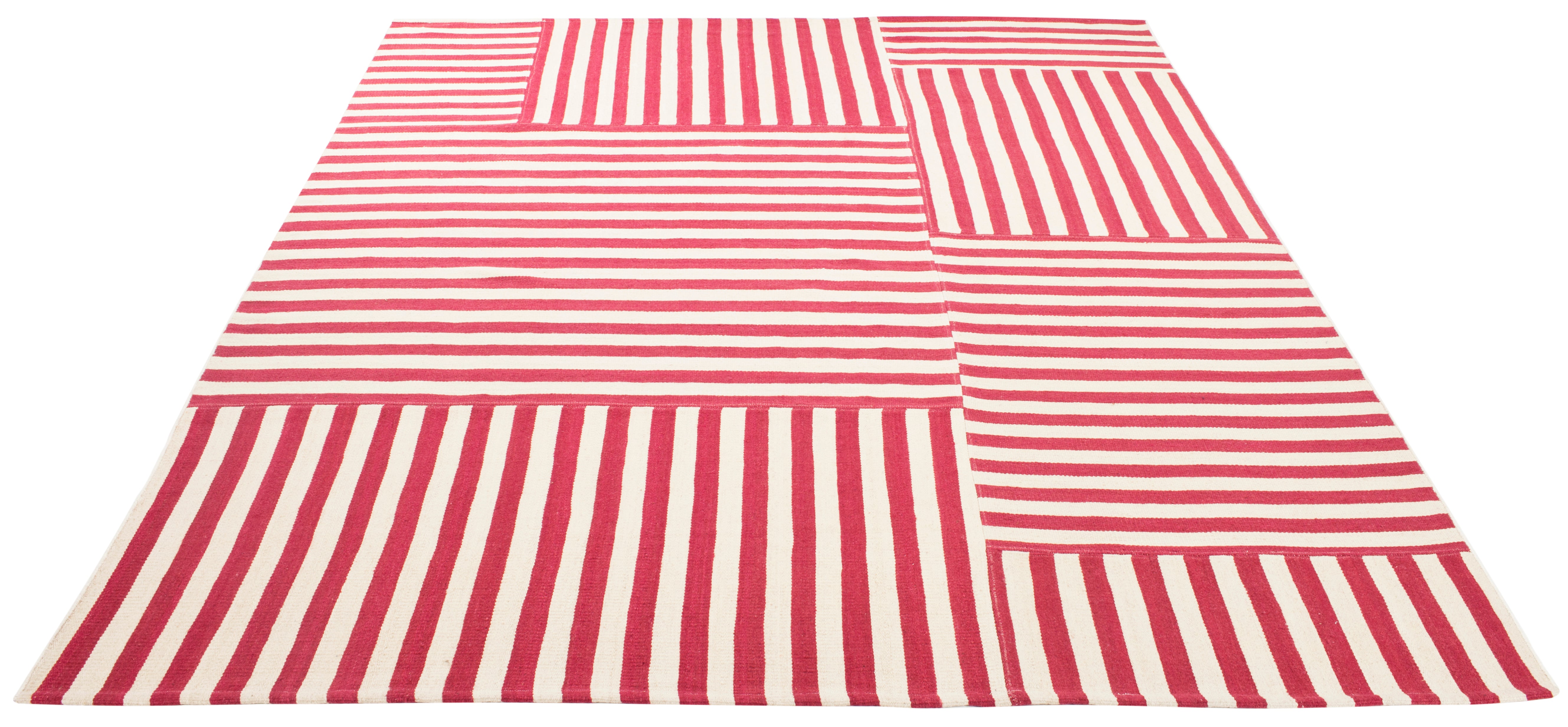The rug pattern, inspired by a harmonious blend of stripes, accents the rug with a simplistic, yet sophisticated design. This charming tapestry is a nod to traditional craftsmanship, updated with a modern style that complements any room, from your home office to the cozy corner of your living room. Add a touch of elegance and comfort to your floor with this handcrafted gem.