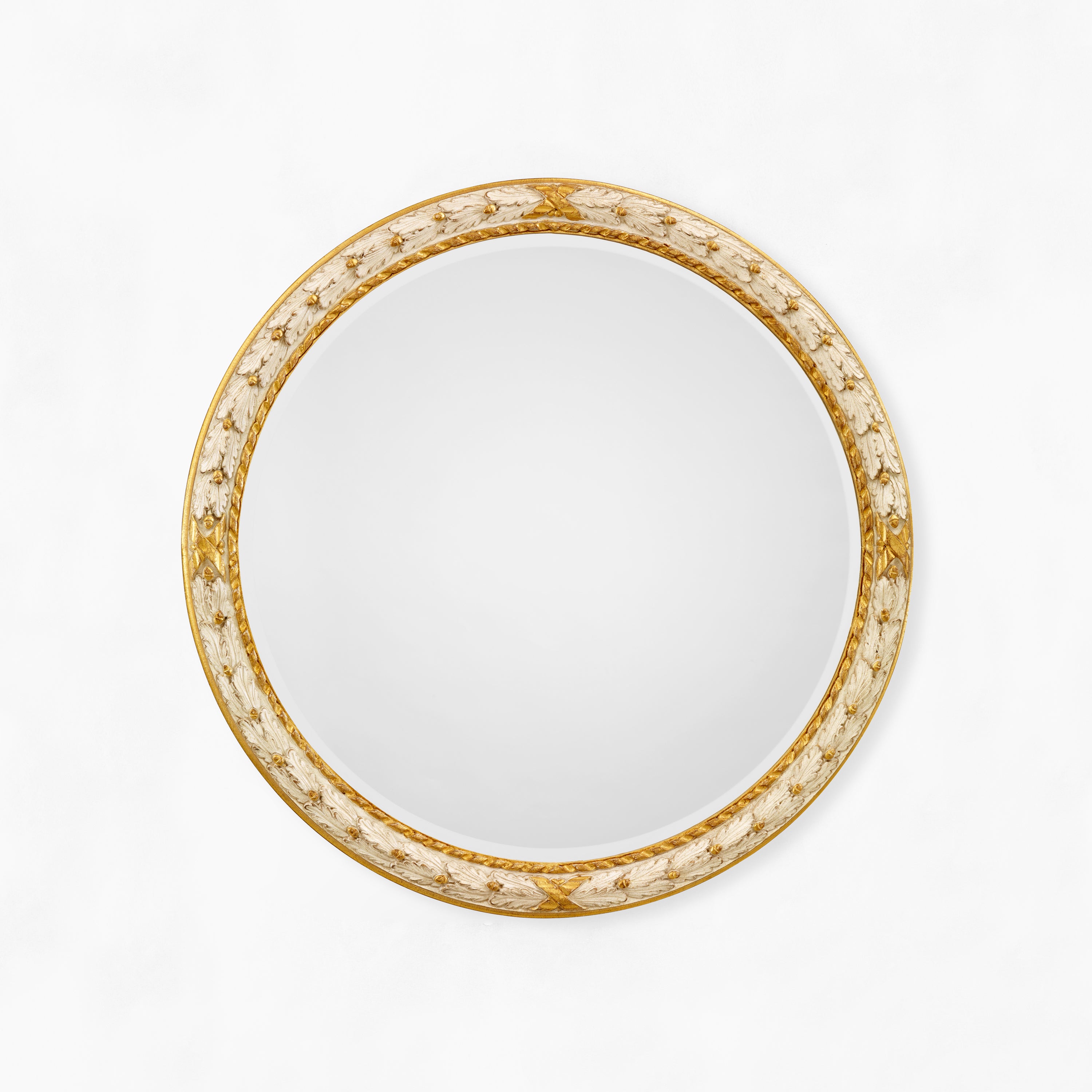• Carved wood mirror with antique white and gold leaf finish