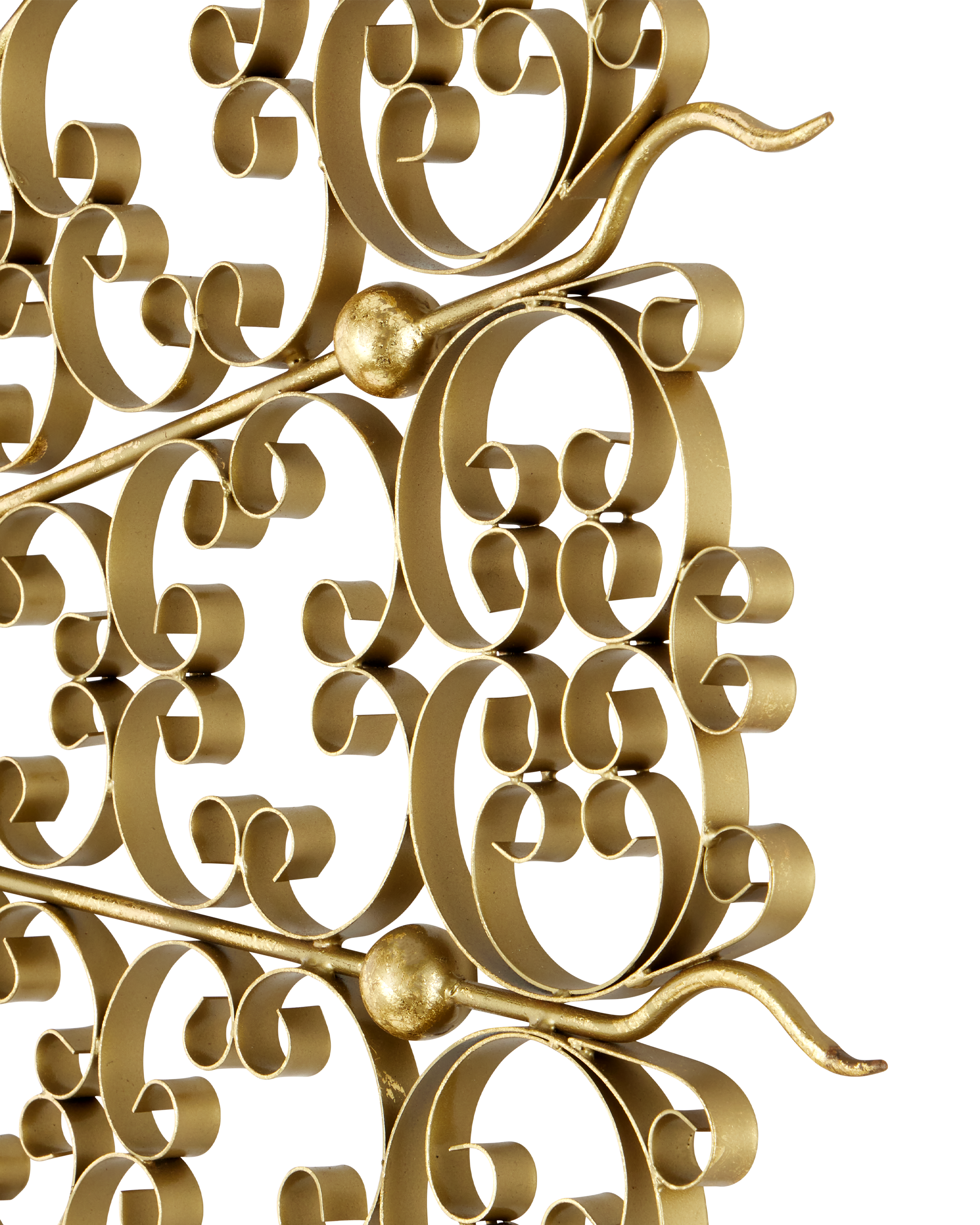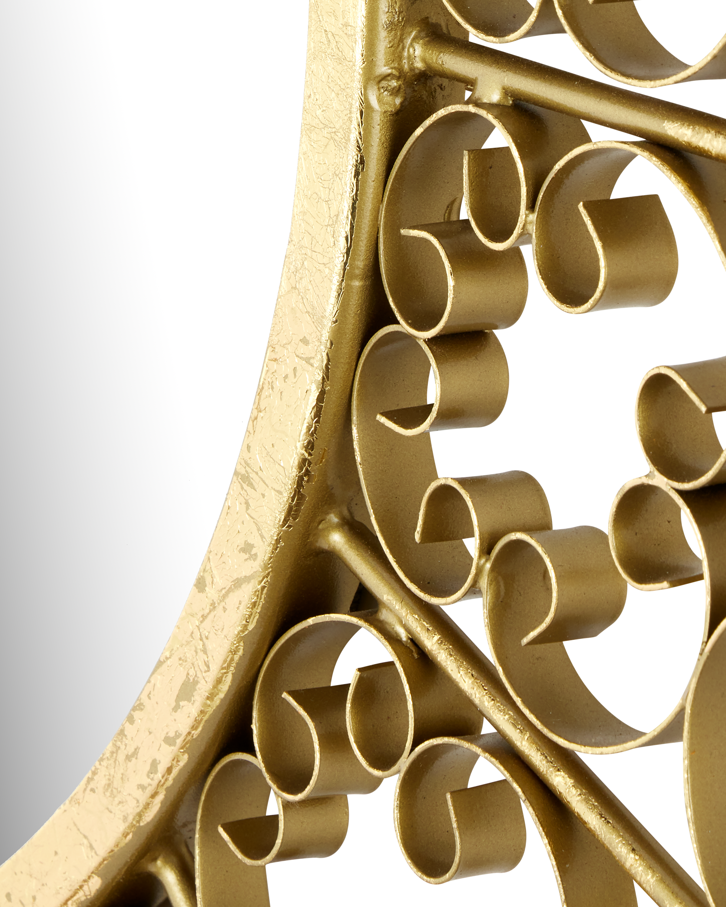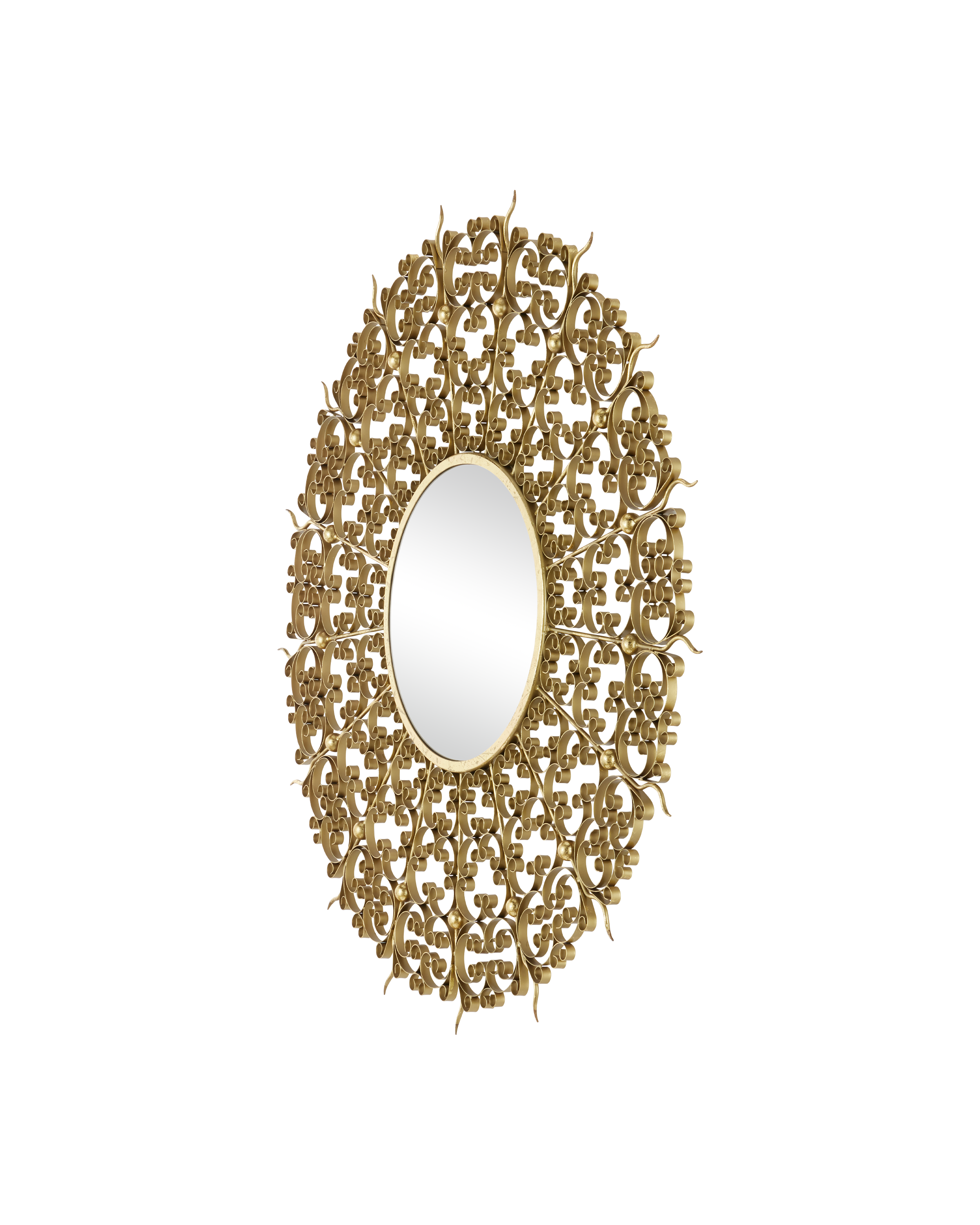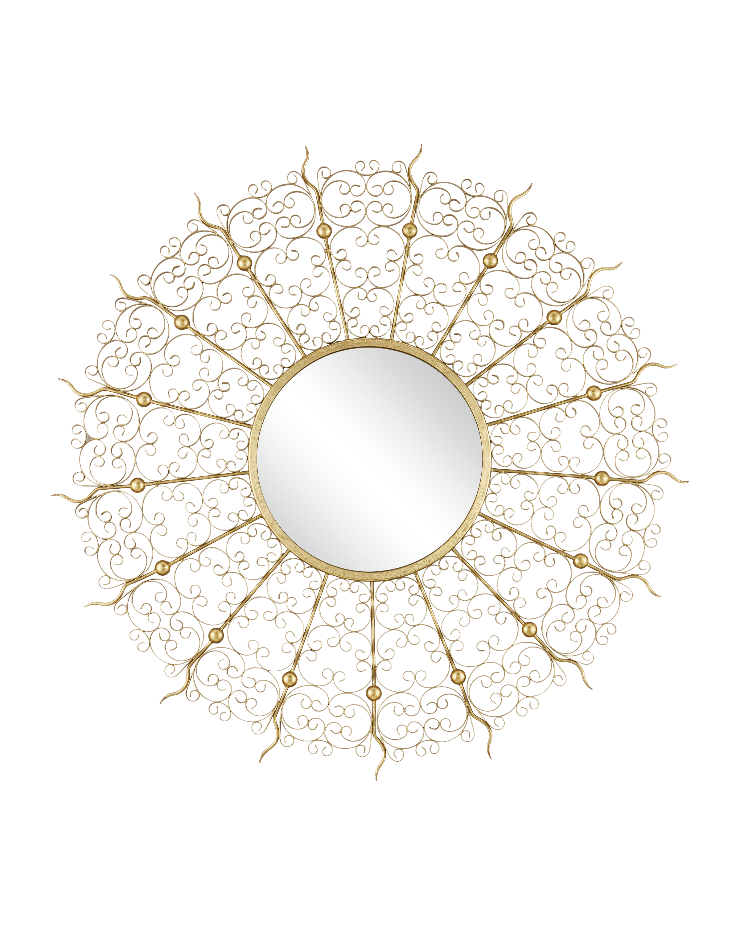 Add a touch of timeless elegance to your space with the Levain Round Mirror. Featuring a stunning convex mirror at its center, this eye-catching piece is framed by intricate ornamental scrollwork that echoes the charm of vintage gates and ornate screens. The swirling metal design with a gold leaf finish radiates outward in a dramatic sunburst shape, creating a sense of movement and sophistication.