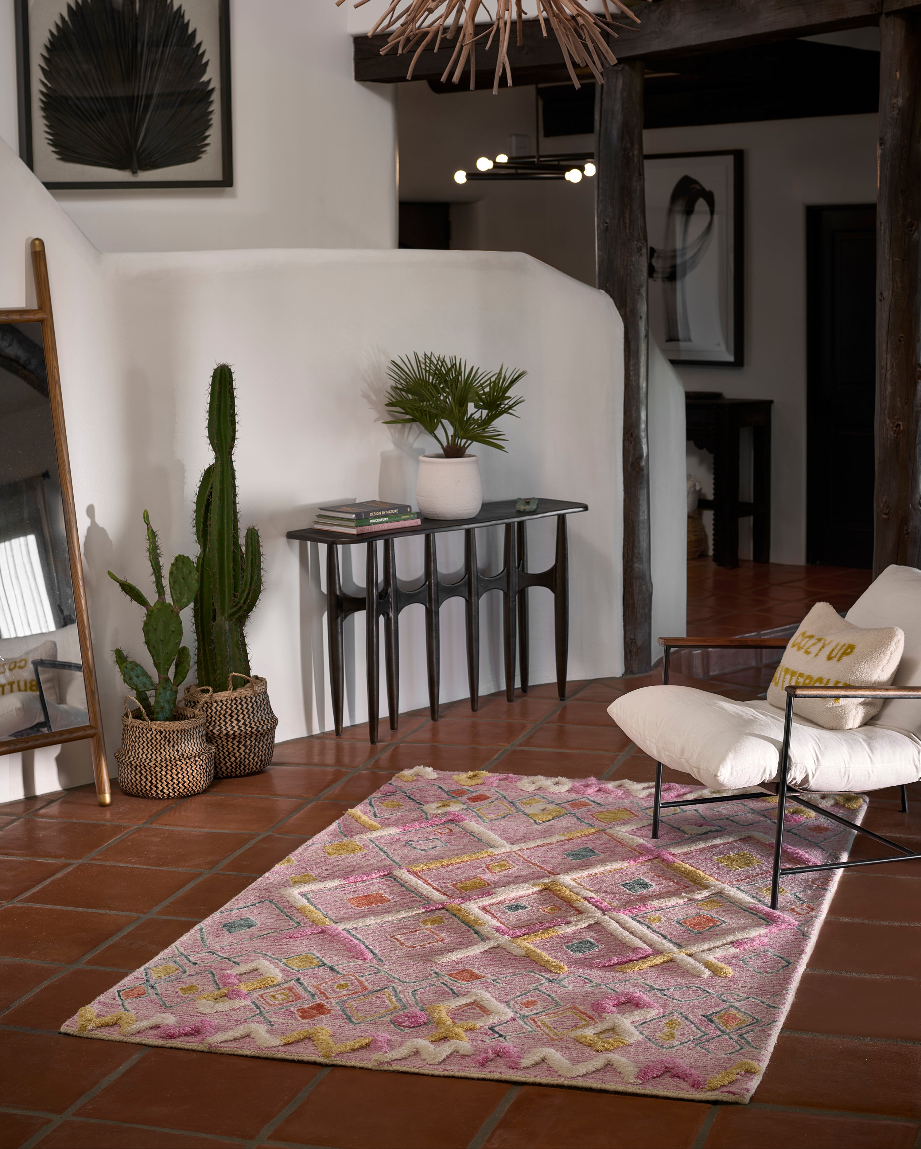 Hand tufted from 100% wool; this playful pink Moroccan inspired rug offers some fun geometric patterns to brighten up any interior. With differing pile heights between the taller lifted shag sections next to the shorter, more ribbed-style pile, your feet will feel all of the comfort provided by this fabulous rug; while delighting in the visual beauty of all the different textures.