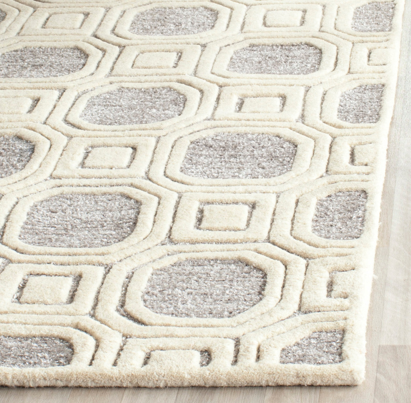In the beautifully textured Precious rug collection, patterns from quatrefoils to geometrics are hand-tufted of cut pile against a loop pile ground flecked with shimmering metallic yarn. Yarns in Precious rugs are a blend of polyester, wool and cotton.