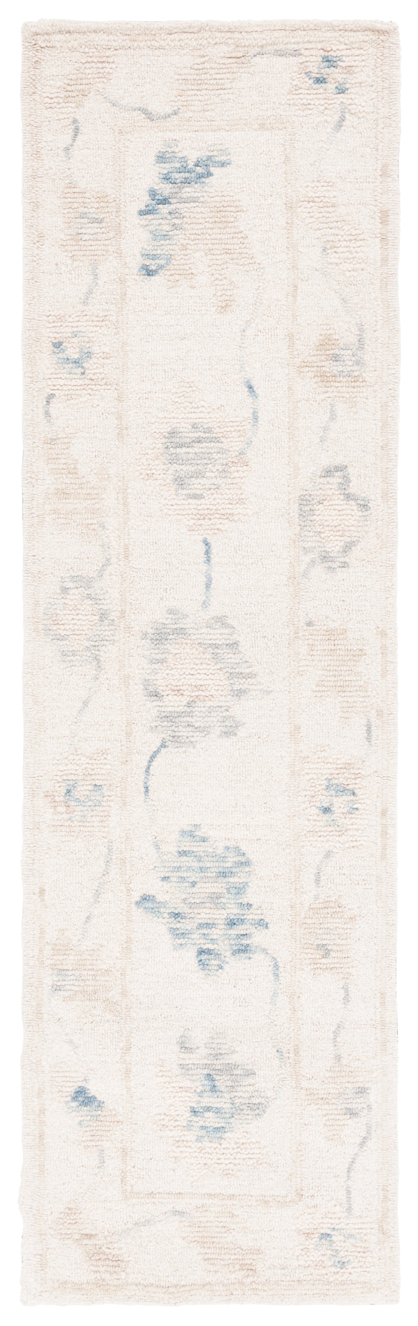 Enhance your living space with this exquisite hand-tufted runner, crafted in India with a luxurious blend of 80% wool and 20% cotton. Measuring 2'-3" X 8' and boasting a comfortable 3/8" pile height, this runner is perfect for high-traffic areas. The timeless ivory and beige colors, complemented by subtle blue accents, create a versatile contemporary style that seamlessly integrates with any decor. While this elegant piece is not machine washable and lacks slip resistance, its quality and design promise longevity and a touch of sophistication that will elevate any corridor or narrow space.