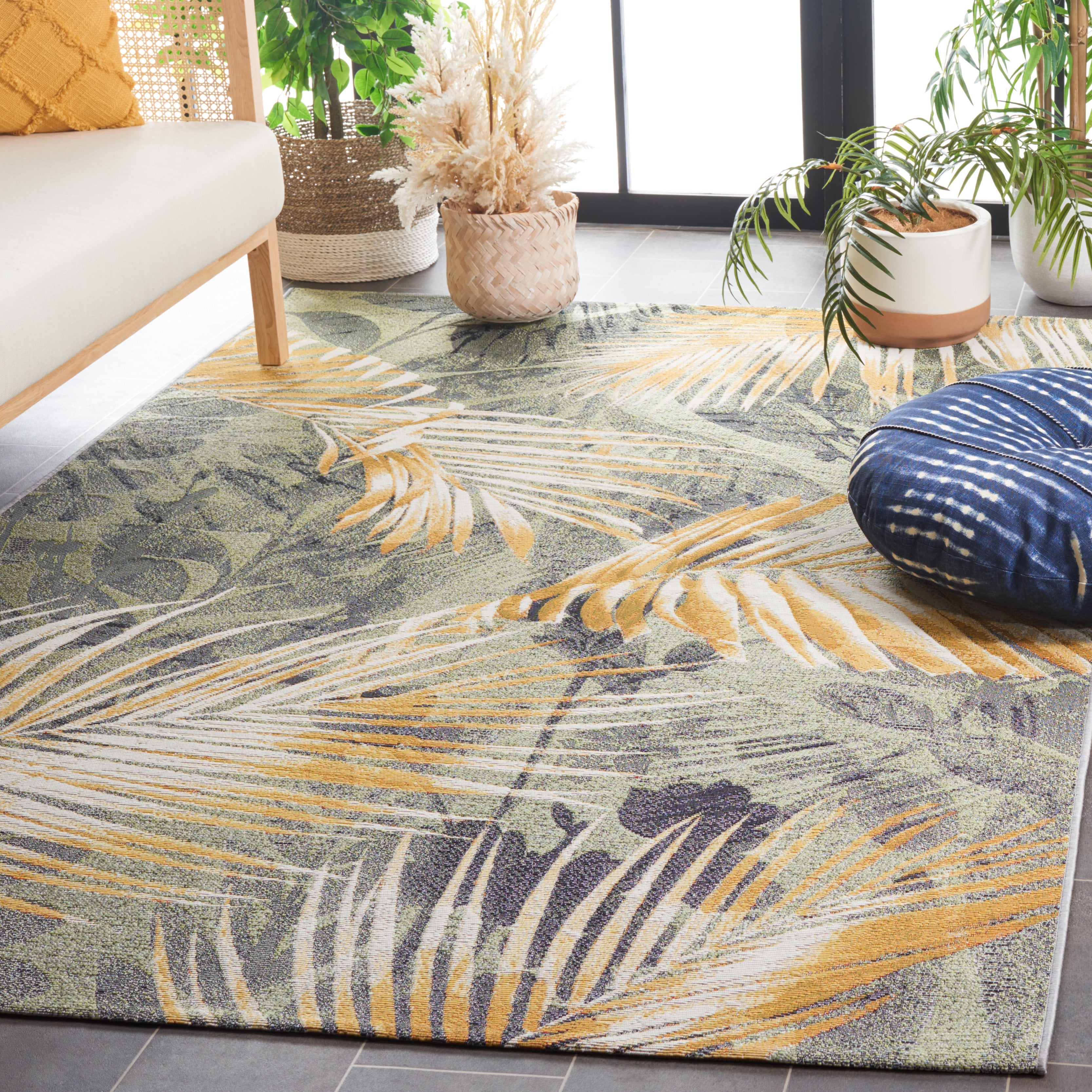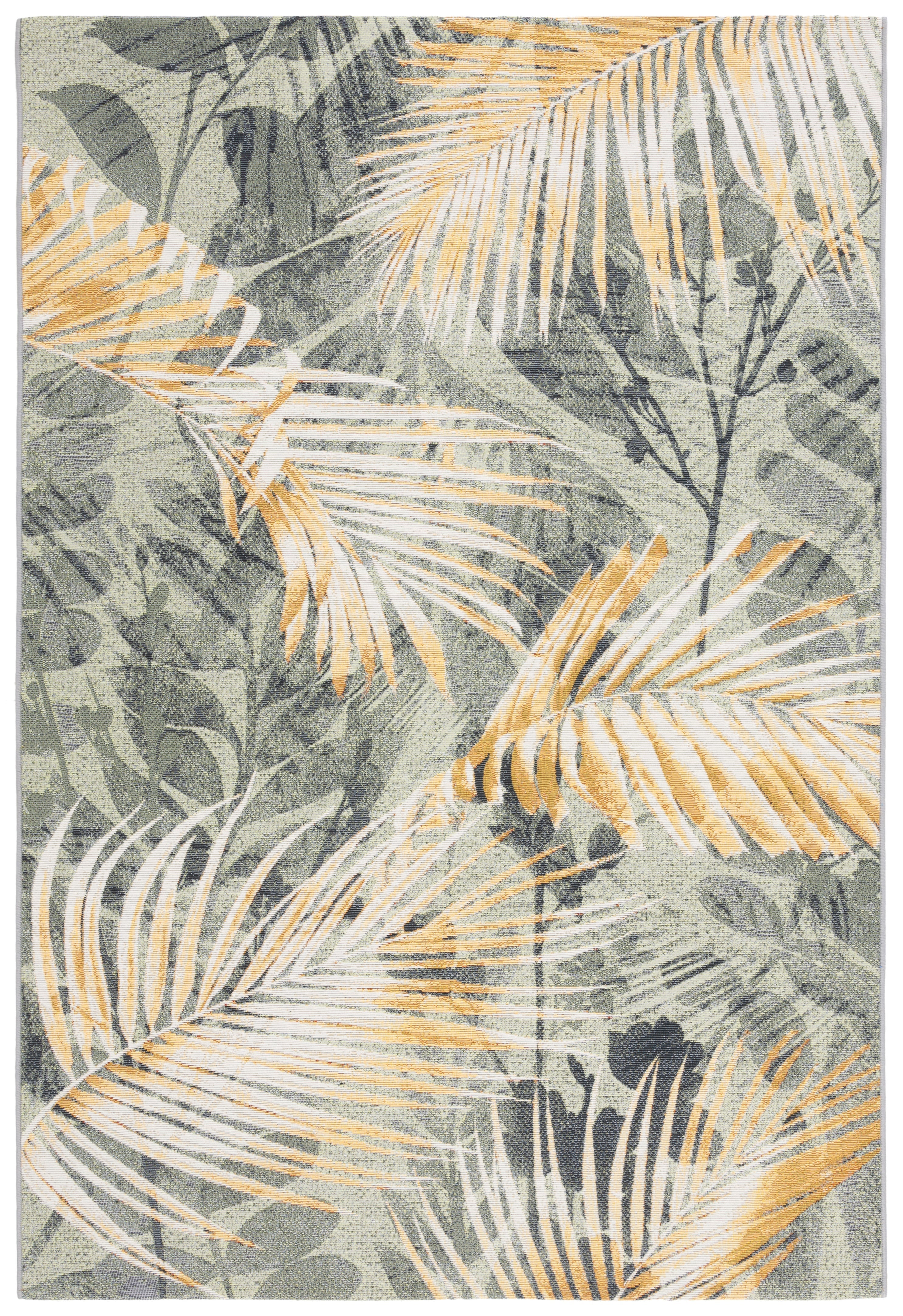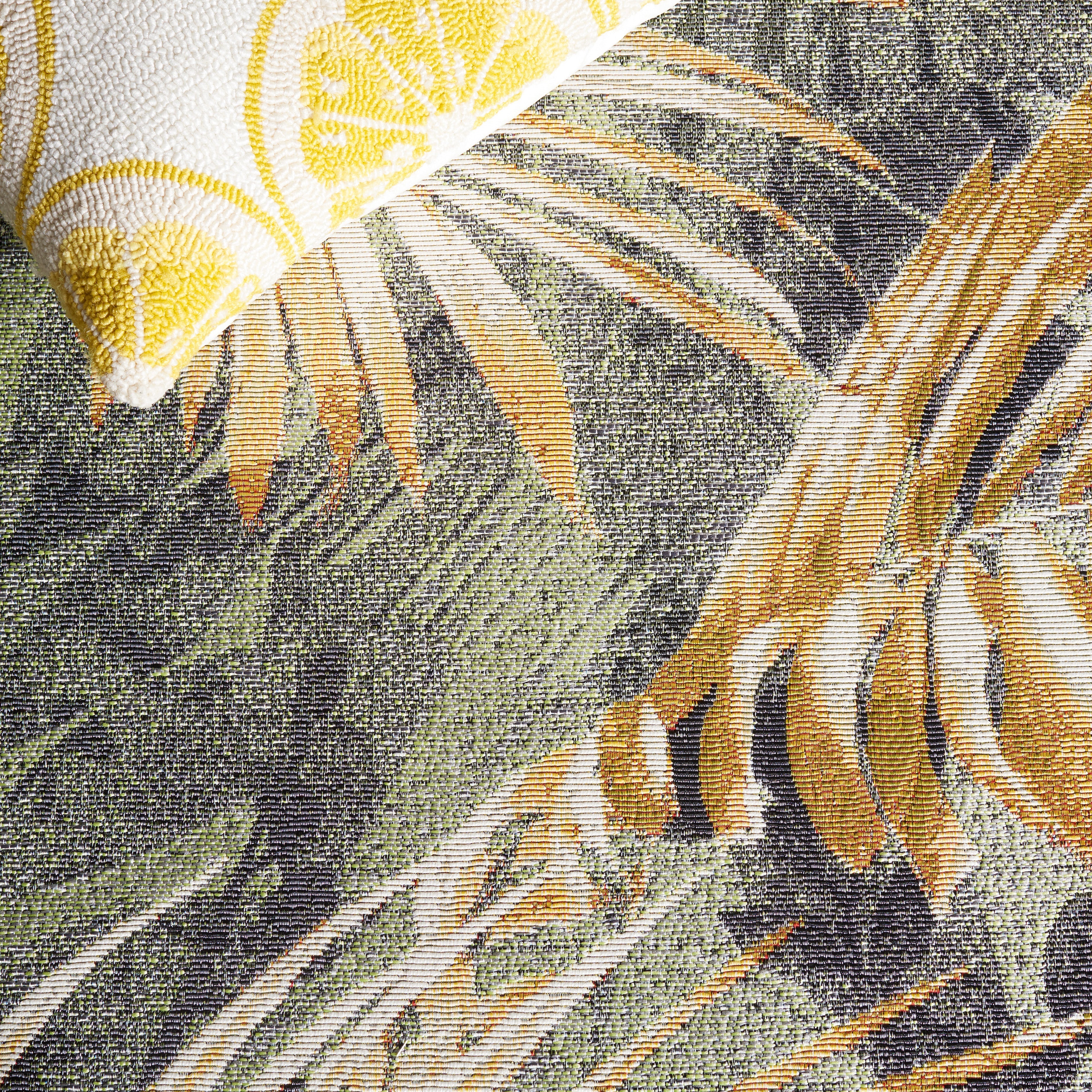 The alluring pattern of the rug features an elegant display of tropical leaves that paints a lush oasis in shades of green, highlighted with bold accents of black and radiant touches of gold. These colors come together to create a vivid yet sophisticated palette that can enhance a variety of decor styles.