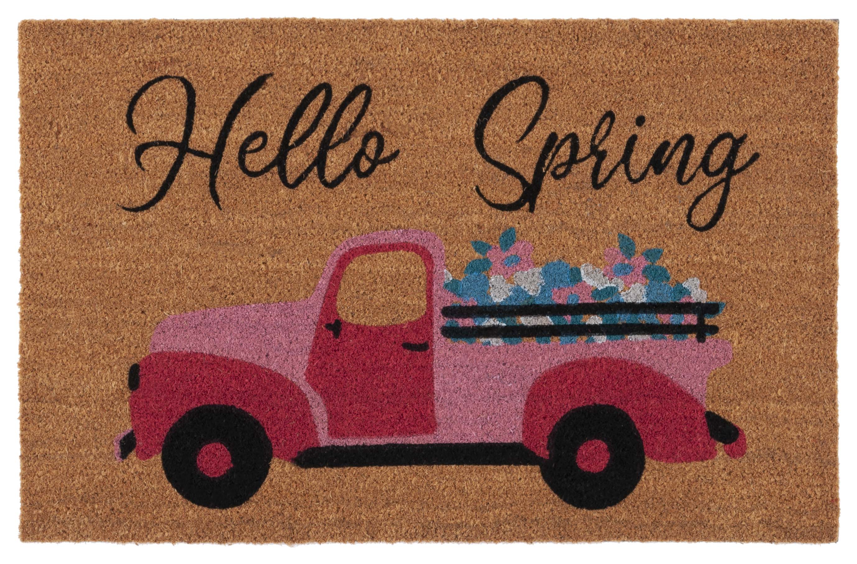 This accent rug boasts a natural color palette that provides a serene foundation for its inviting design. Featuring a vintage-style truck loaded with colorful spring flowers, it cheerfully welcomes the season with the whimsical greeting, "Hello Spring," scripted above in an elegant font. The playful imagery and heartfelt message make it a delightful addition to your entryway, kitchen, or any area where a cozy, springtime ambiance is desired.