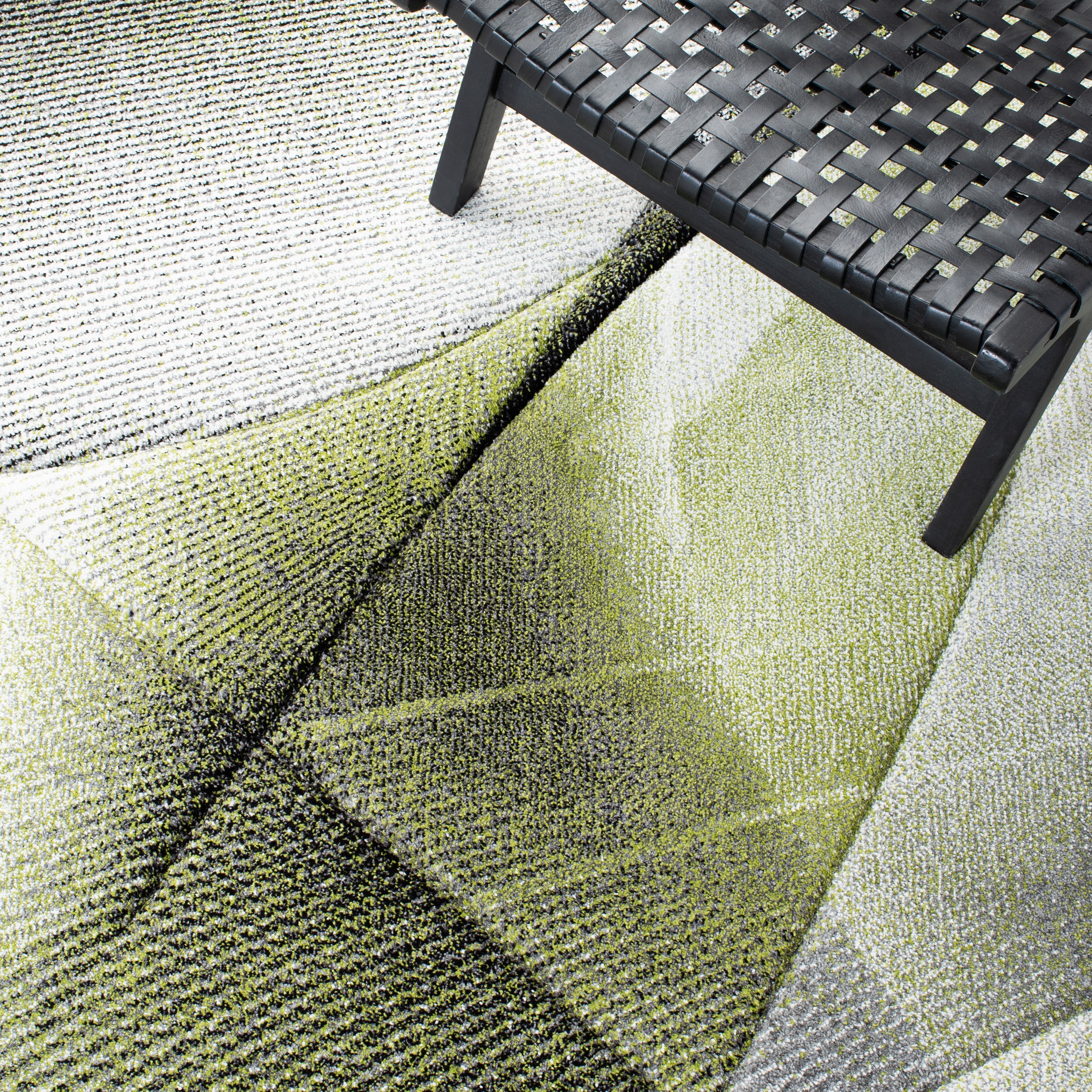 At the heart of its allure is the rug's pattern, a compelling geometric design that interplays bold lines and color transitions in a mesmerizing fashion. The sharp angles and the sophisticated color palette are reminiscent of a modern artist?s canvas, inviting interpretation and admiration in equal measure.