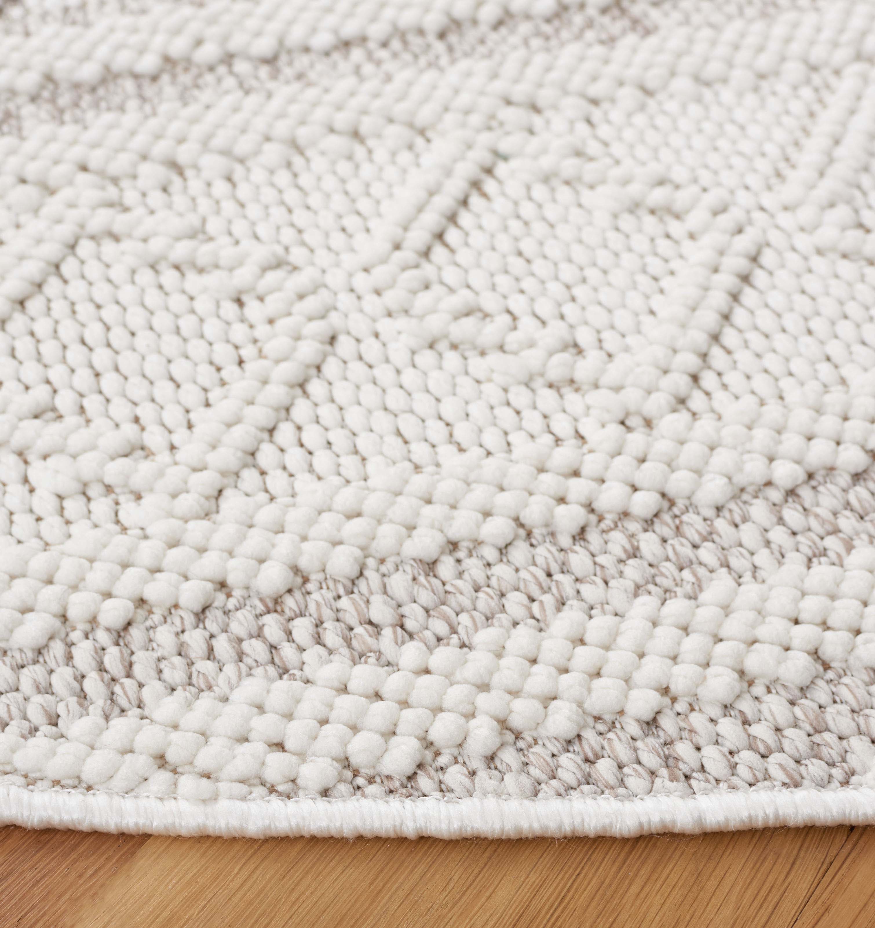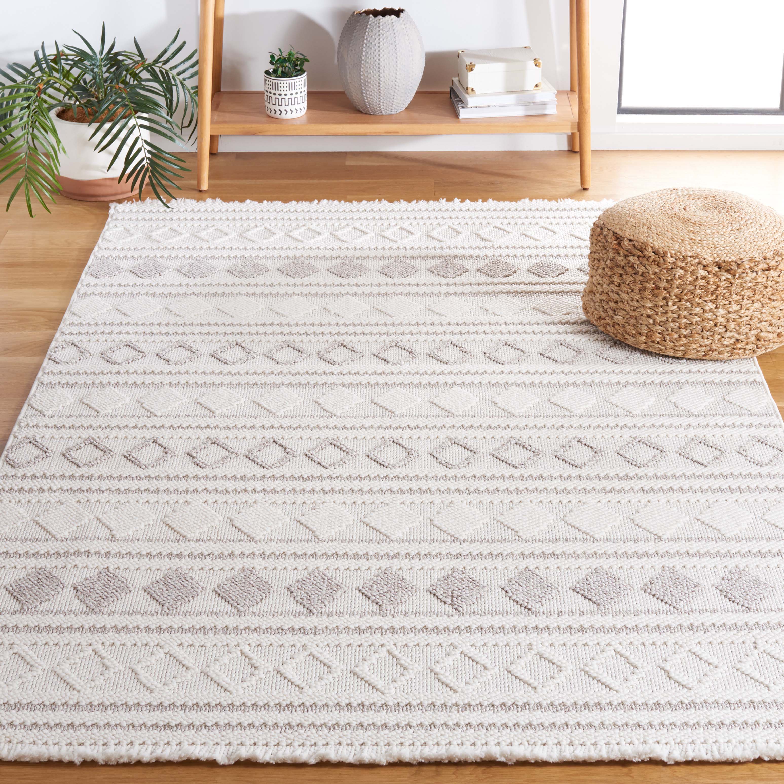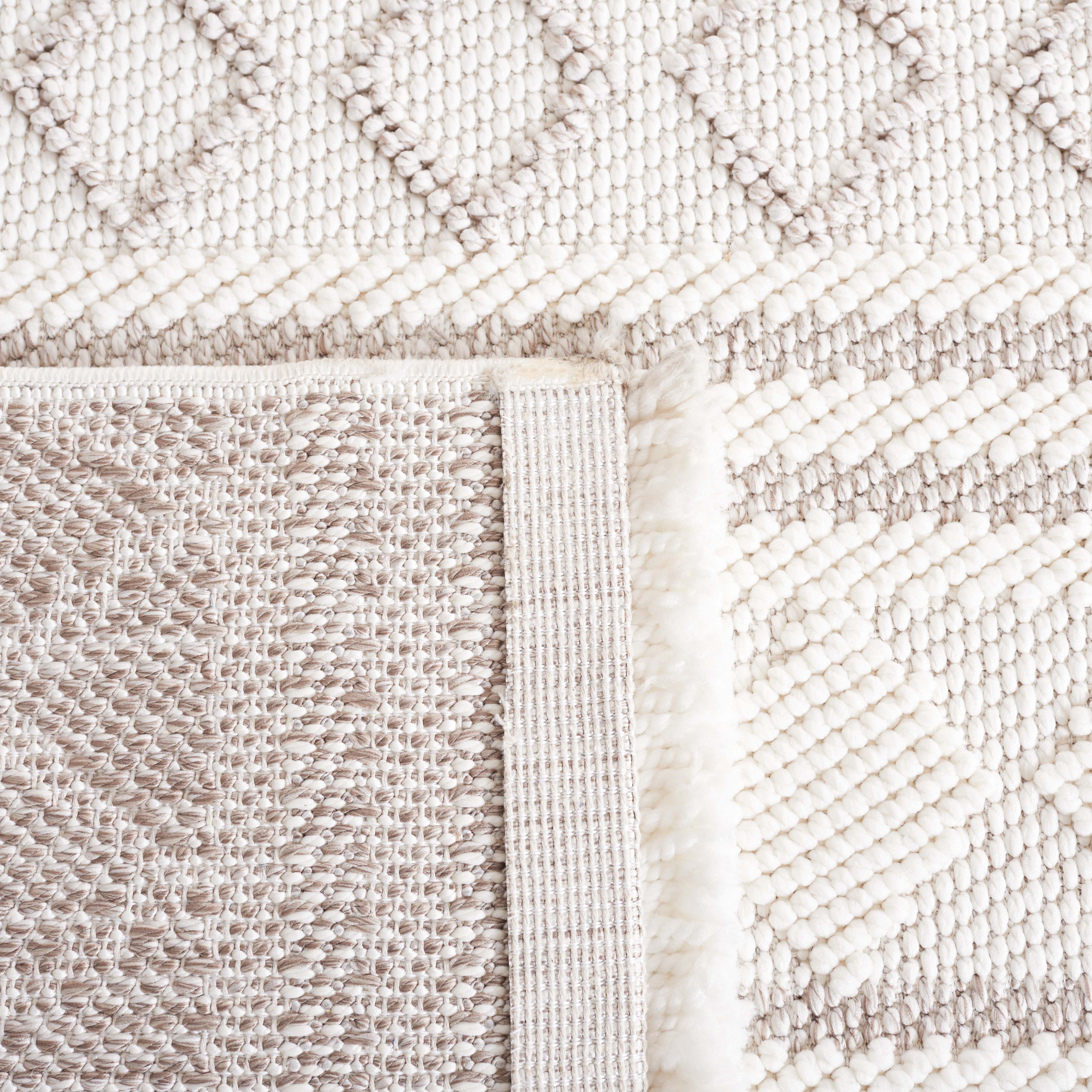 The rug showcases a serene pattern that combines repeating geometric diamond motifs with textured stripes, creating a sophisticated yet approachable aesthetic. Its ivory and beige colors offer a neutral palette that complements a wide range of interior designs, from minimalist to more elaborate themes.