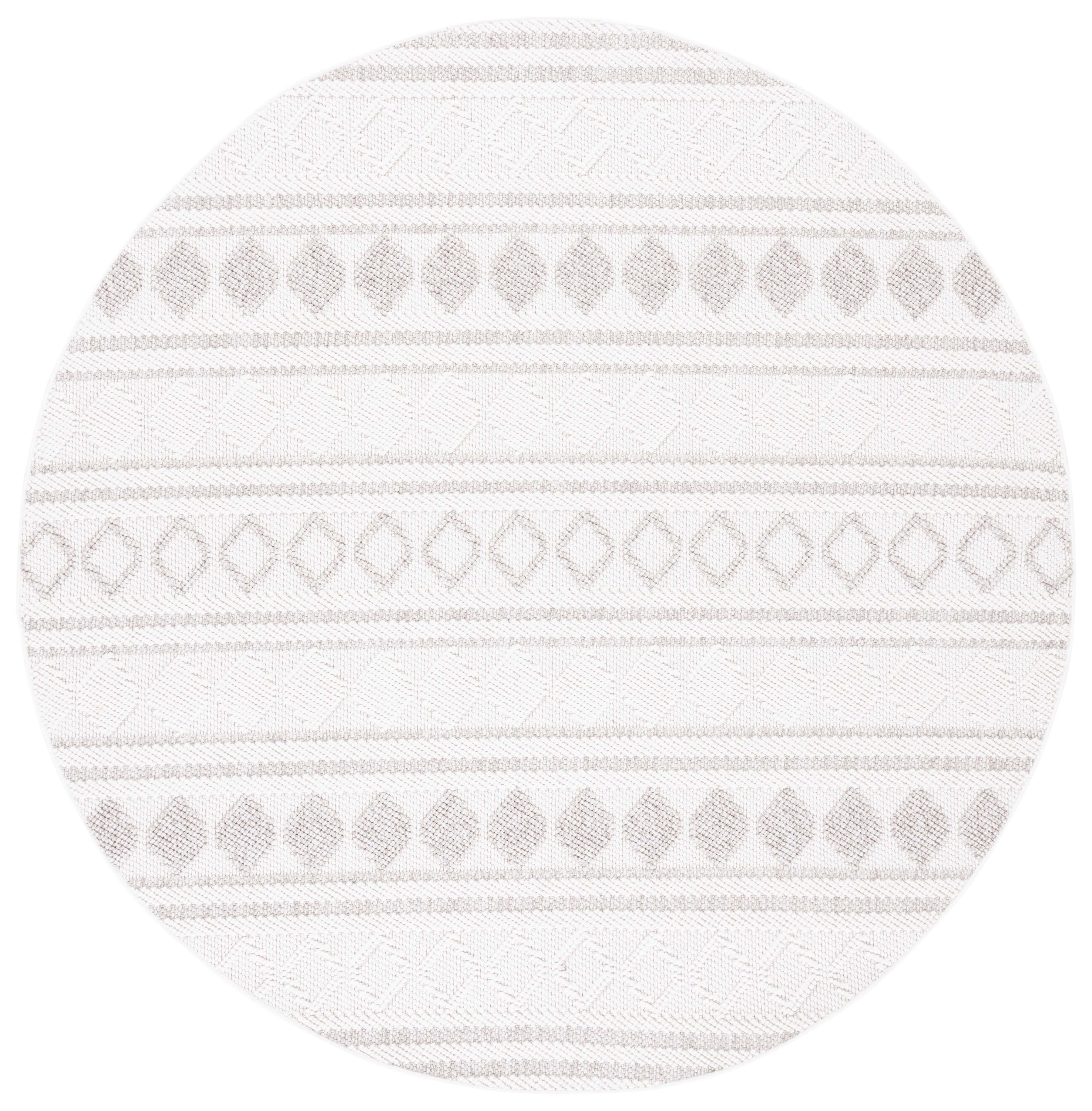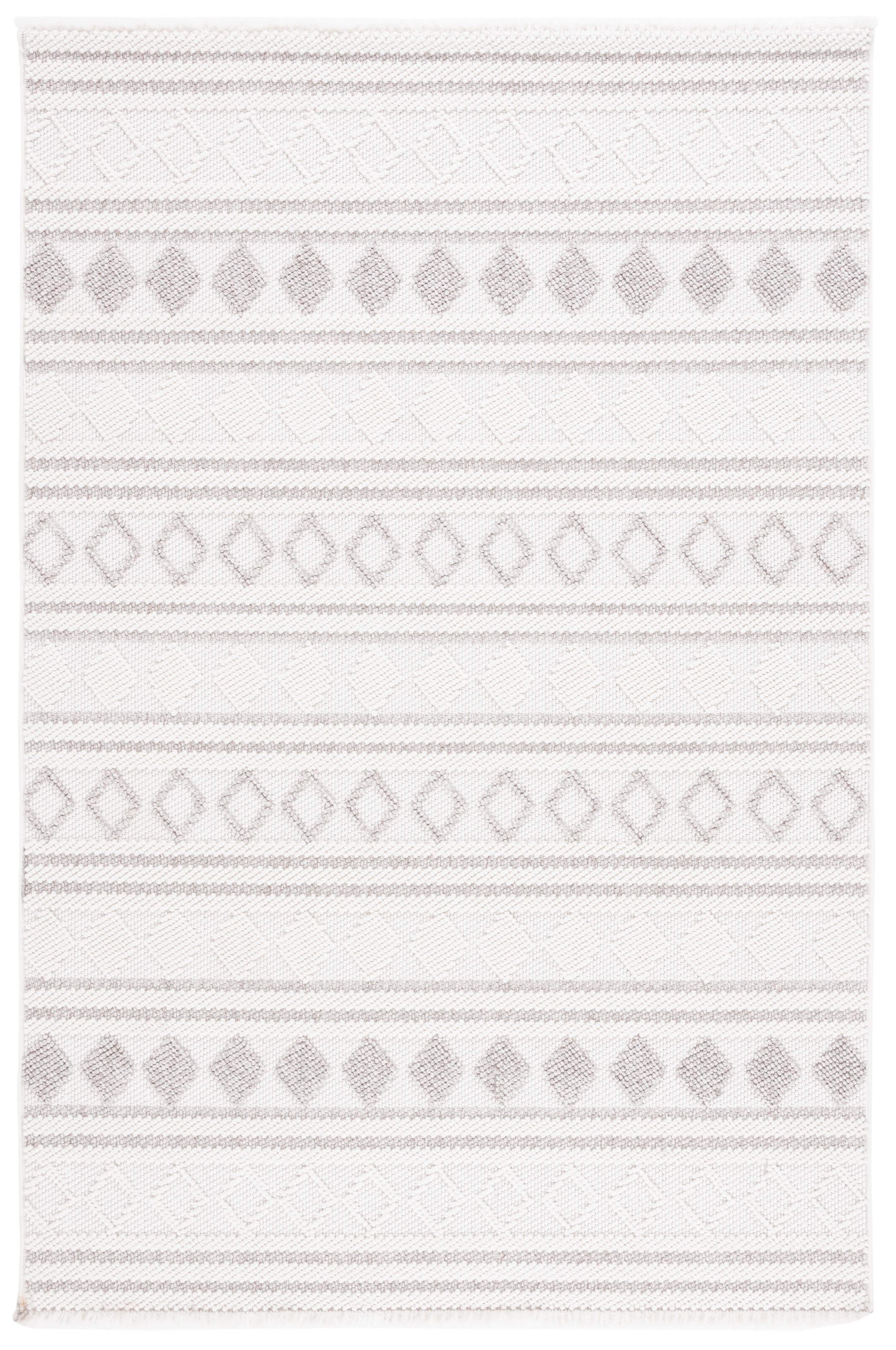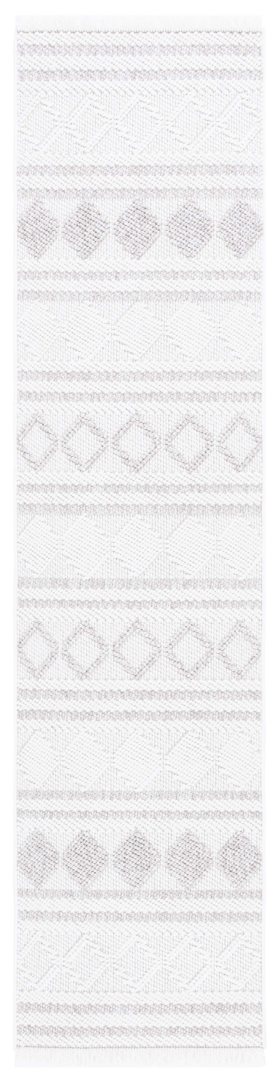 The rug showcases a serene pattern that combines repeating geometric diamond motifs with textured stripes, creating a sophisticated yet approachable aesthetic. Its ivory and beige colors offer a neutral palette that complements a wide range of interior designs, from minimalist to more elaborate themes.