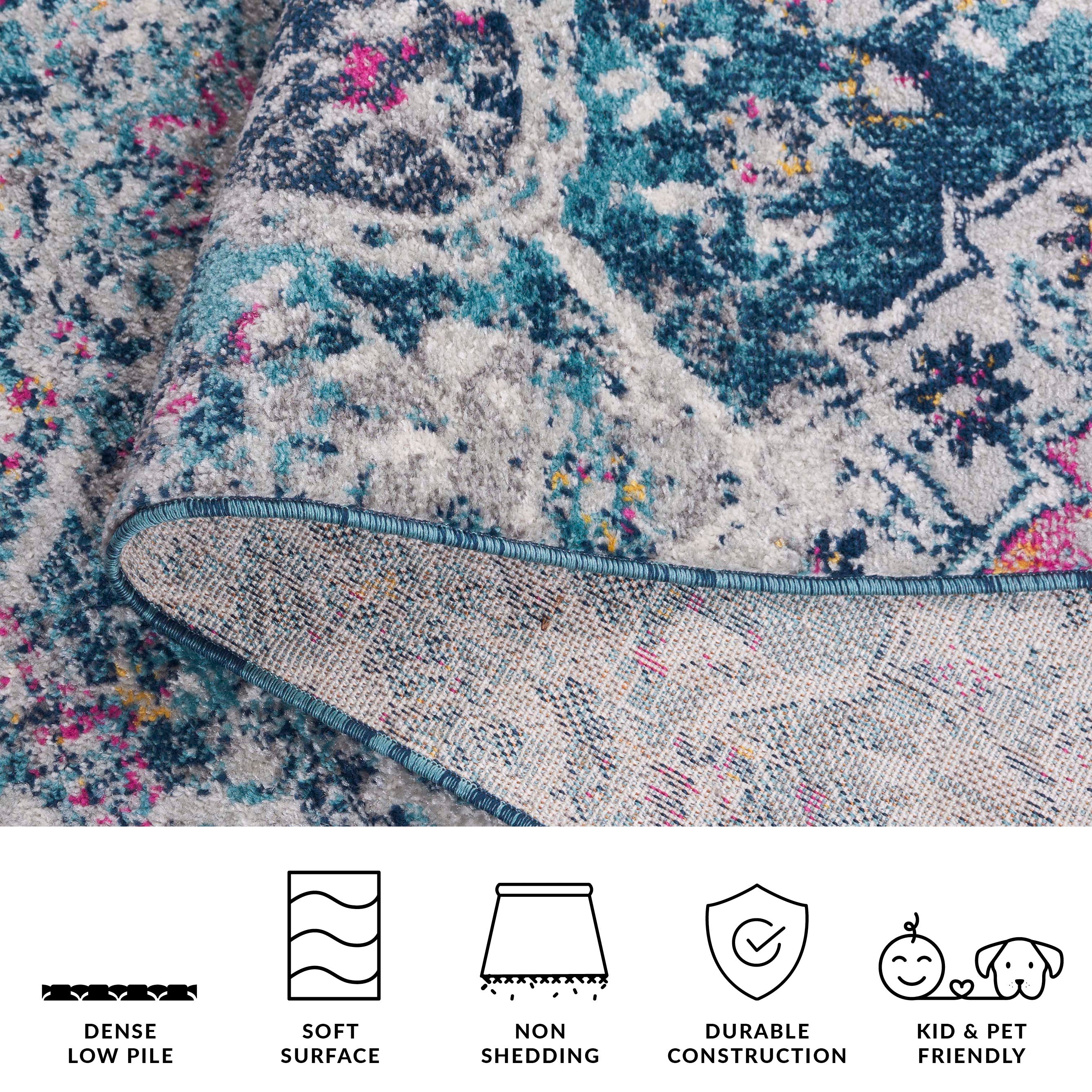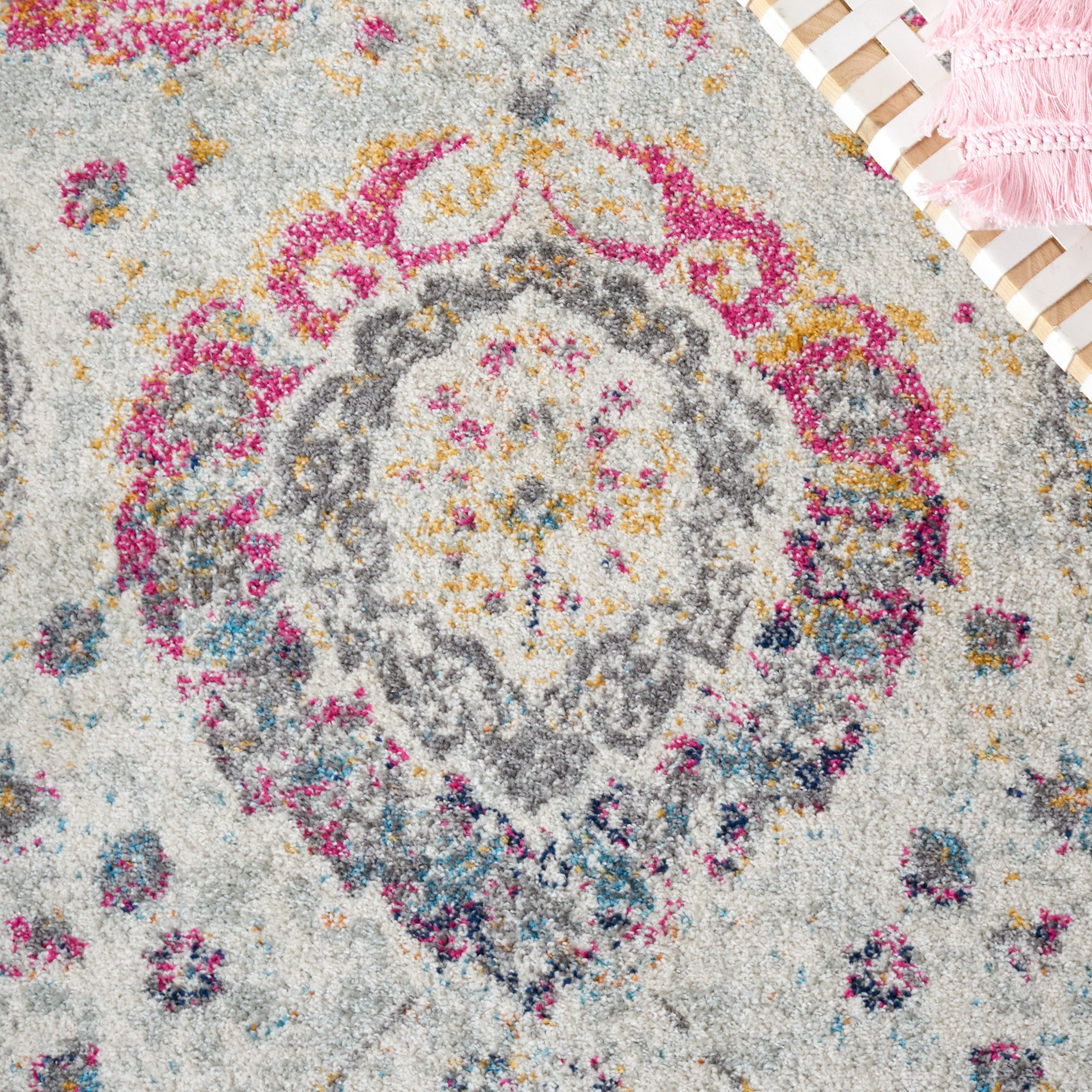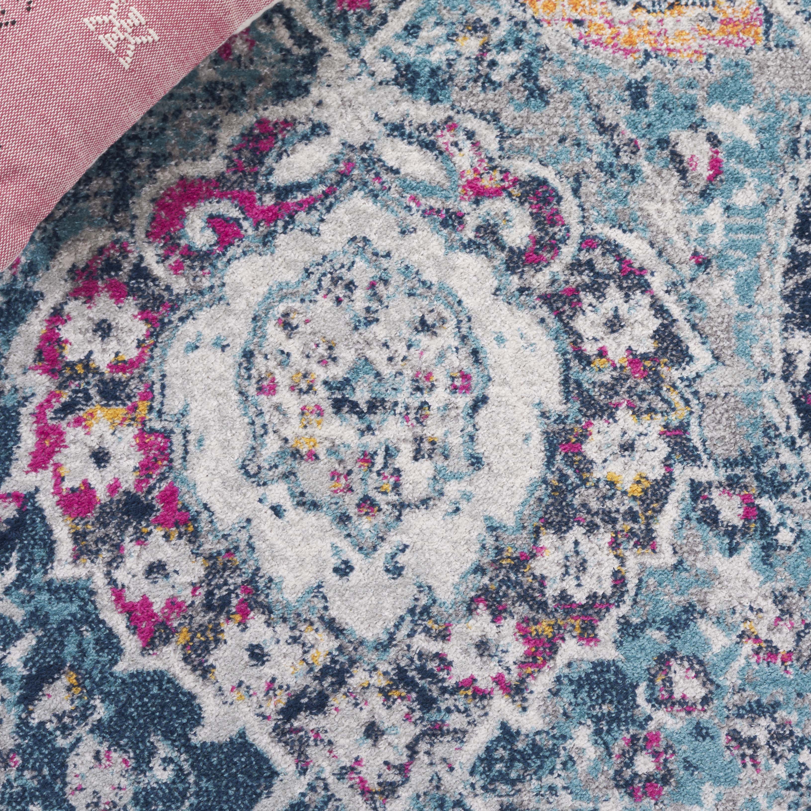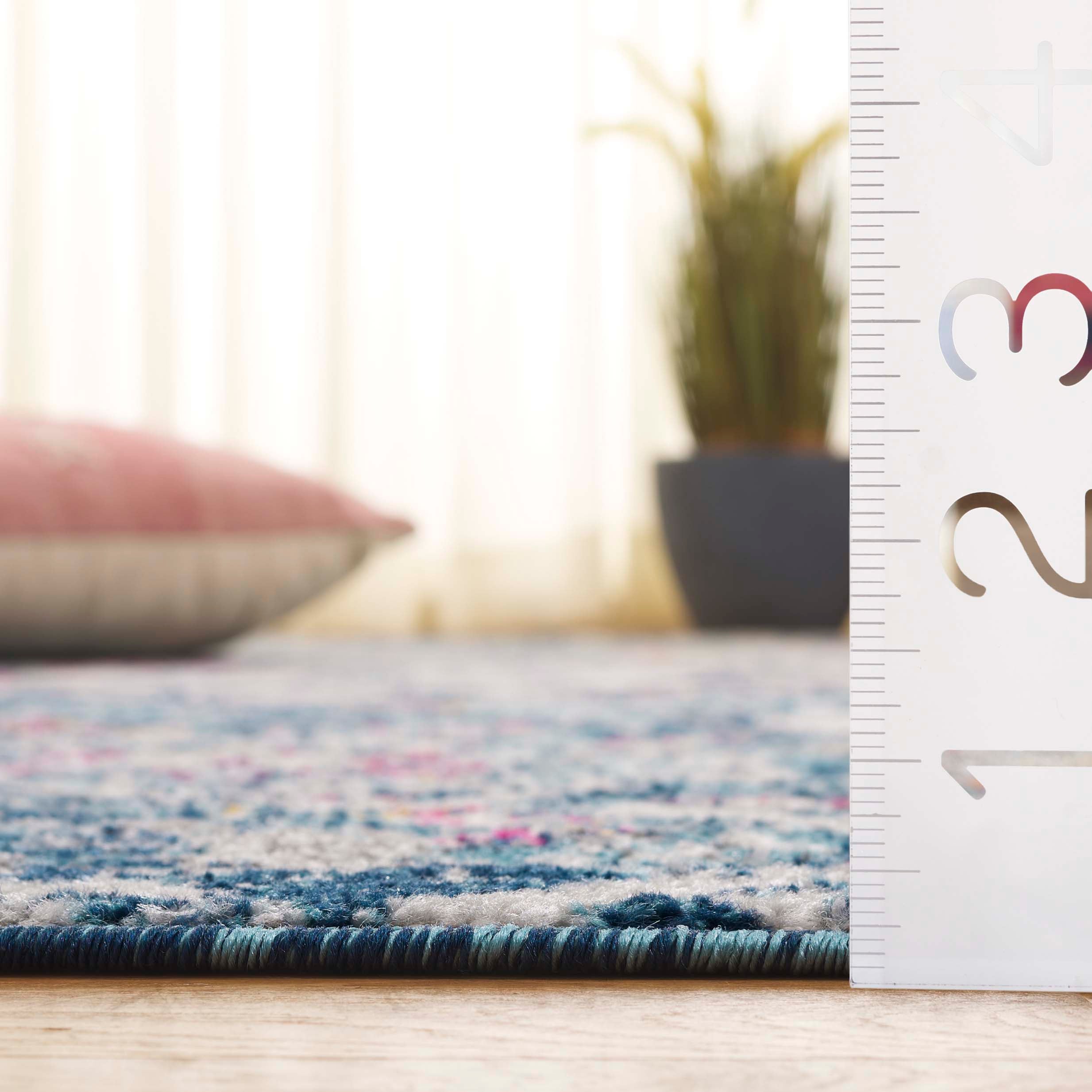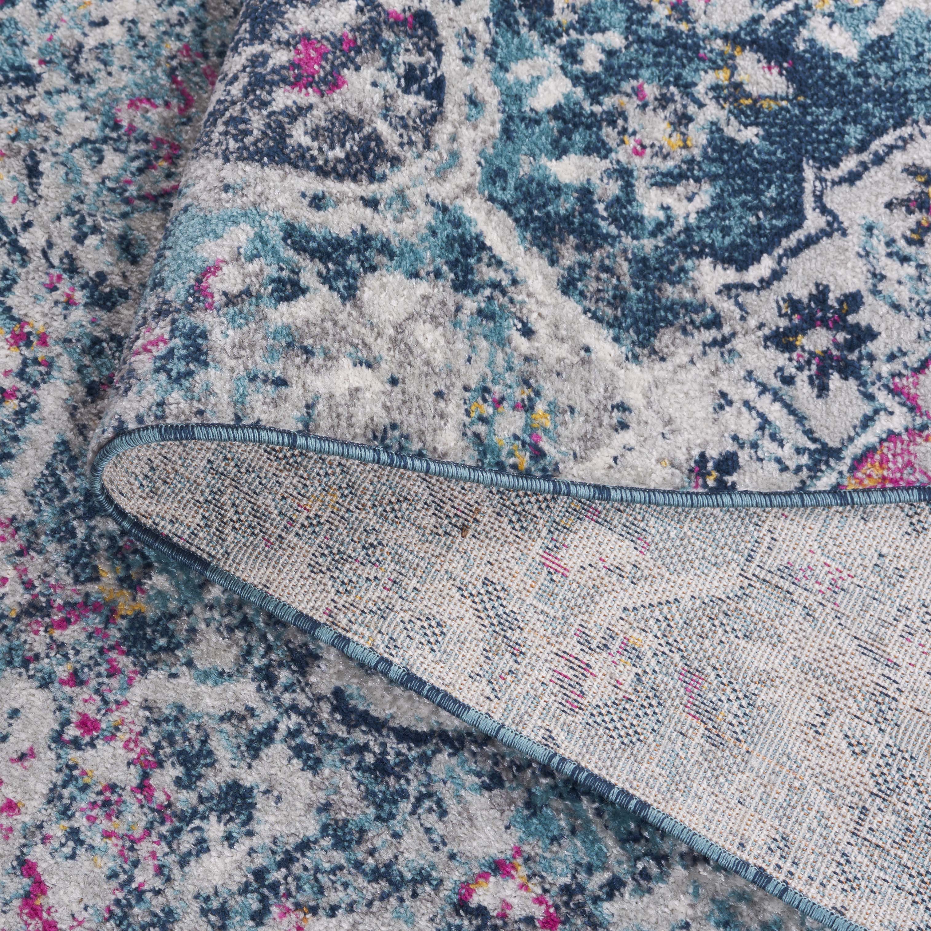 The rug features a captivating pattern, which showcases an intricate arrangement of floral and scrolled motifs, harmoniously blending classic charm with a modern color palette. Each design element has been meticulously woven using a resilient blend of materials - 65% polypropylene, 21% jute, 7% polyester, and 7% cotton - ensuring a product that's not only beautiful but also hard-wearing and easy to maintain.