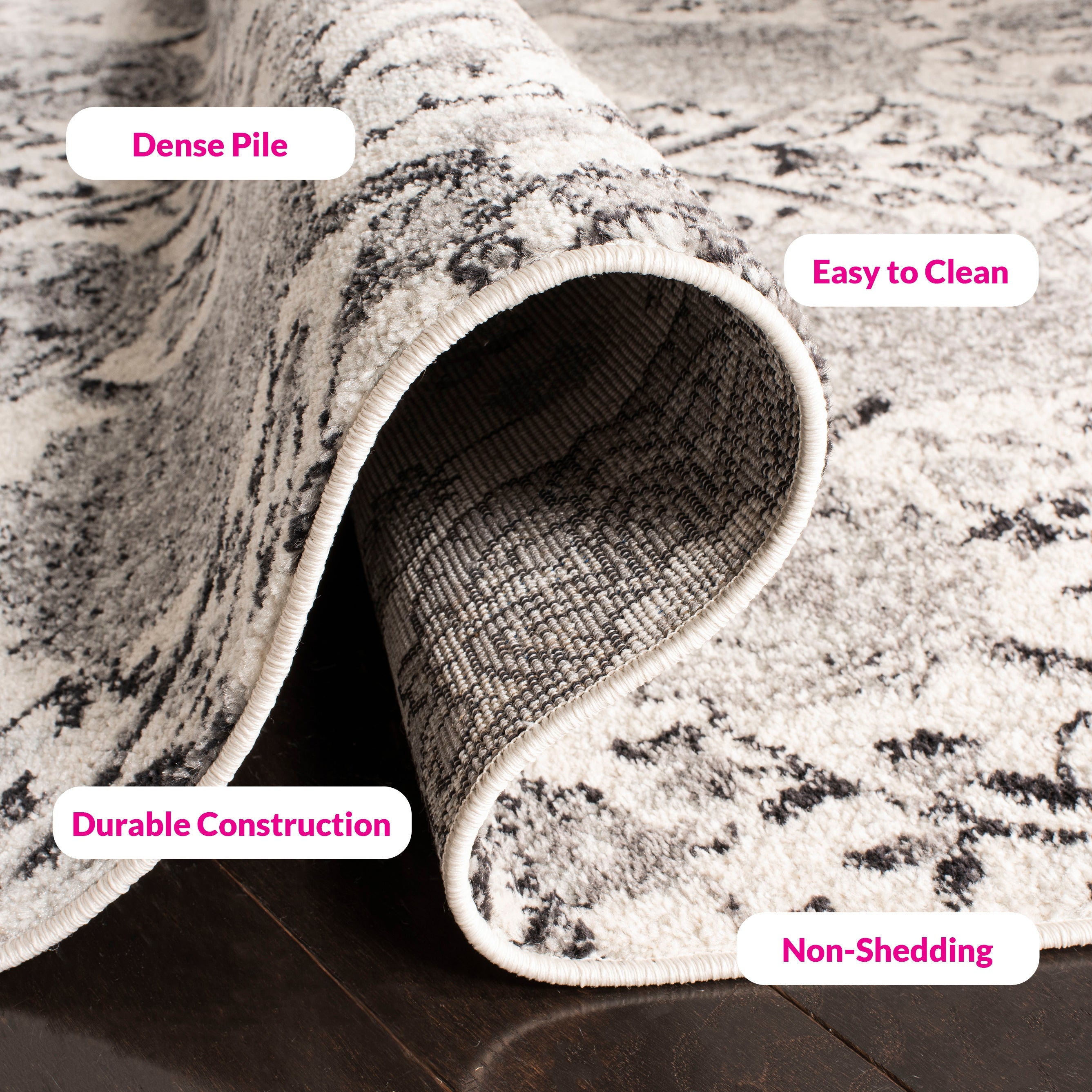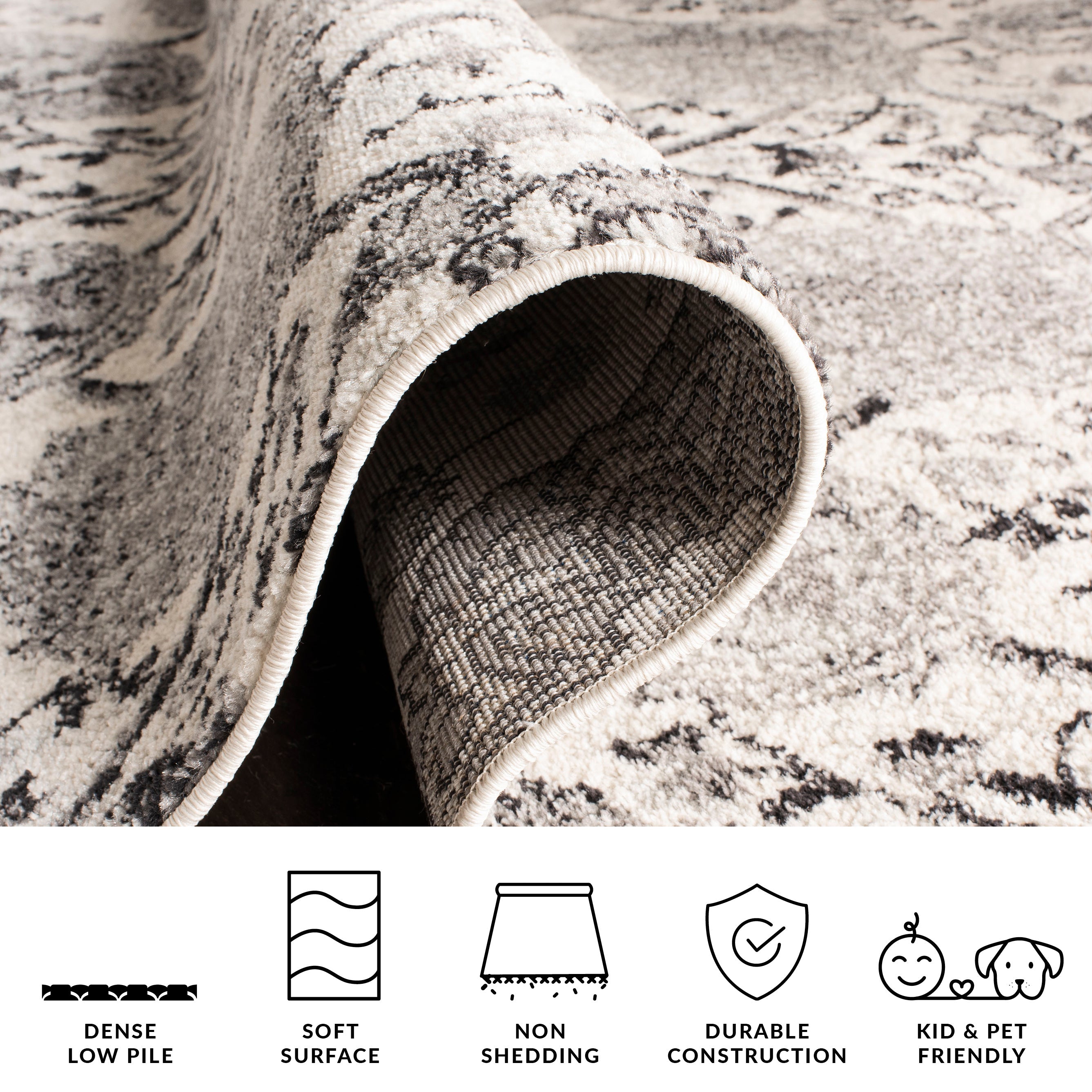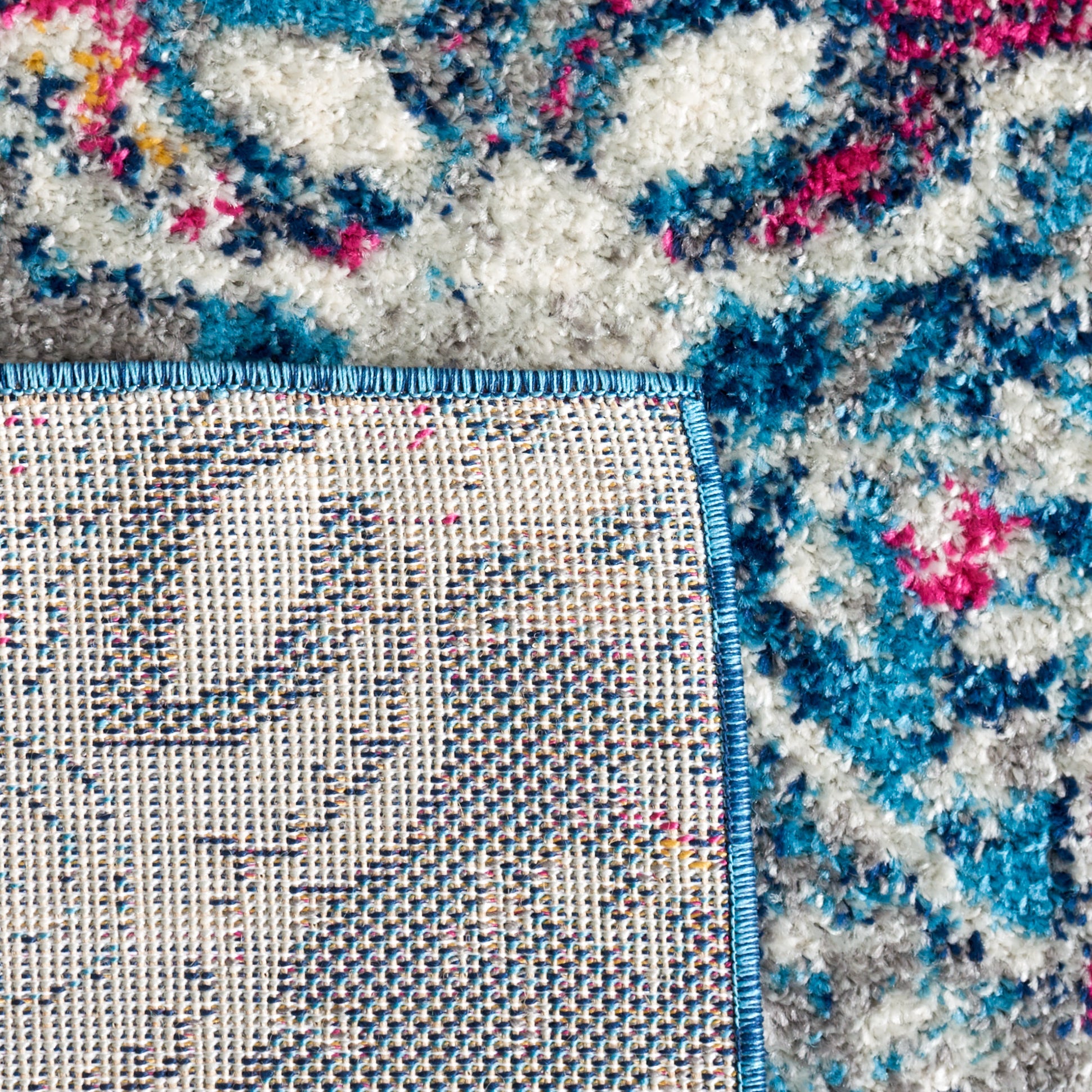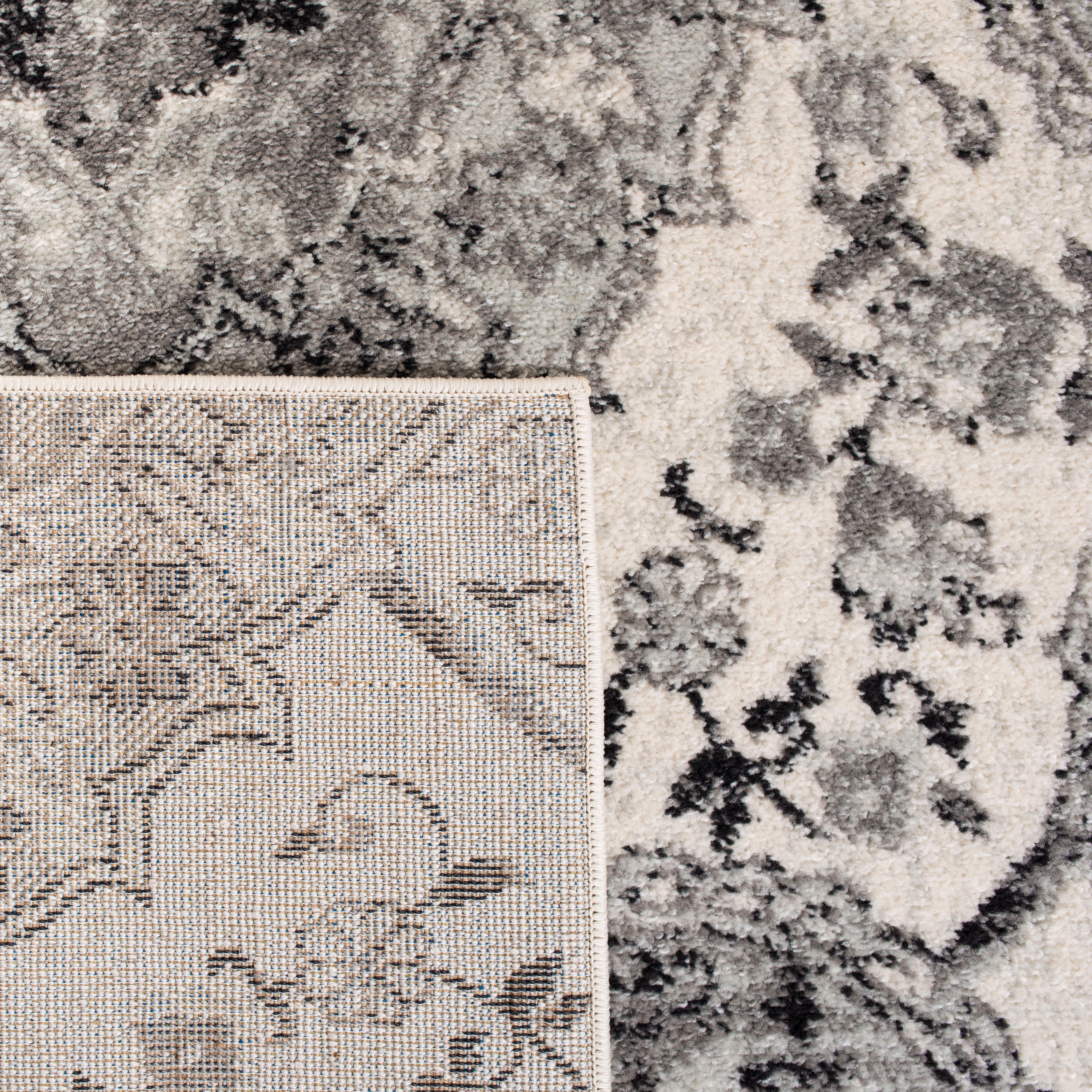 The rug features a captivating pattern, which showcases an intricate arrangement of floral and scrolled motifs, harmoniously blending classic charm with a modern color palette. Each design element has been meticulously woven using a resilient blend of materials - 65% polypropylene, 21% jute, 7% polyester, and 7% cotton - ensuring a product that's not only beautiful but also hard-wearing and easy to maintain.