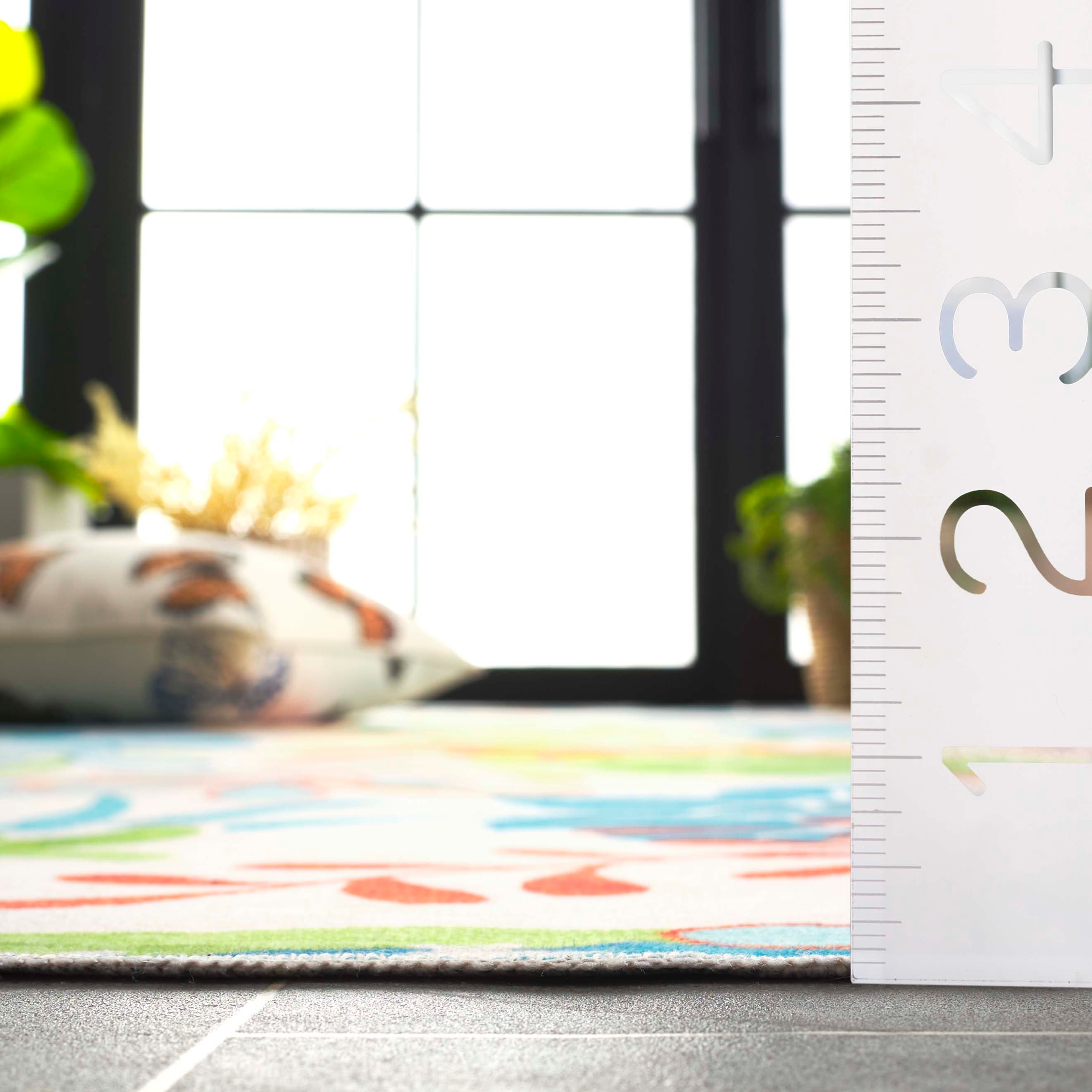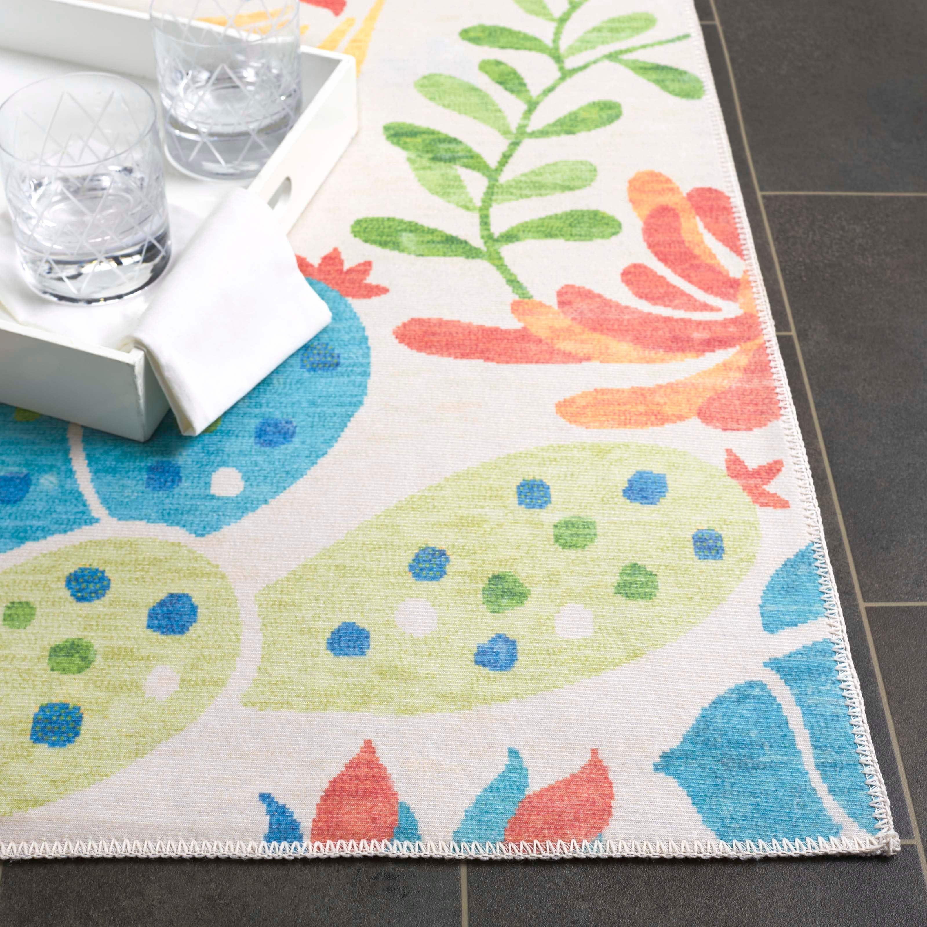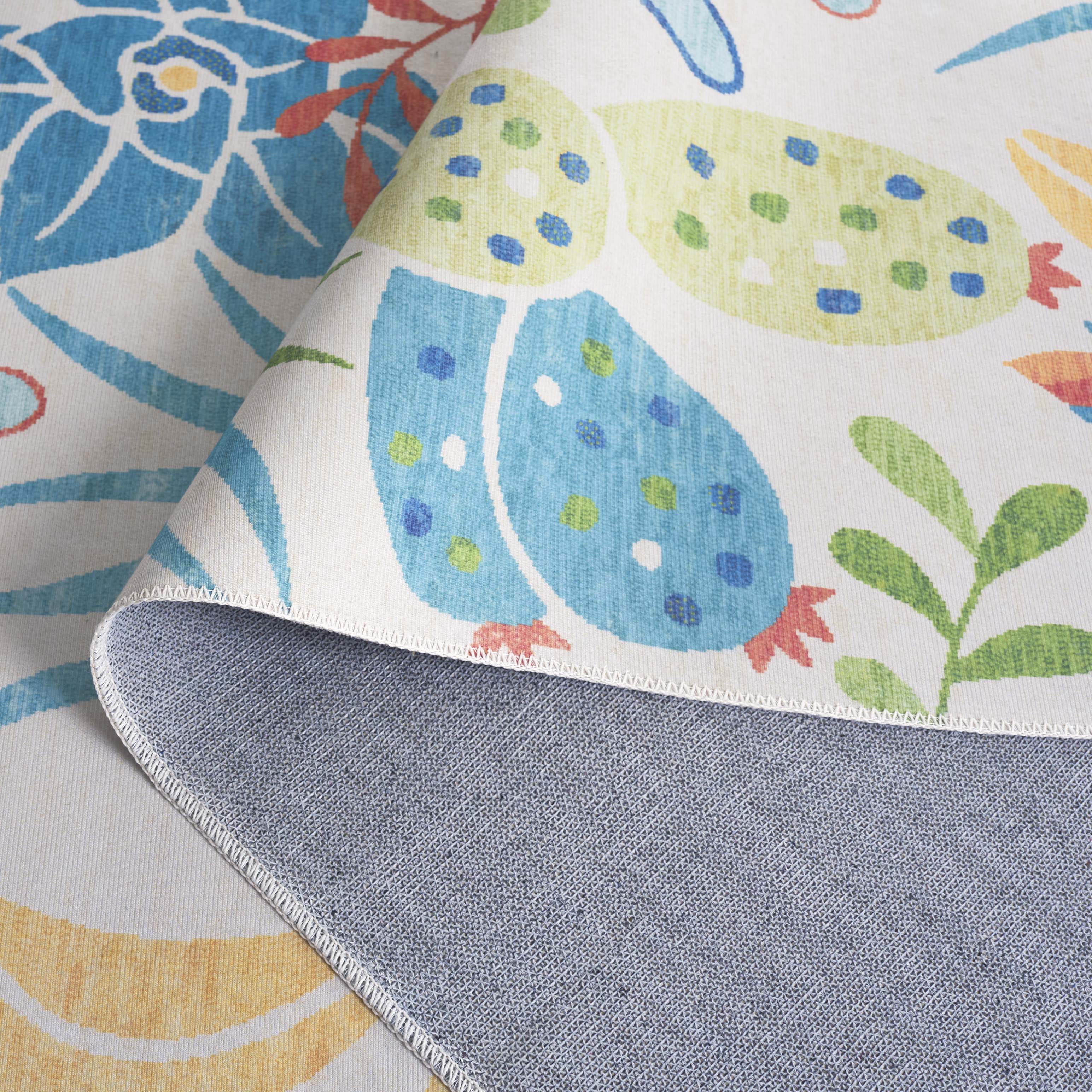 Its construction from durable polyester ensures a design that's both washable and slip-resistant, offering practicality alongside its decorative appeal. The delightful pattern portrays a whimsical botanical array, adding a dash of nature-inspired aesthetics to the rug's modern style.
