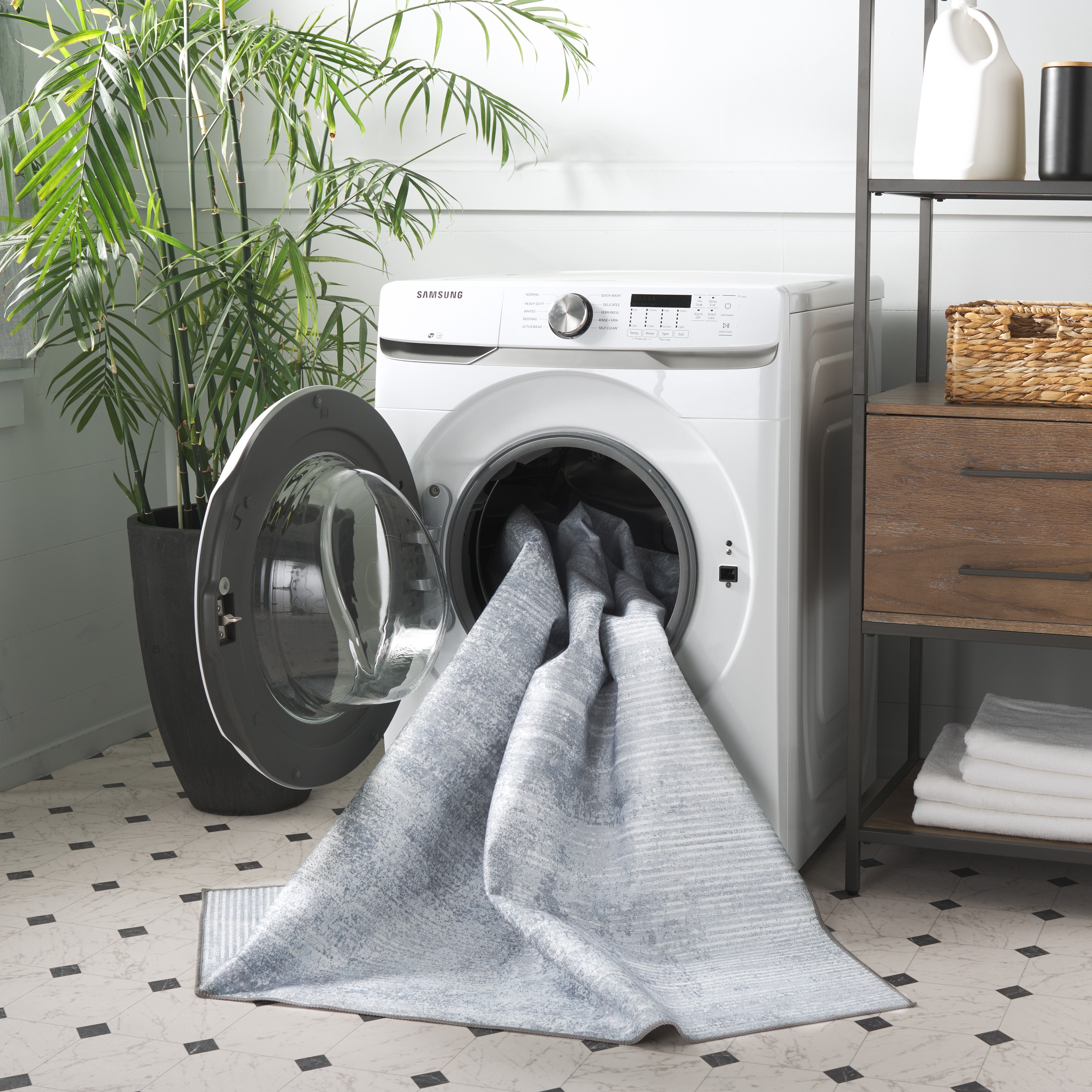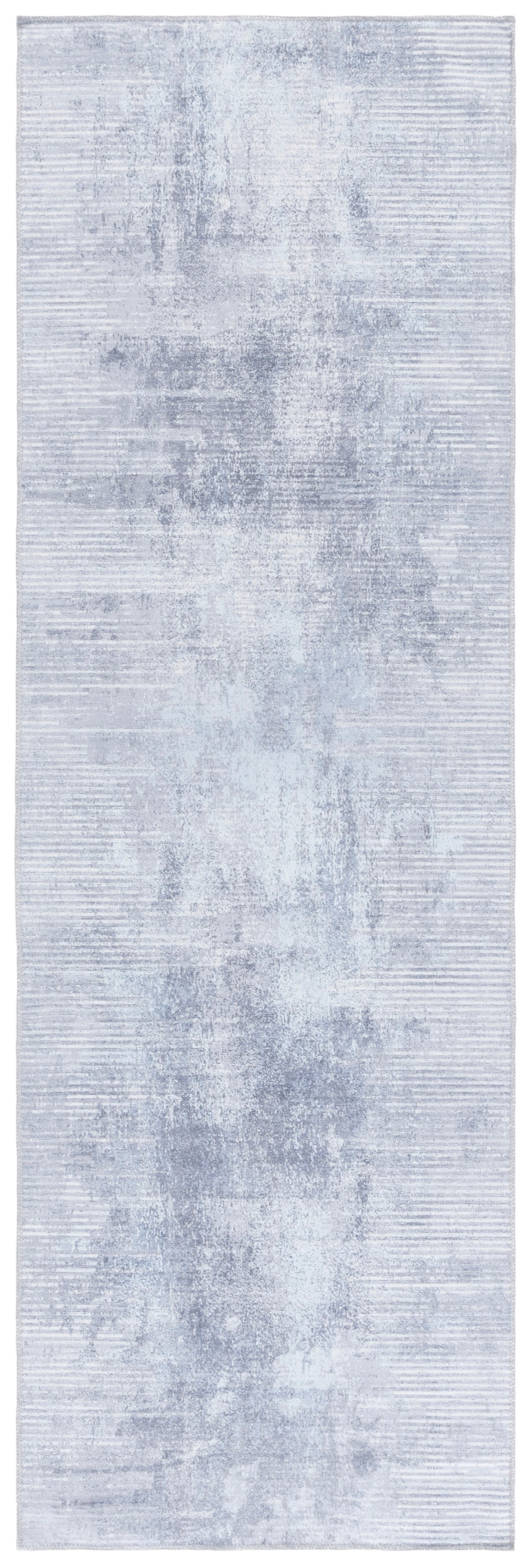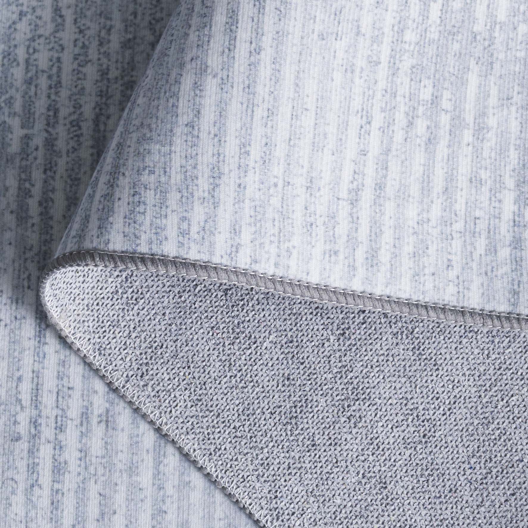Featuring a slip-resistant design, this rug ensures safety and comfort, allowing you to step with confidence. The distinct pattern, reminiscent of abstract brush strokes in varying shades of grey, adds depth and texture, effortlessly complementing your existing decor.