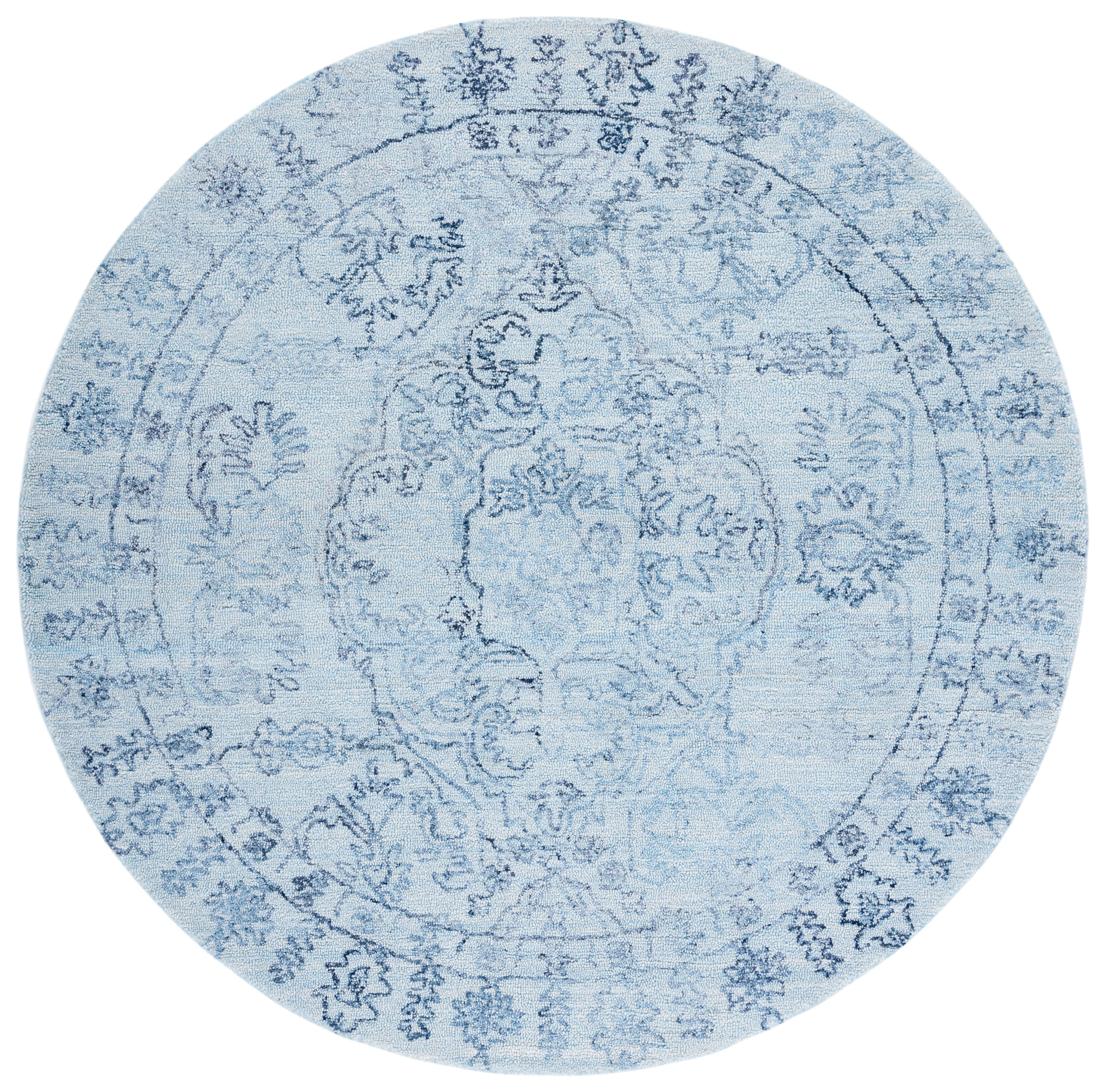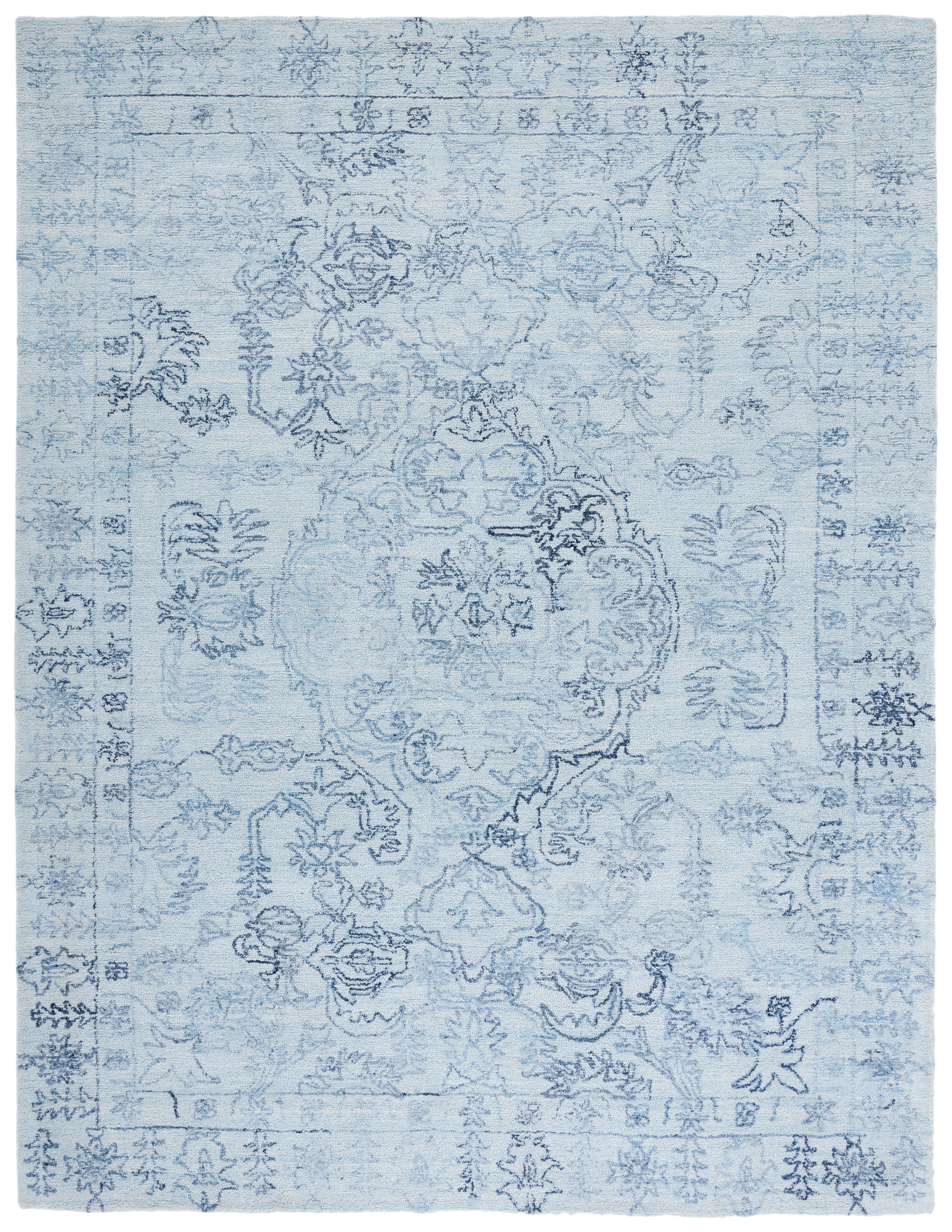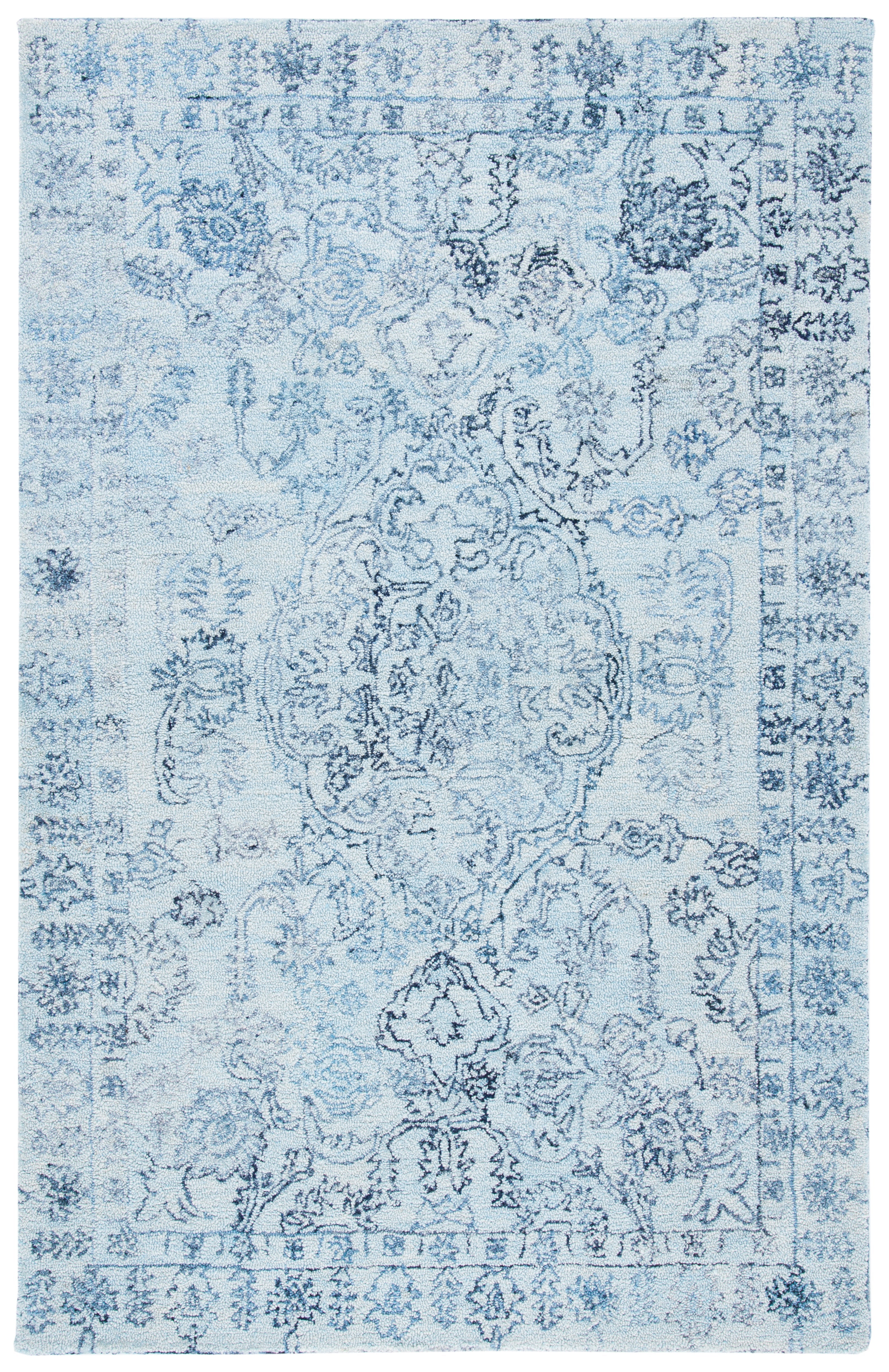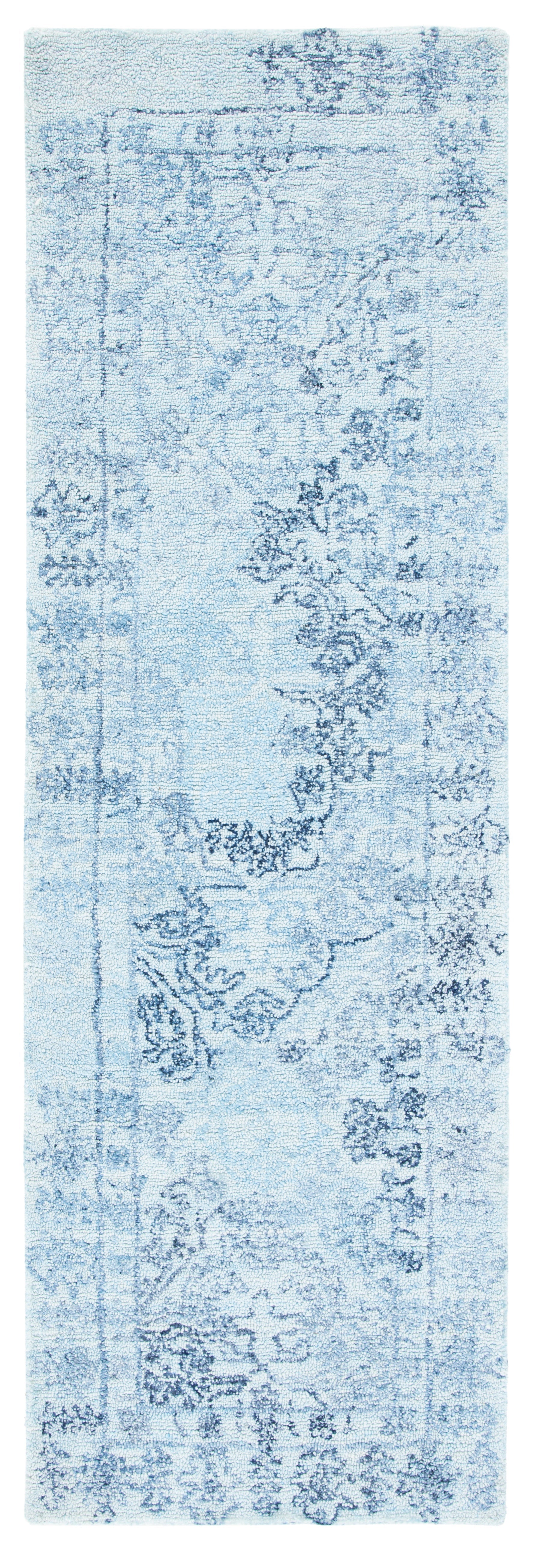 Delight in the tranquil beauty of light blue infused with navy accents, a color palette that brings a calming presence to any room. The rug's intricate patterns, reminiscent of timeless transitional styles, draw inspiration from classic motifs, harmoniously blending the old with the new to create a sense of balance and elegance.