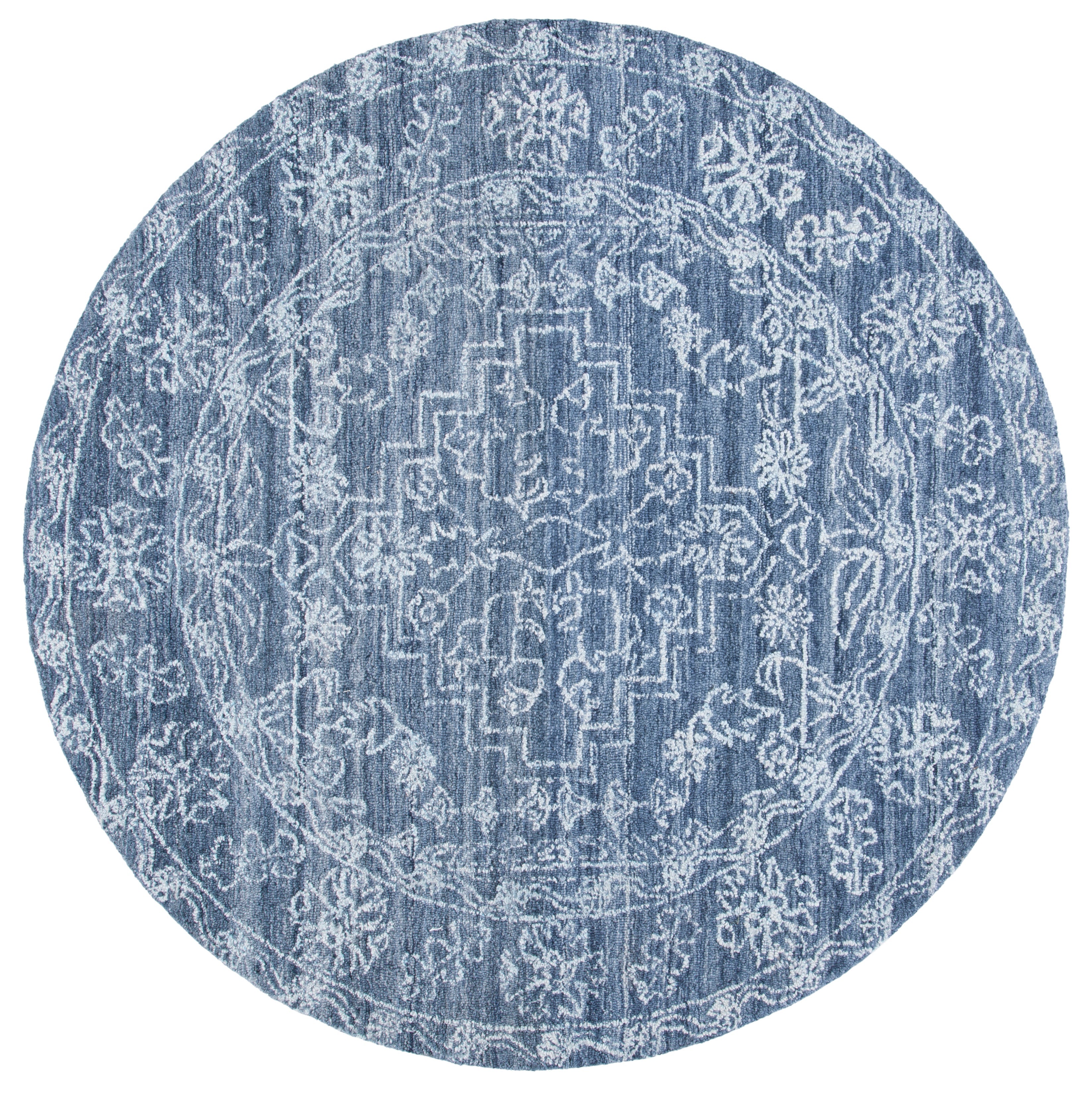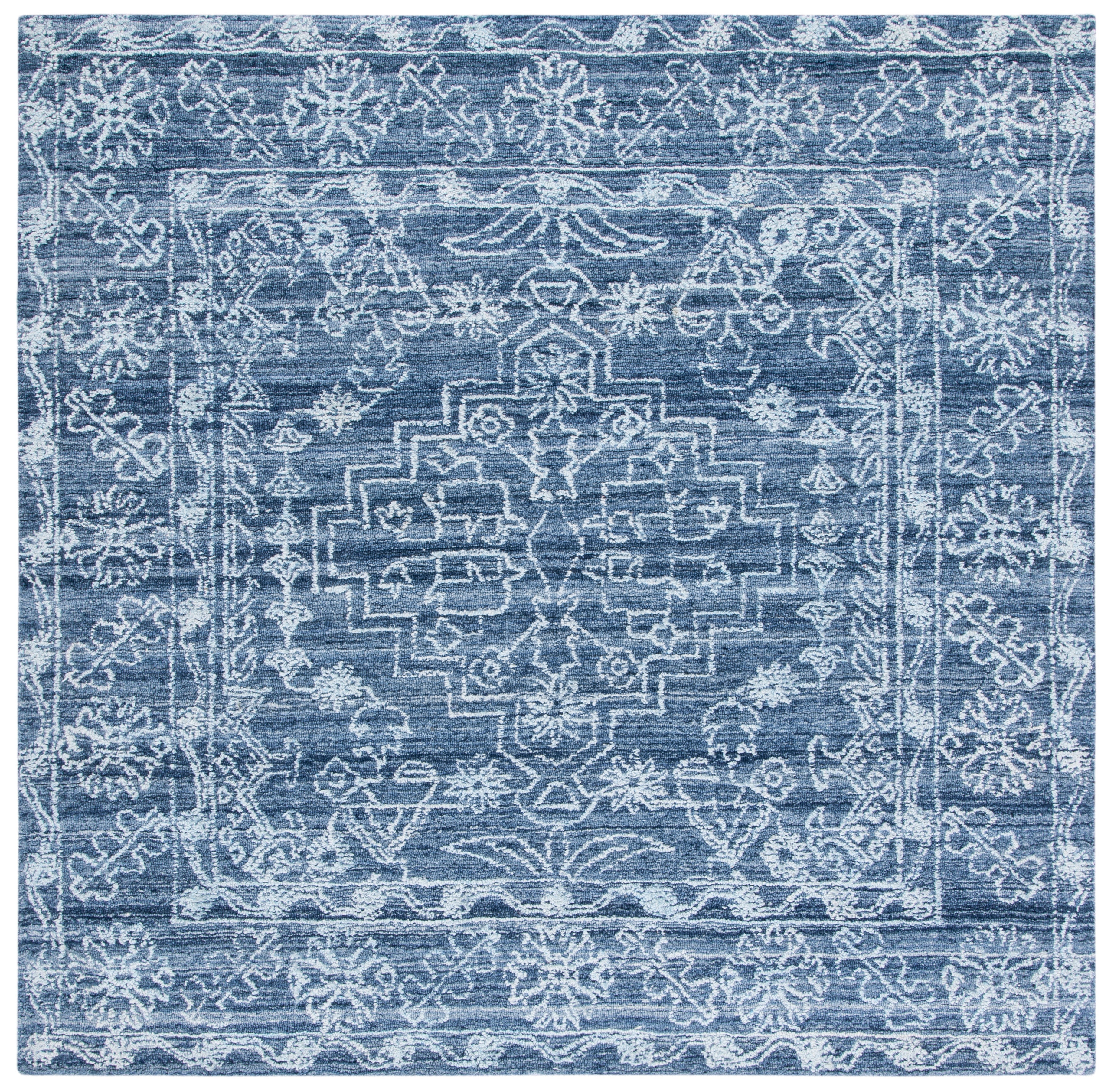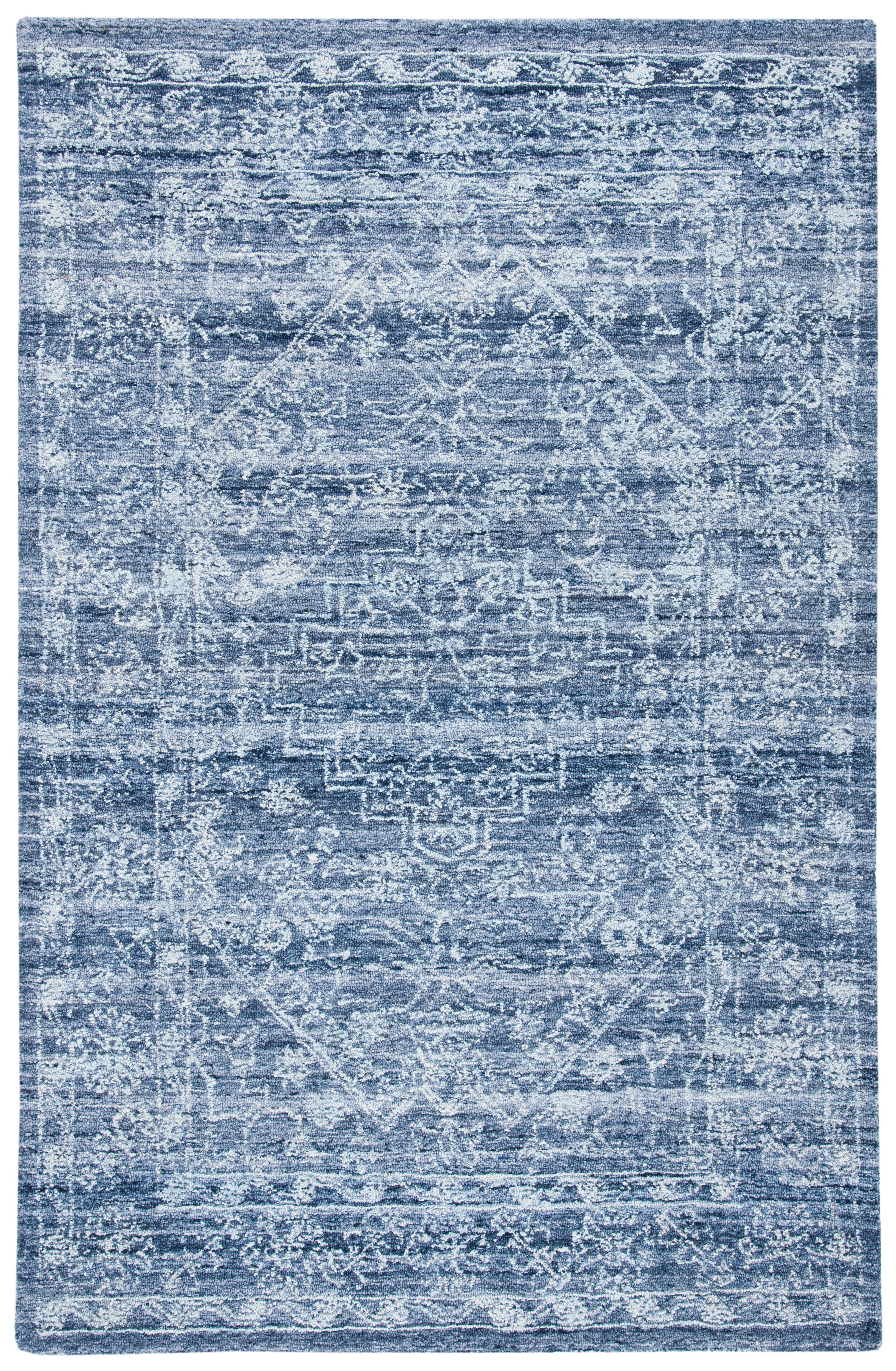 Crafted in India, a country renowned for its rich history in textile artistry, this rug showcases an exquisite navy palette that evokes the depth of the night sky. The pattern portrayed in the image perfectly encapsulates a sense of timelessness with a modern twist, making it an ideal complement to both classic and contemporary interiors.