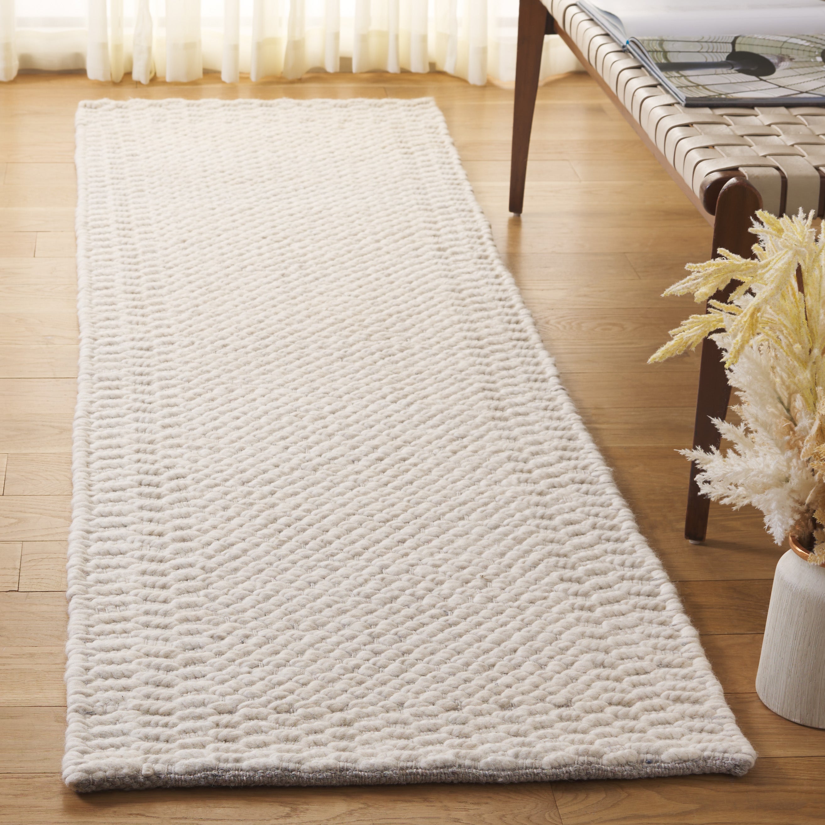 Transform your hallway with this elegant runner rug. Sized at 2 ft 3 in by 8 ft, its ivory hue brings a subtle sophistication to any space. Hand loomed in India, this rug combines 90 percent wool and 10 percent cotton, offering a soft texture with a geometric pattern for visual interest. The solid tonal style complements both modern and traditional decor, while its 3/4 inch height adds a touch of warmth underfoot. Ideal for high traffic areas, this rug effortlessly blends durability with style, making it a striking addition to your home decor.