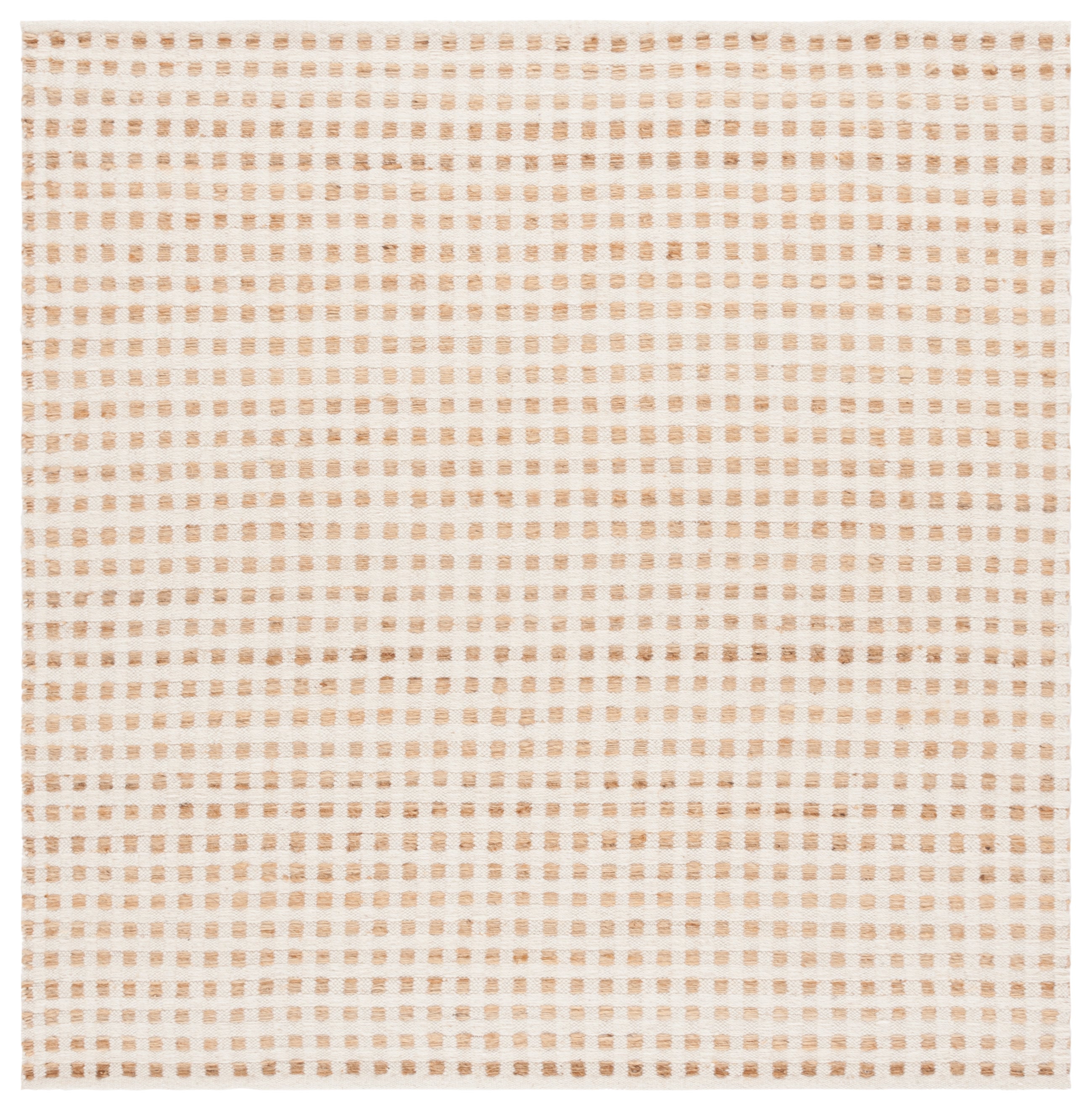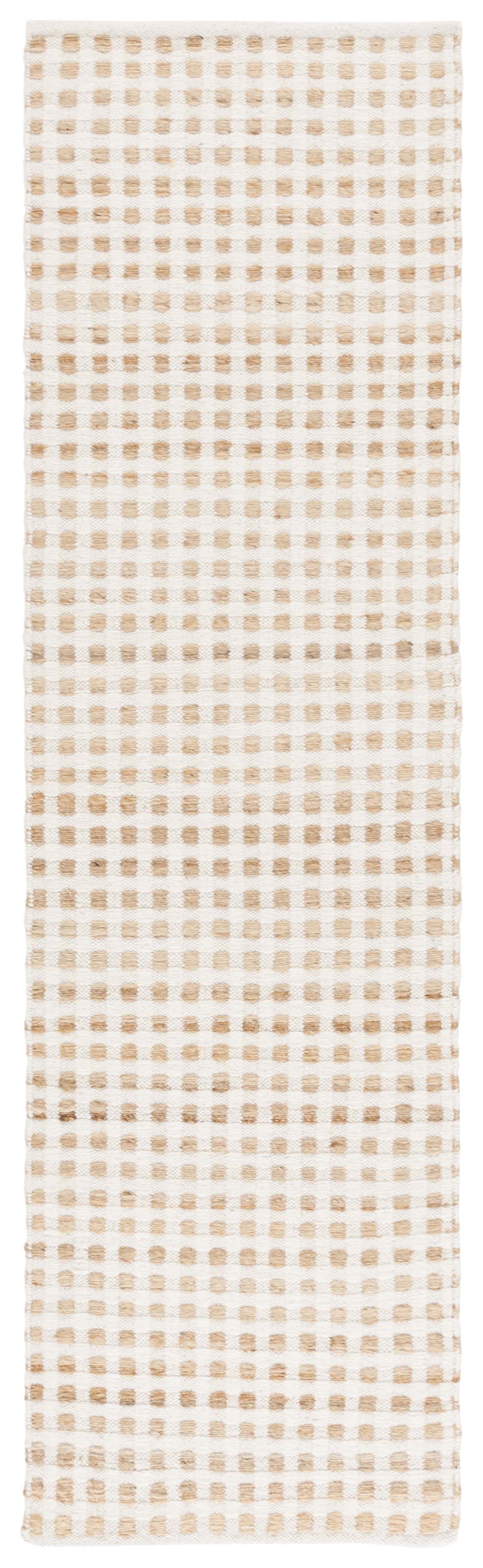 The runner's design features a distinct geometric pattern with repeating ivory motifs on a warm natural backdrop, providing a touch of elegance and modernity to your hallway or any long, narrow space. This exquisite piece is skilfully hand-woven using a 50/50 blend of resilient wool and natural jute, offering both durability and eco-friendly appeal.