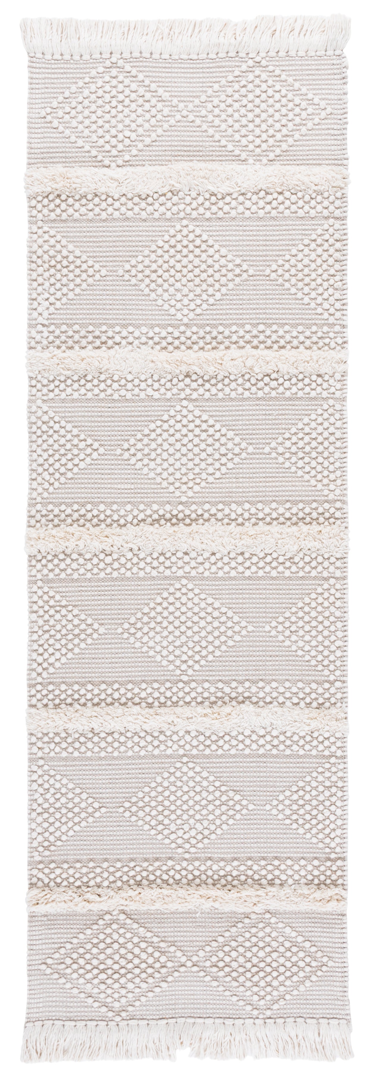 The Bohemian style of the rug embraces a laid-back yet sophisticated aesthetic, featuring a combination of natural and ivory hues. Its design weaves a story of cultural heritage with a series of repetitive geometric patterns and diamond motifs that draw the eye along its length. The rug's plush 3/4 inch pile height offers an inviting softness underfoot.