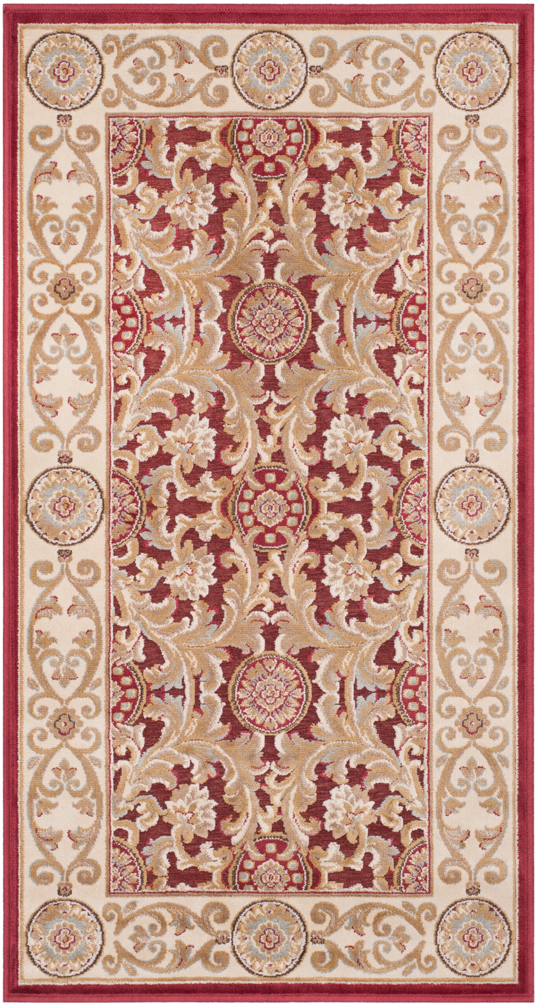 Adorned with a rich tapestry of red hues, the intricate pattern is a harmonious symphony of ornate medallions and timeless florals, surrounded by a serene cream border that accentuates its grandeur. The classic motifs lend a sense of tradition and sophistication to any room, making it a versatile addition that complements both contemporary and classical decor.