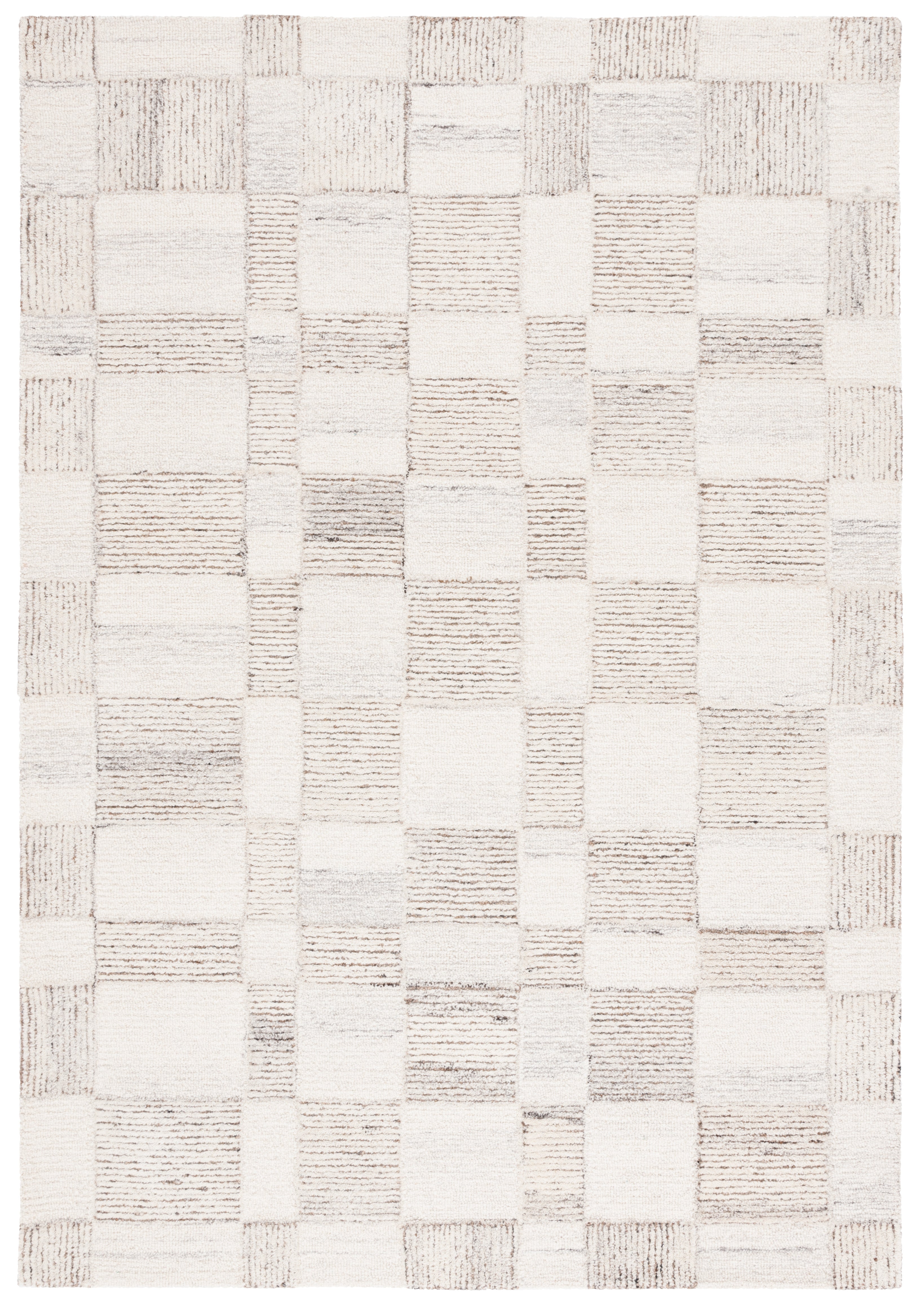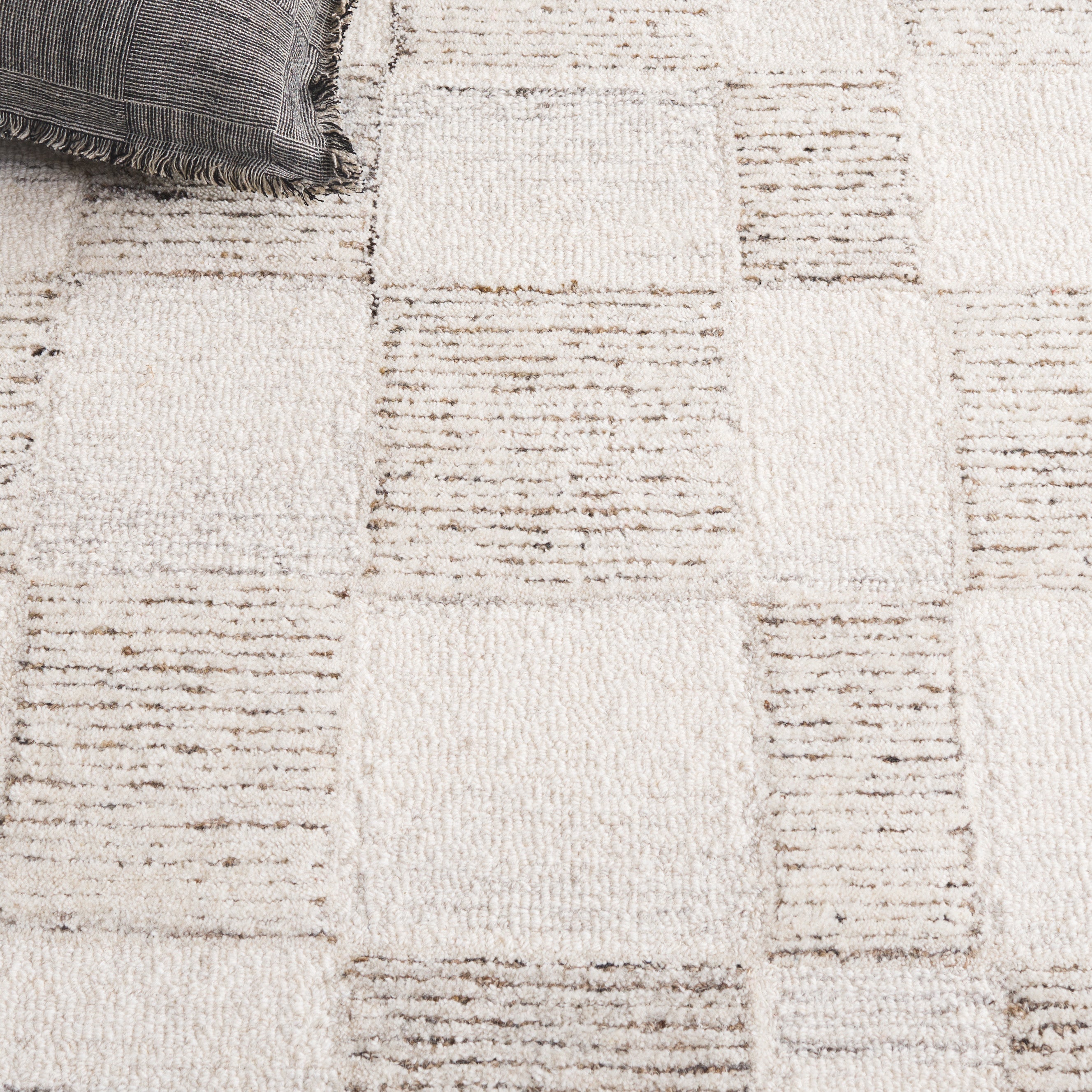 Featuring a striking pattern, the rug weaves together varying textures and shades of beige and brown, creating a mesmerizing grid-like design that captivates and adds depth to any space. The half-inch pile height offers a delightful underfoot experience, balancing comfort with easy maintenance.